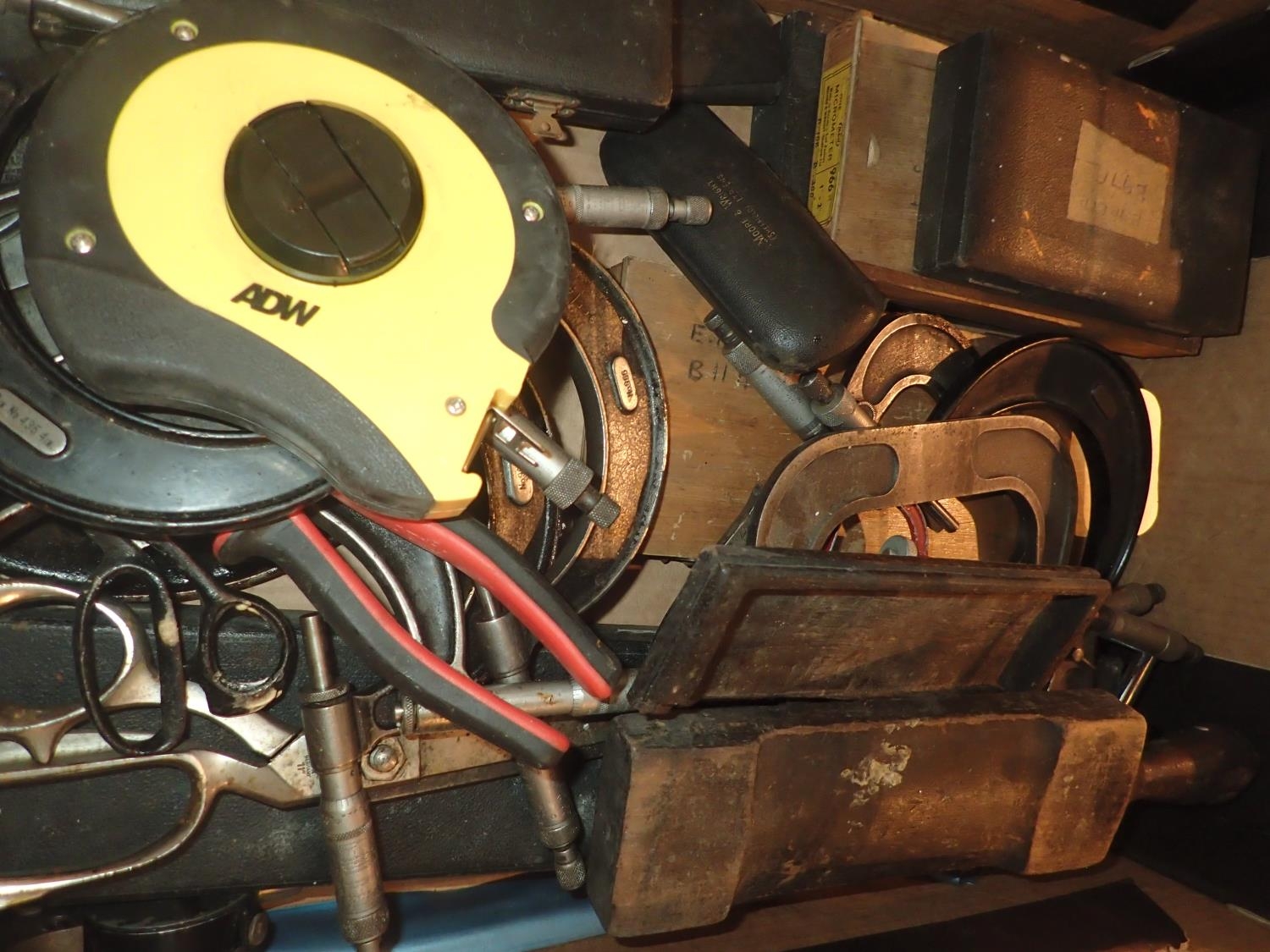 Box of mixed tools to include clamps, 30m measuring tape, micro meter etc. Not available for in-house P&P, contact Paul O'Hea at Mailboxes on 01925 659133