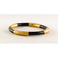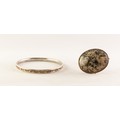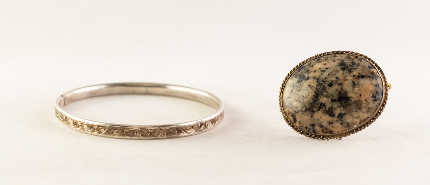 ENGRAVED SILVER HOLLOW BANGLE, Chester 1938, 0.5cm wide and a cabochon hardstone BROOCH, 1 1/2in wide (2)