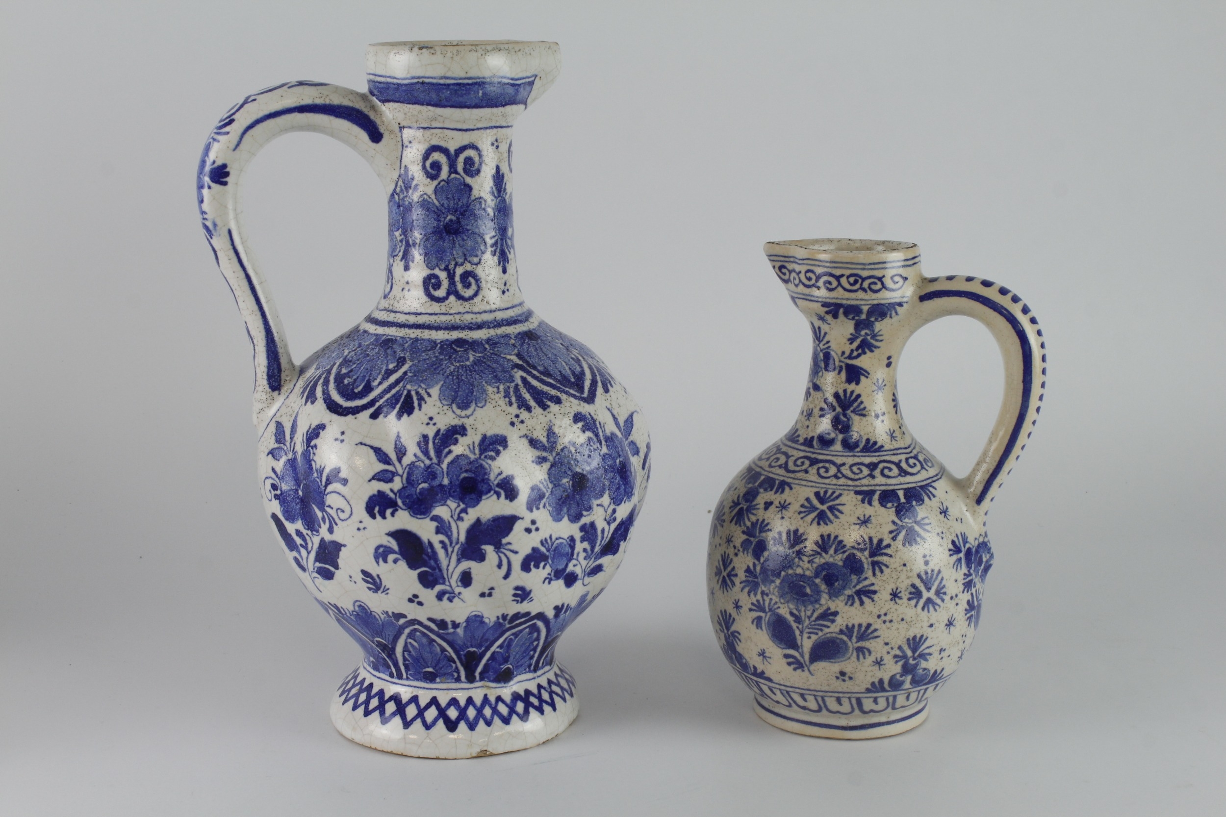 Delft. Two large blue & white jugs / ewers (one marked 'Delft' to base), tallest 30cm approx.