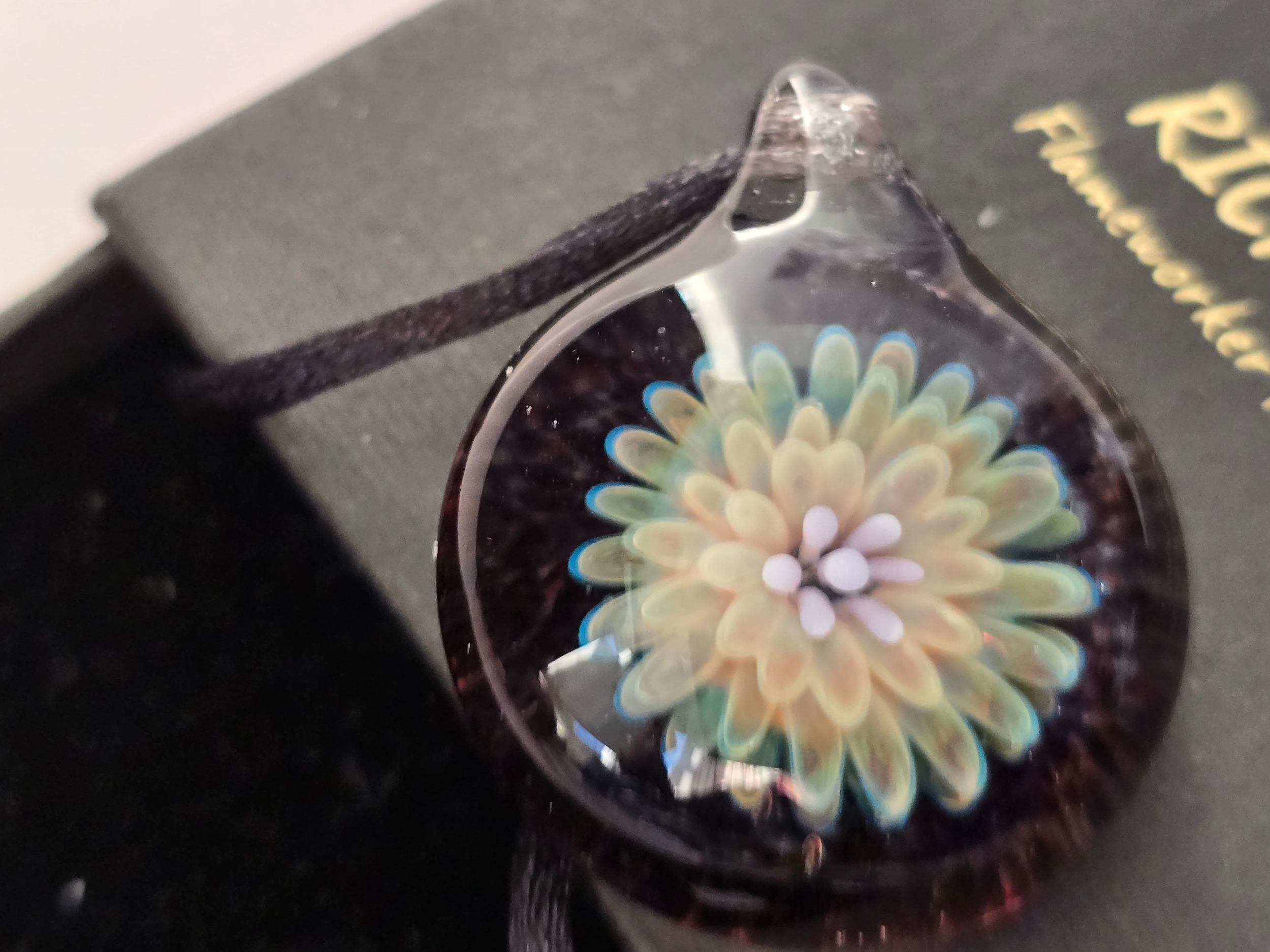Pendant/necklace Paperweight glass jewellery/jewelry. Attractive flameworked piece hand-made by Rich Evans, Stourbridge. Inc. neckstrap.Excellent condition. 31mm across