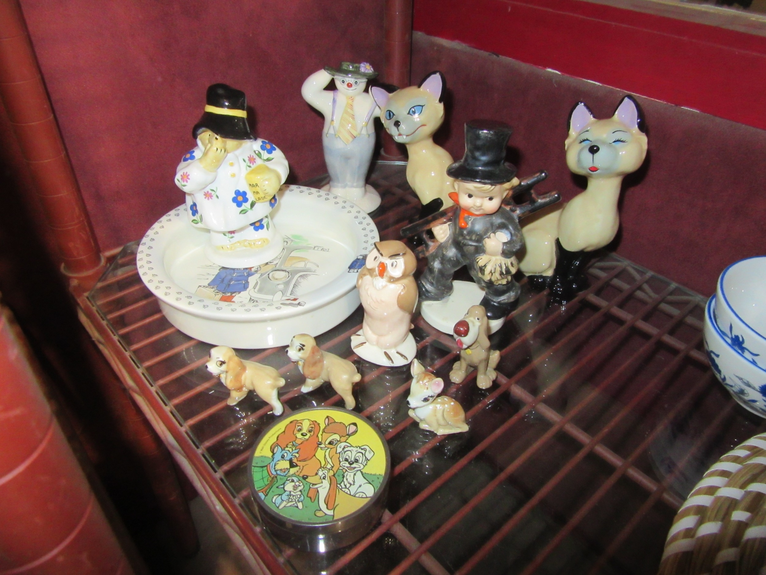 A selection of ceramics including Wade Whimsies and cats, Coalport Paddington Bear, Royal Doulton Snowman etc.
