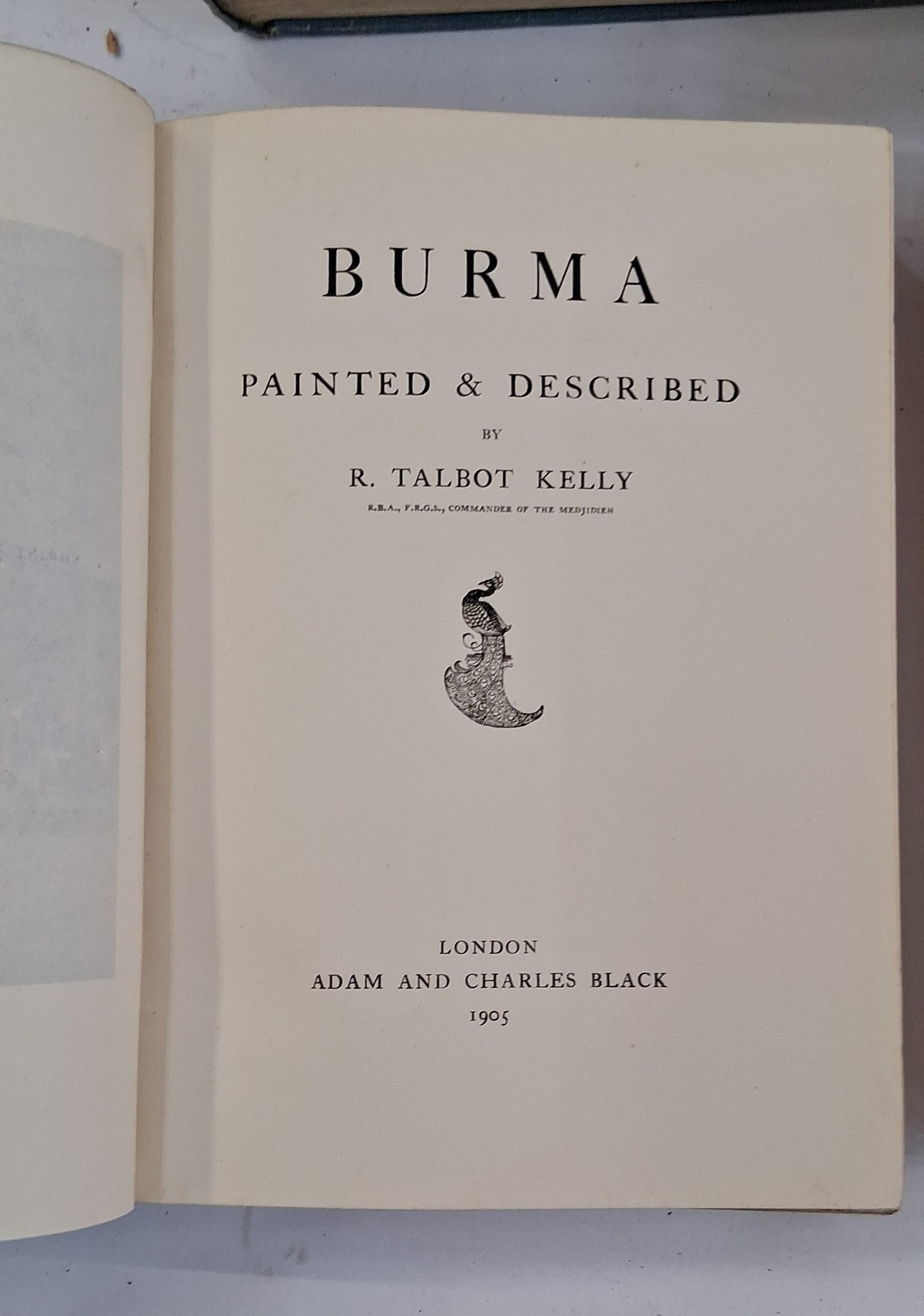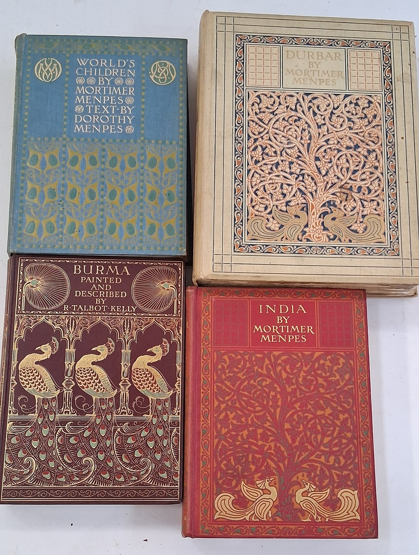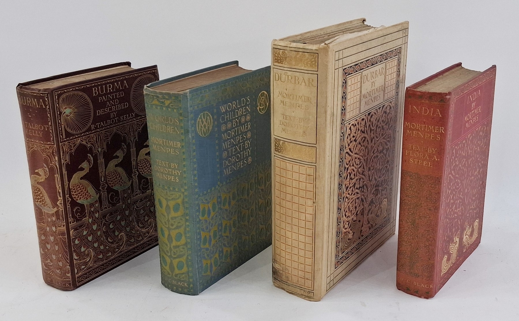 Menpes, Mortimer (ills) "The Durbar", text by Dorothy Menpes, Adam & Charles Black 1903, limited edition no.68/1000 copies signed by Mortimer Menpes, colour plates with lettered tissue guards, bkpl inside front board, decorated cloth and backstrip with gilt titles, front hinge is cracked, there is some staining and foxing to edges, silk ribbon marker, "India", text by Flora Annie Steel, Adam & Charles Black 1905, colour frontis, colour plates with lettered tissue guards, some foxing, offsetting to ffep, red decorated cloth with gilt titles and decorations, foxing to the front edge, "Worlds Children", Adam & Charles Black 1903, colour frontis, colour plates with lettered tissue guards, some foxing, blue decorated cloth and Talbot, Kelly R "Burma - Painted and Described by ...", Adam & Charles Black 1905, colour plates with lettered tissue guards, bkpl inside front board, lavishly decorated pictorial front board and backstrip (4)
