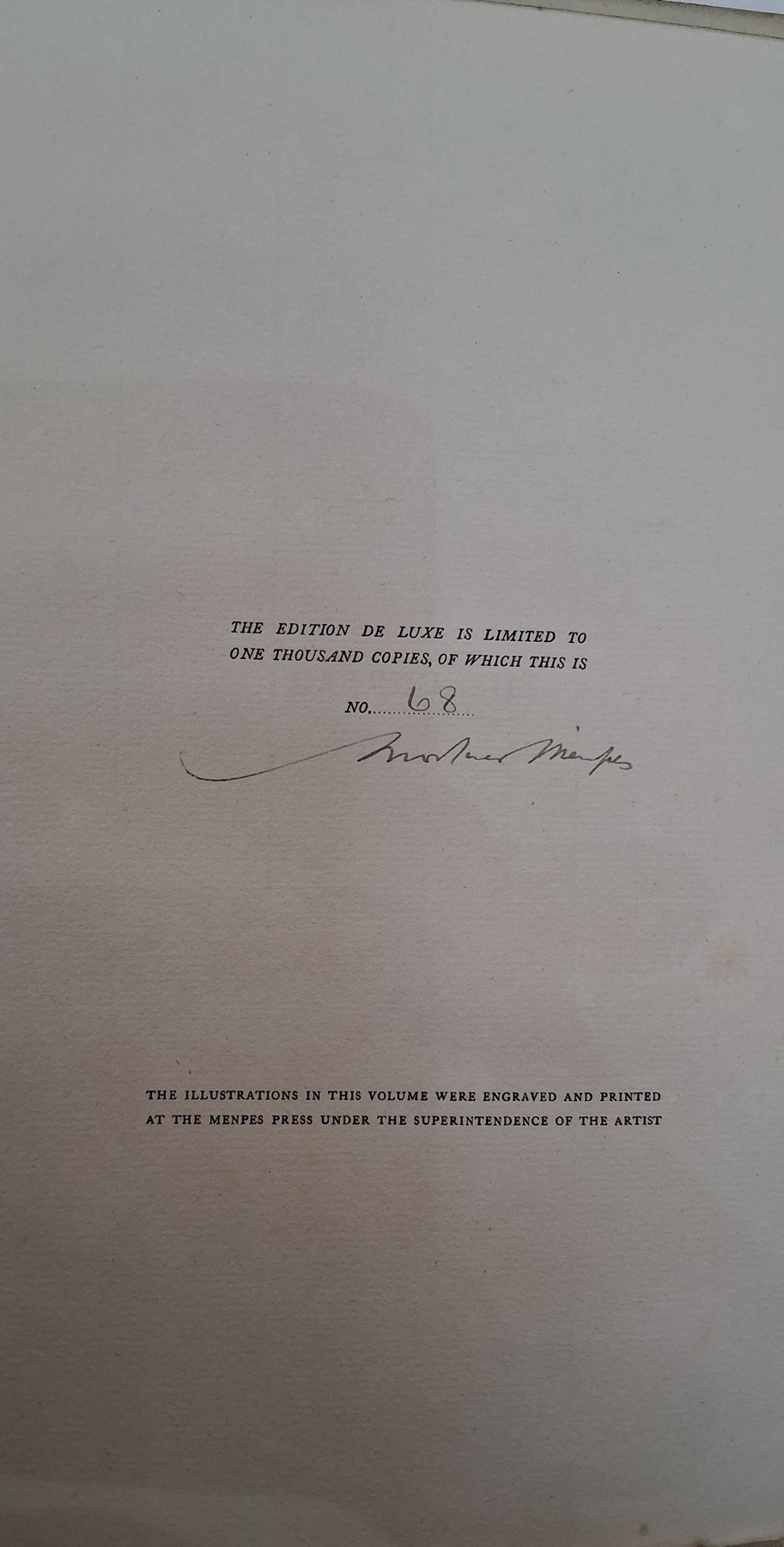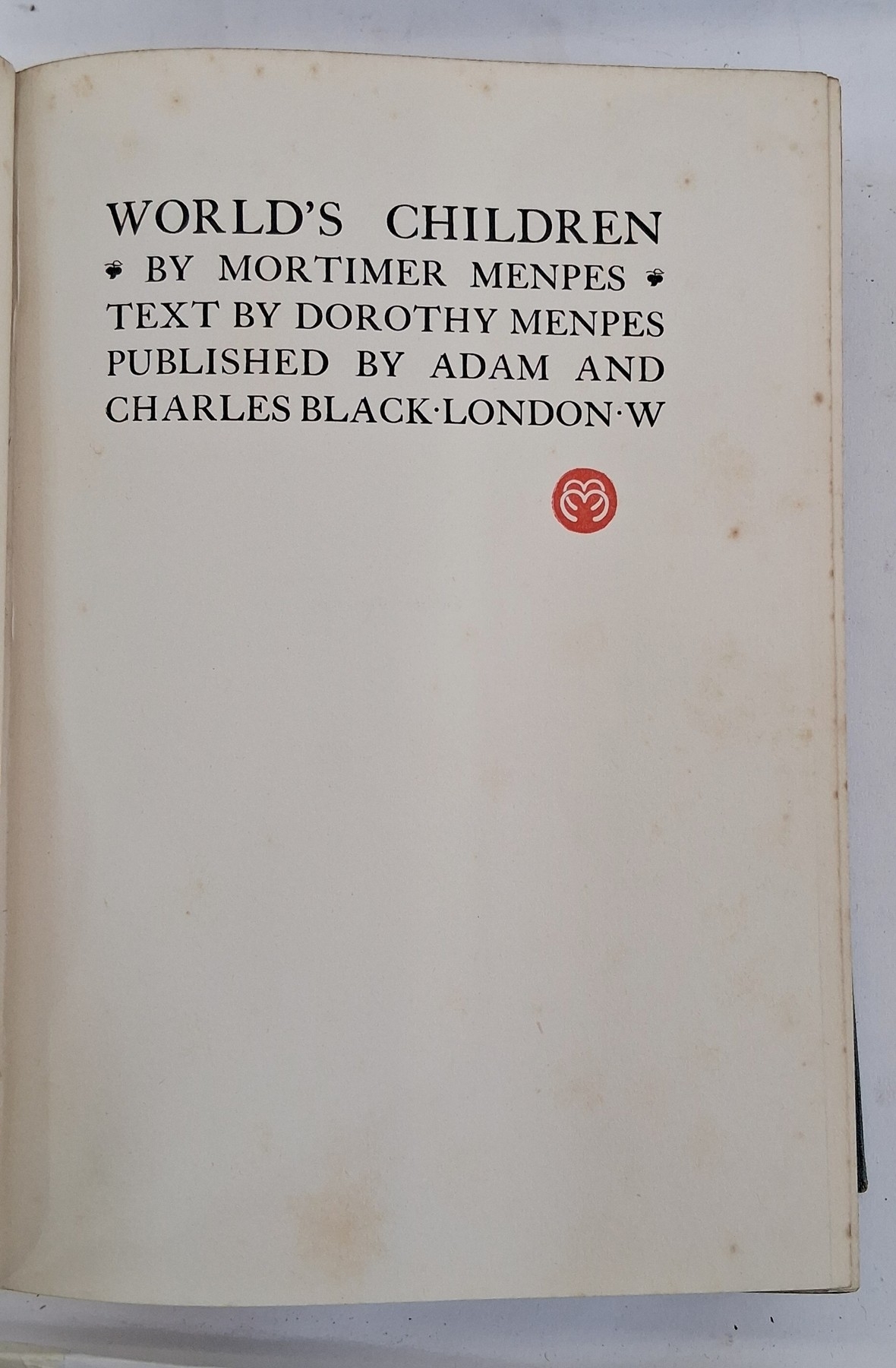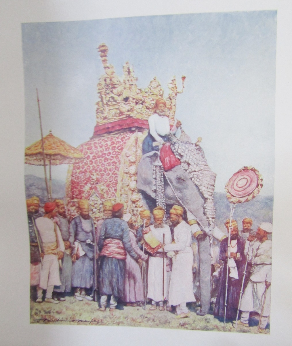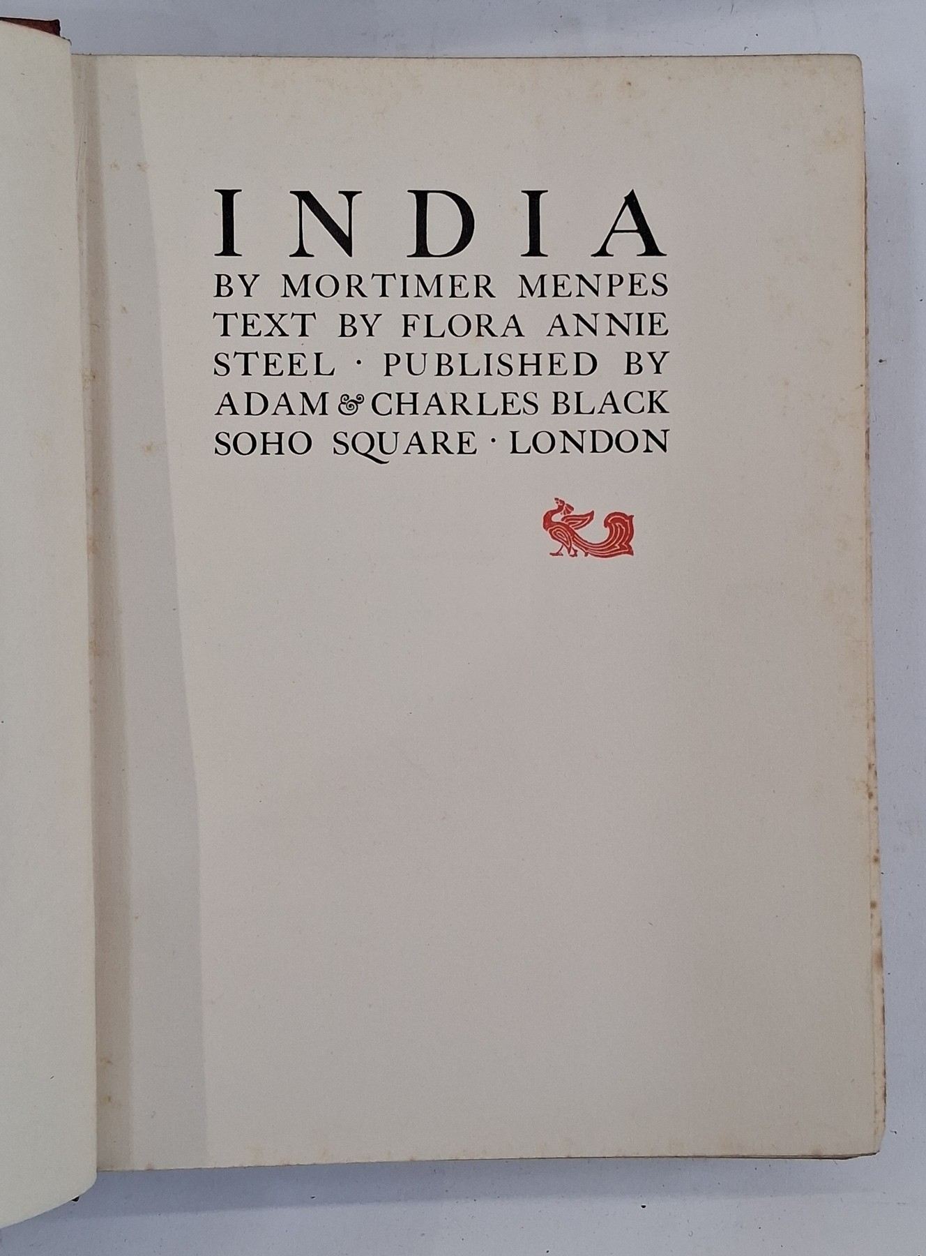 Menpes, Mortimer (ills) "The Durbar", text by Dorothy Menpes, Adam & Charles Black 1903, limited edition no.68/1000 copies signed by Mortimer Menpes, colour plates with lettered tissue guards, bkpl inside front board, decorated cloth and backstrip with gilt titles, front hinge is cracked, there is some staining and foxing to edges, silk ribbon marker, "India", text by Flora Annie Steel, Adam & Charles Black 1905, colour frontis, colour plates with lettered tissue guards, some foxing, offsetting to ffep, red decorated cloth with gilt titles and decorations, foxing to the front edge, "Worlds Children", Adam & Charles Black 1903, colour frontis, colour plates with lettered tissue guards, some foxing, blue decorated cloth and Talbot, Kelly R "Burma - Painted and Described by ...", Adam & Charles Black 1905, colour plates with lettered tissue guards, bkpl inside front board, lavishly decorated pictorial front board and backstrip (4)