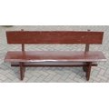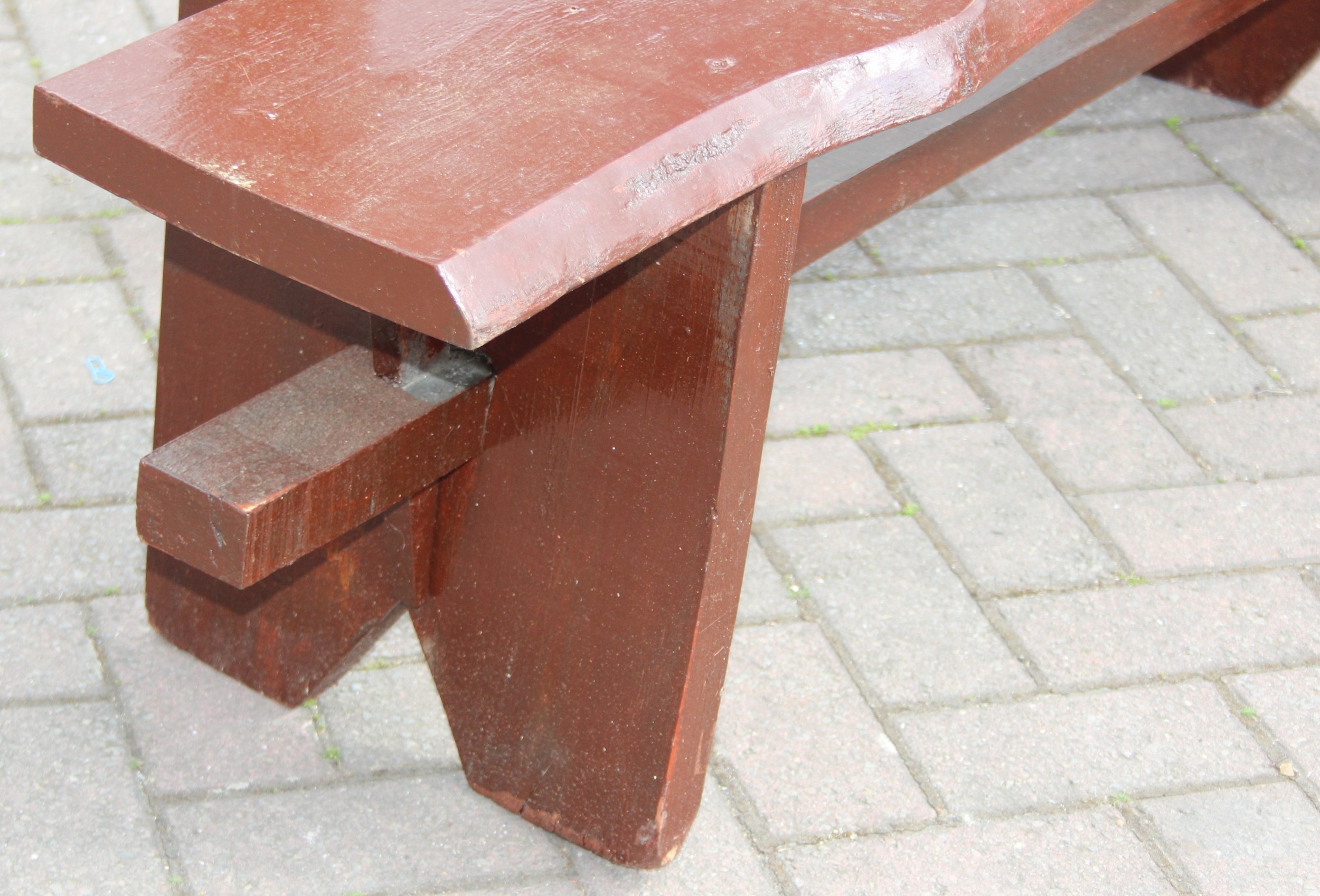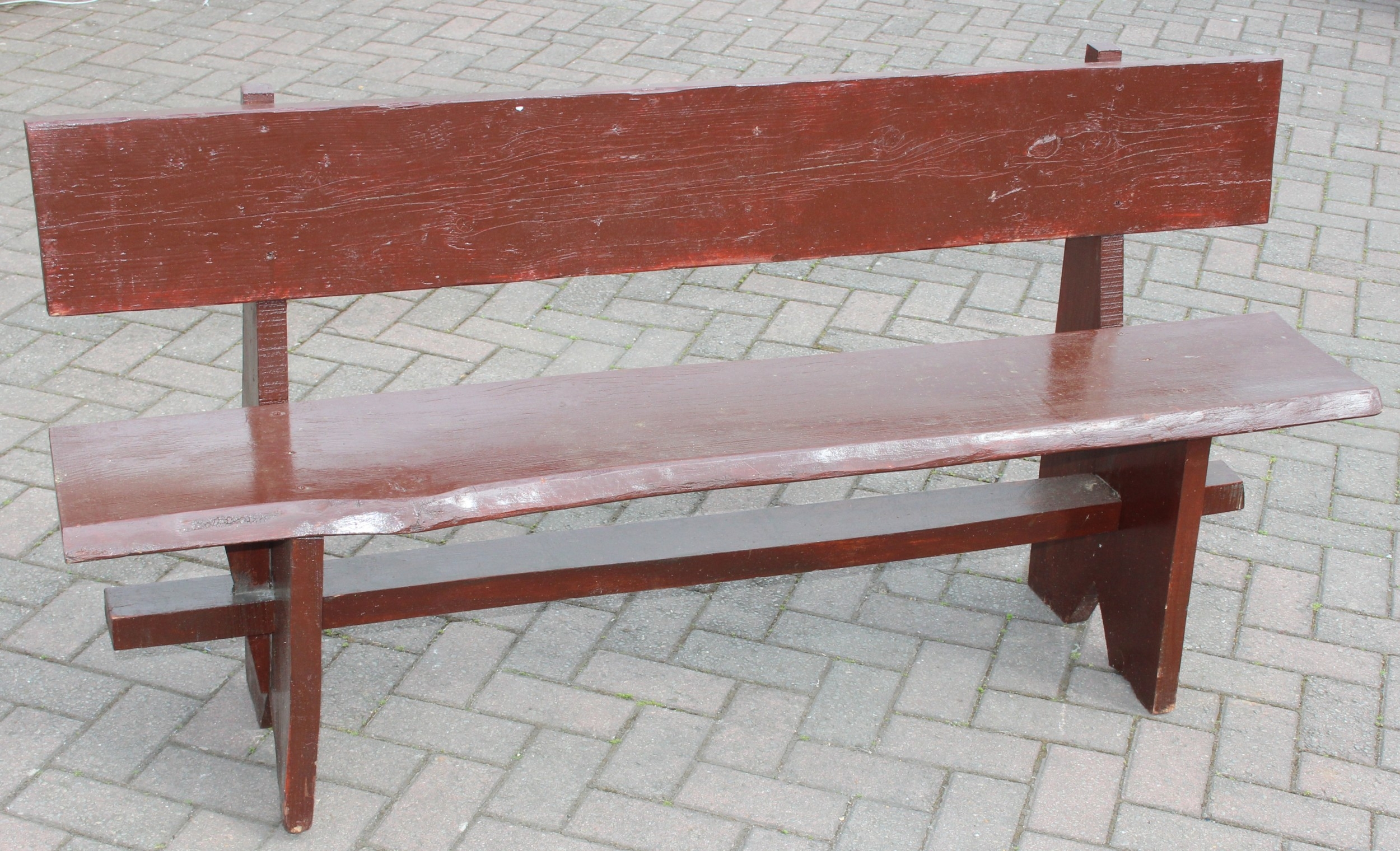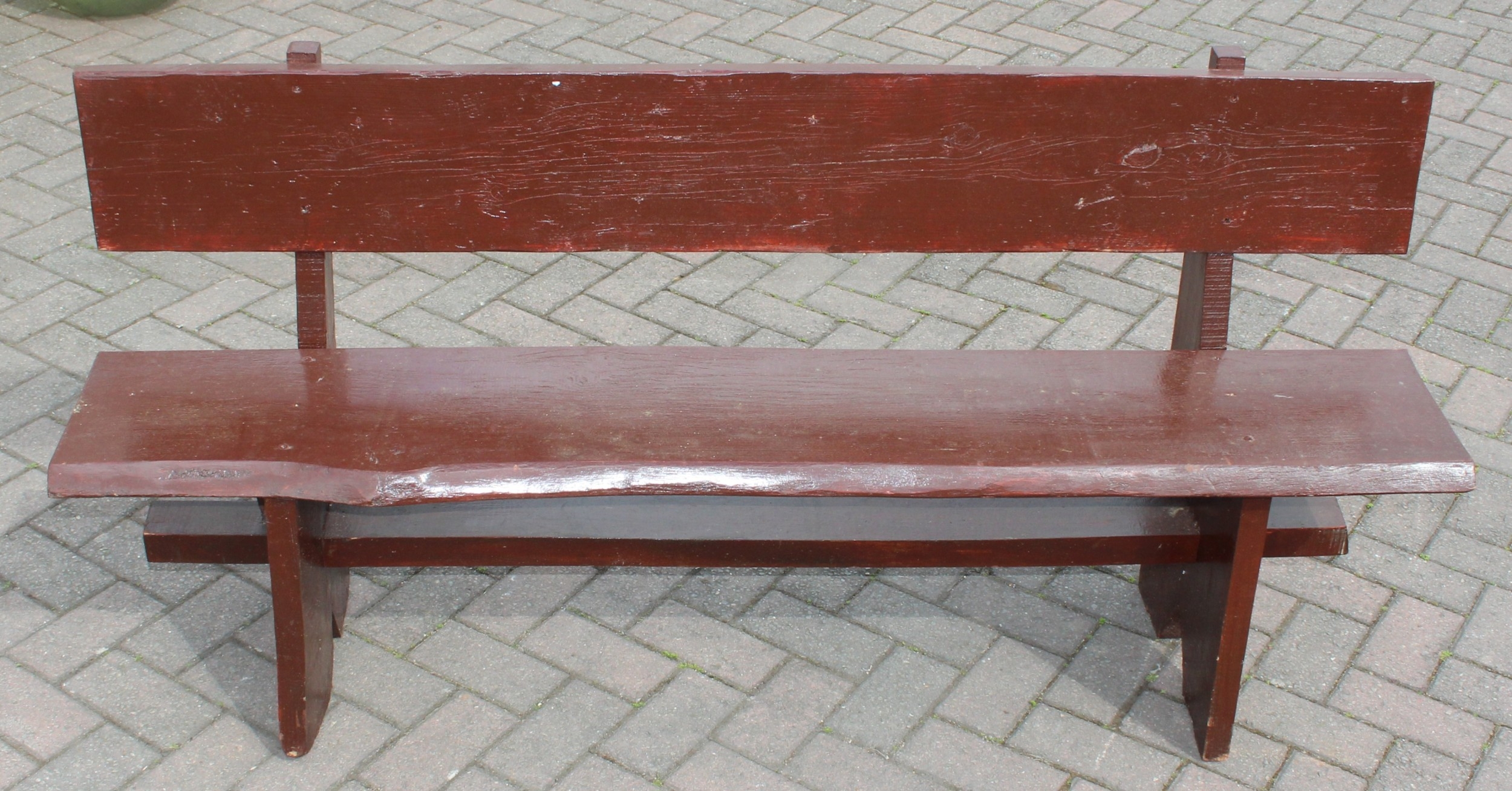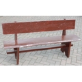 A rustic stained wooden garden bench, two plank construction, 153cm wide