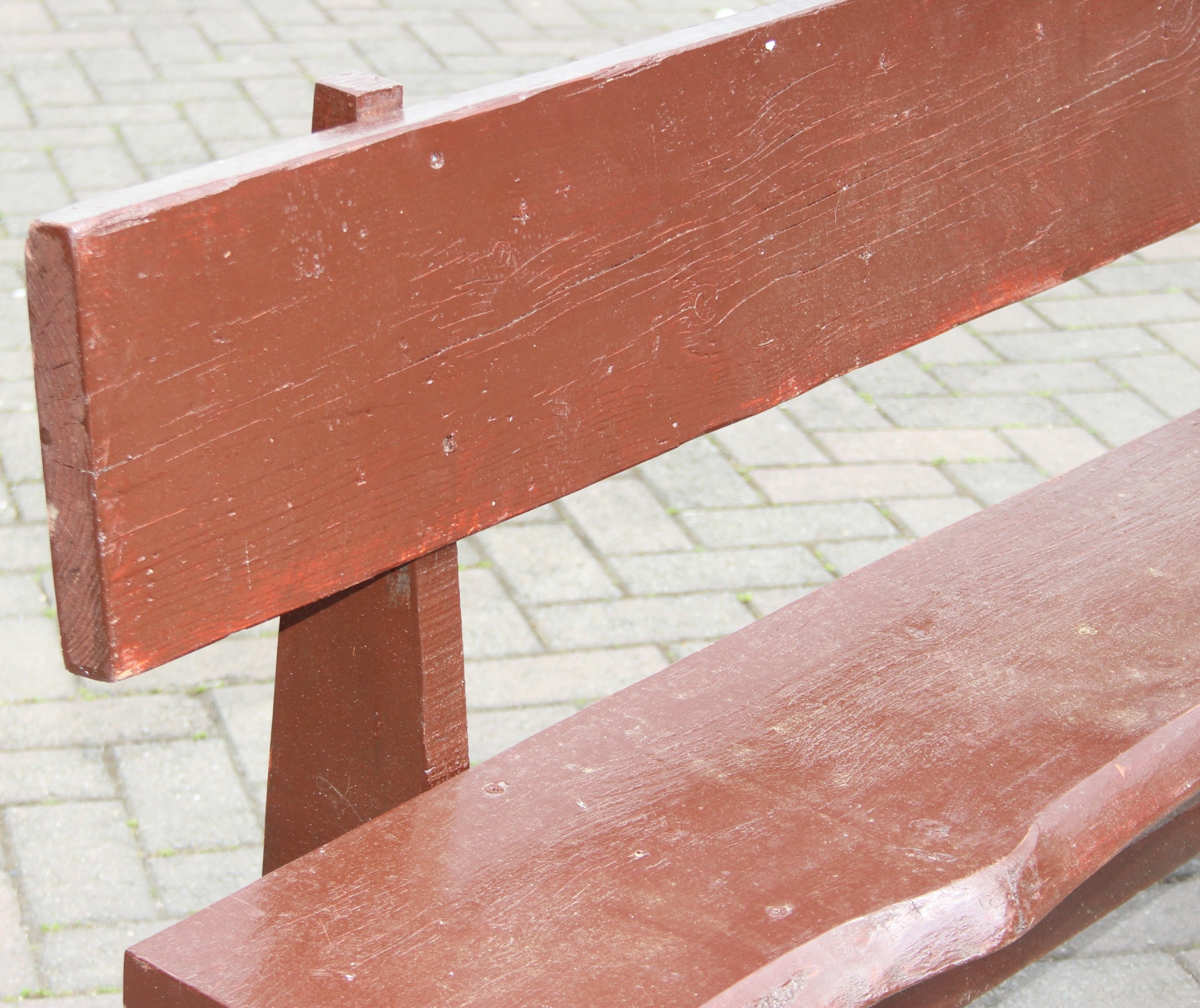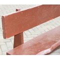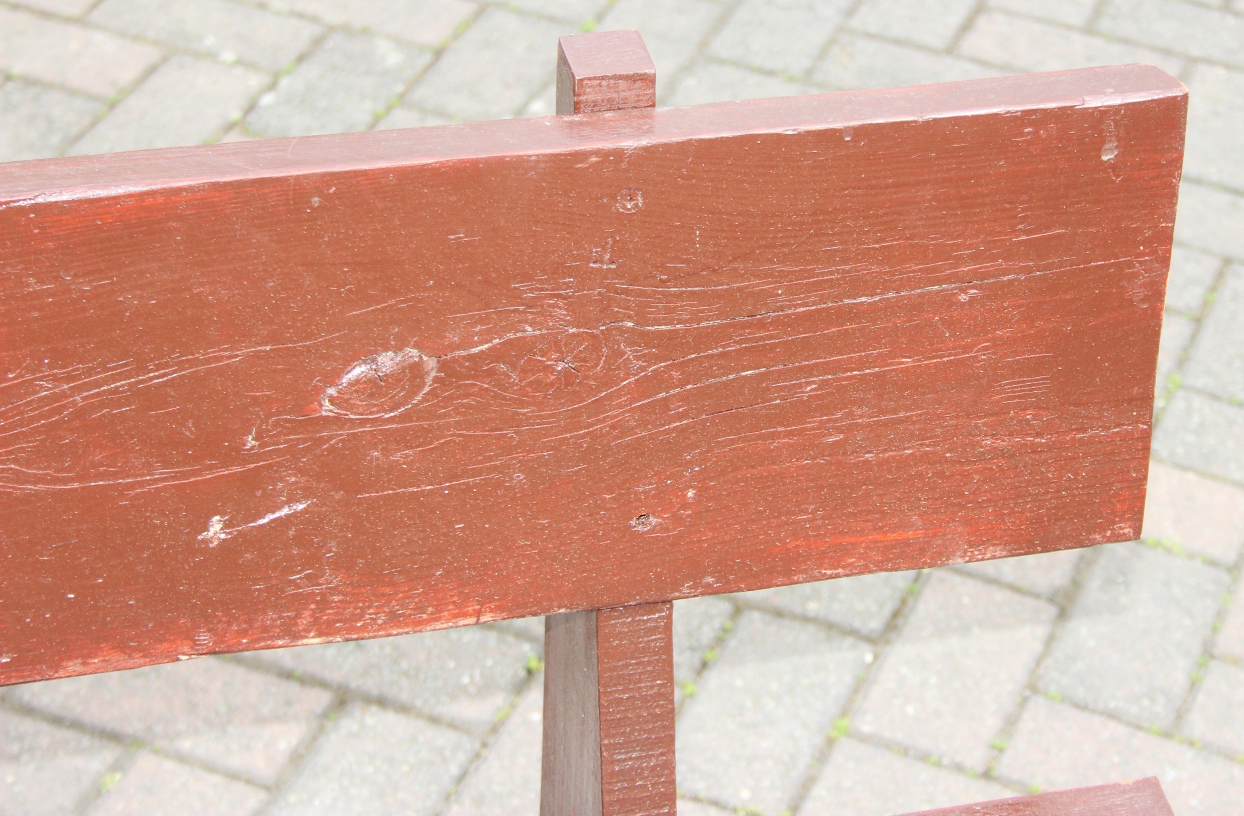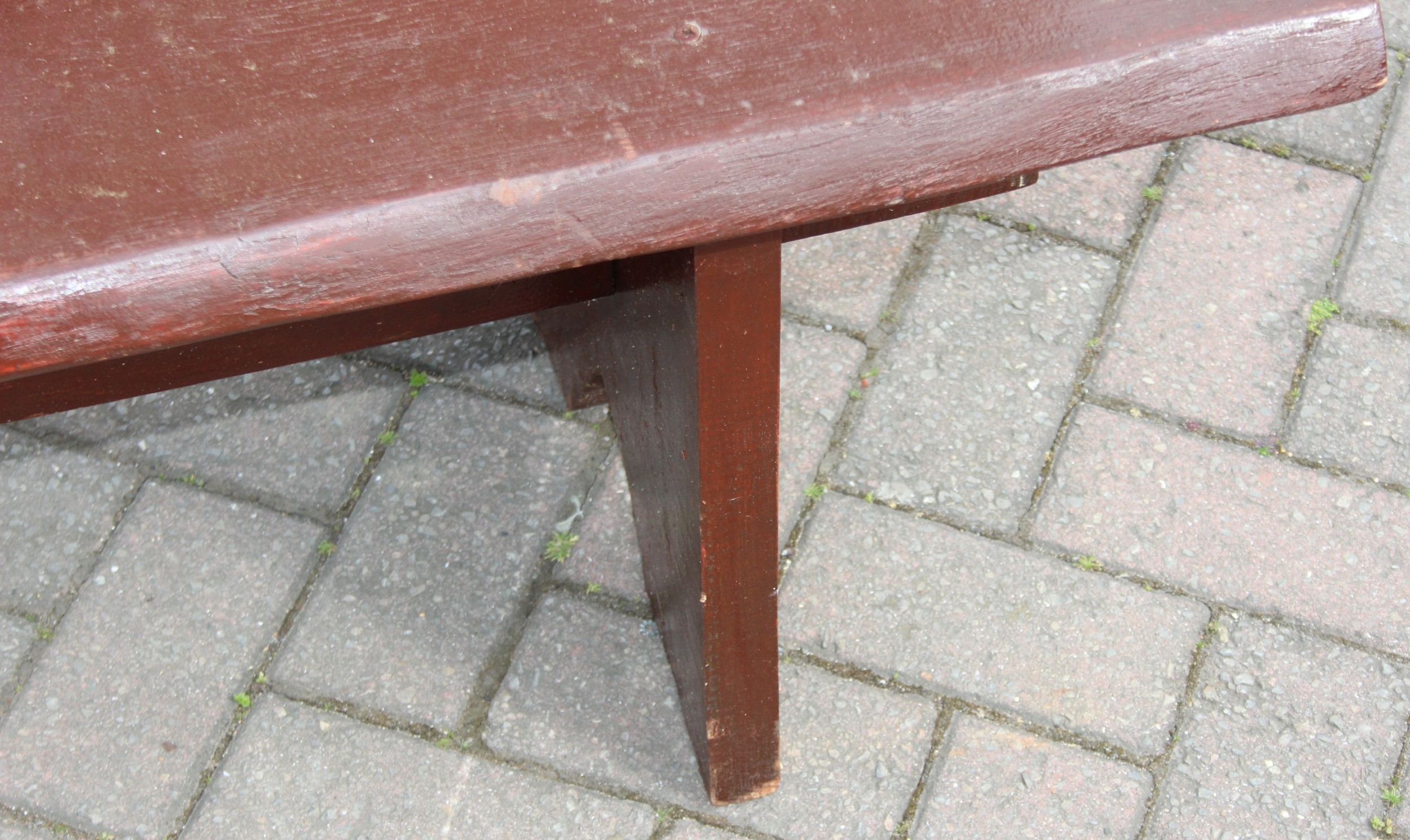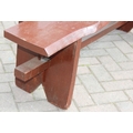 A rustic stained wooden garden bench, two plank construction, 153cm wide