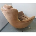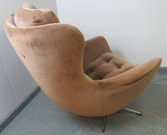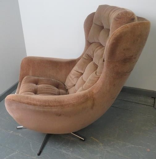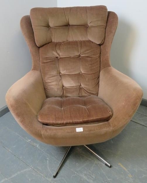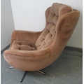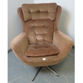 A 1970s wingback ‘Blofeld’ style swivel chair, upholstered in buttoned brown draylon, on a chrome base.