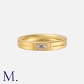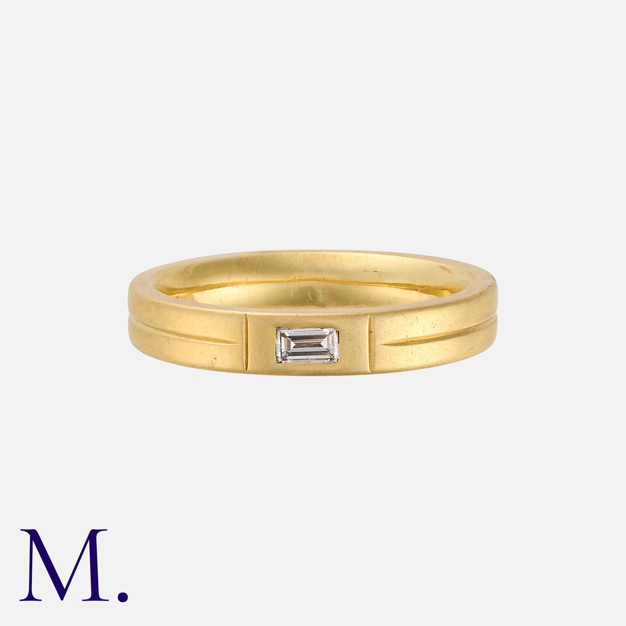 A Diamond Accent Band in 18K yellow gold set with a single baguette cut diamond accent weighing approx. 0.10ct to a grooved 4mm wide band. Hallmarked for 18ct gold.