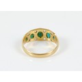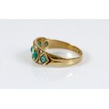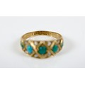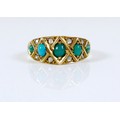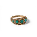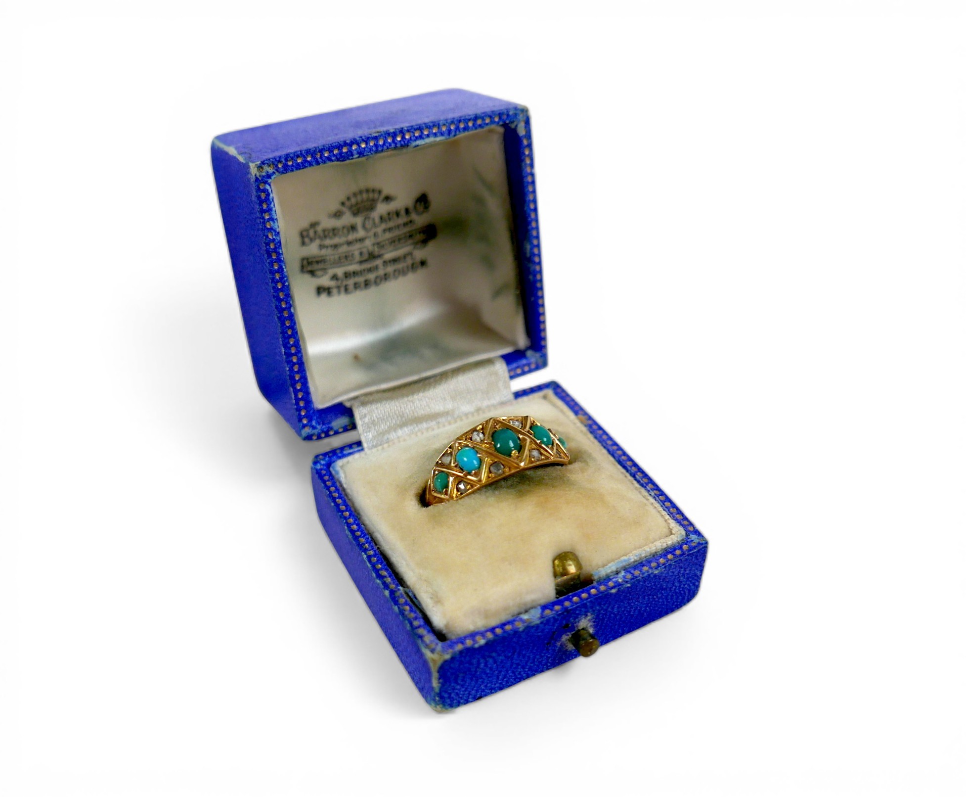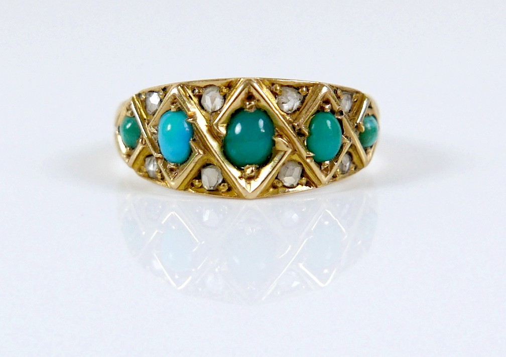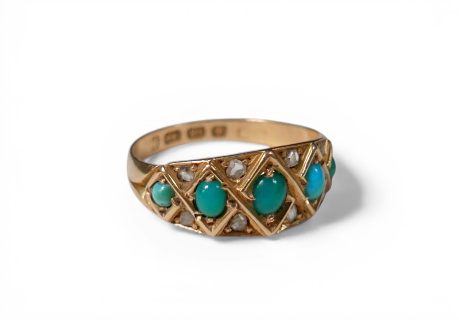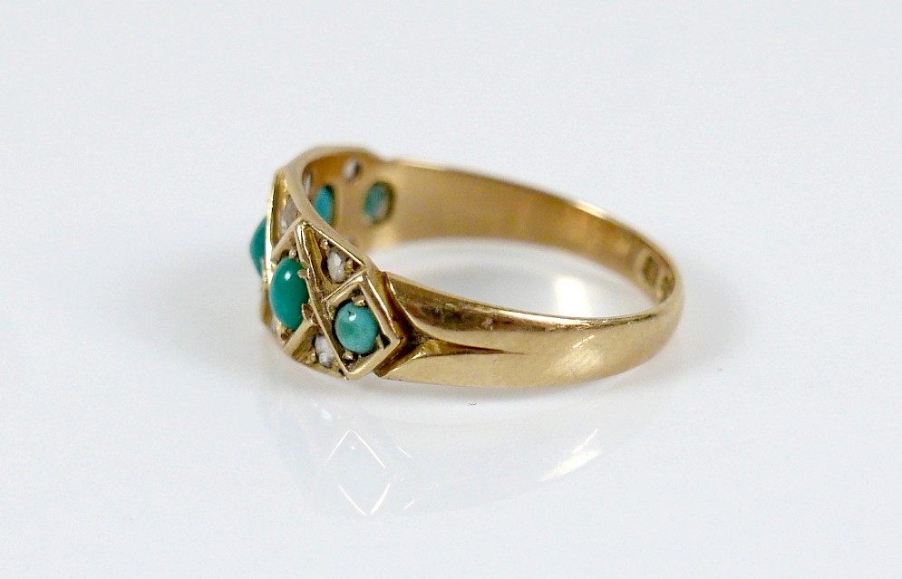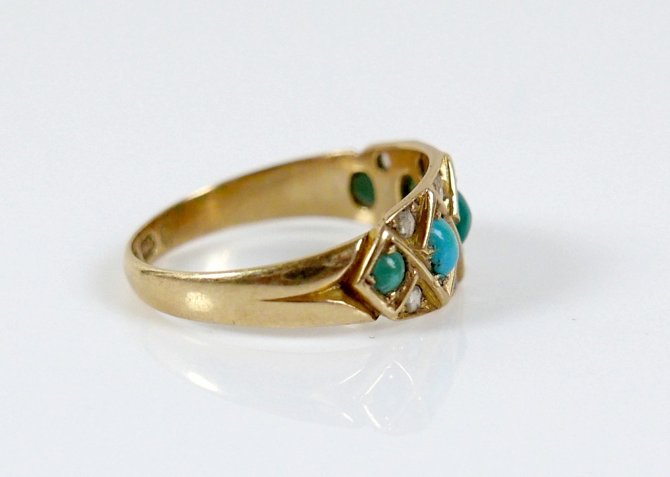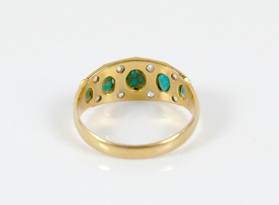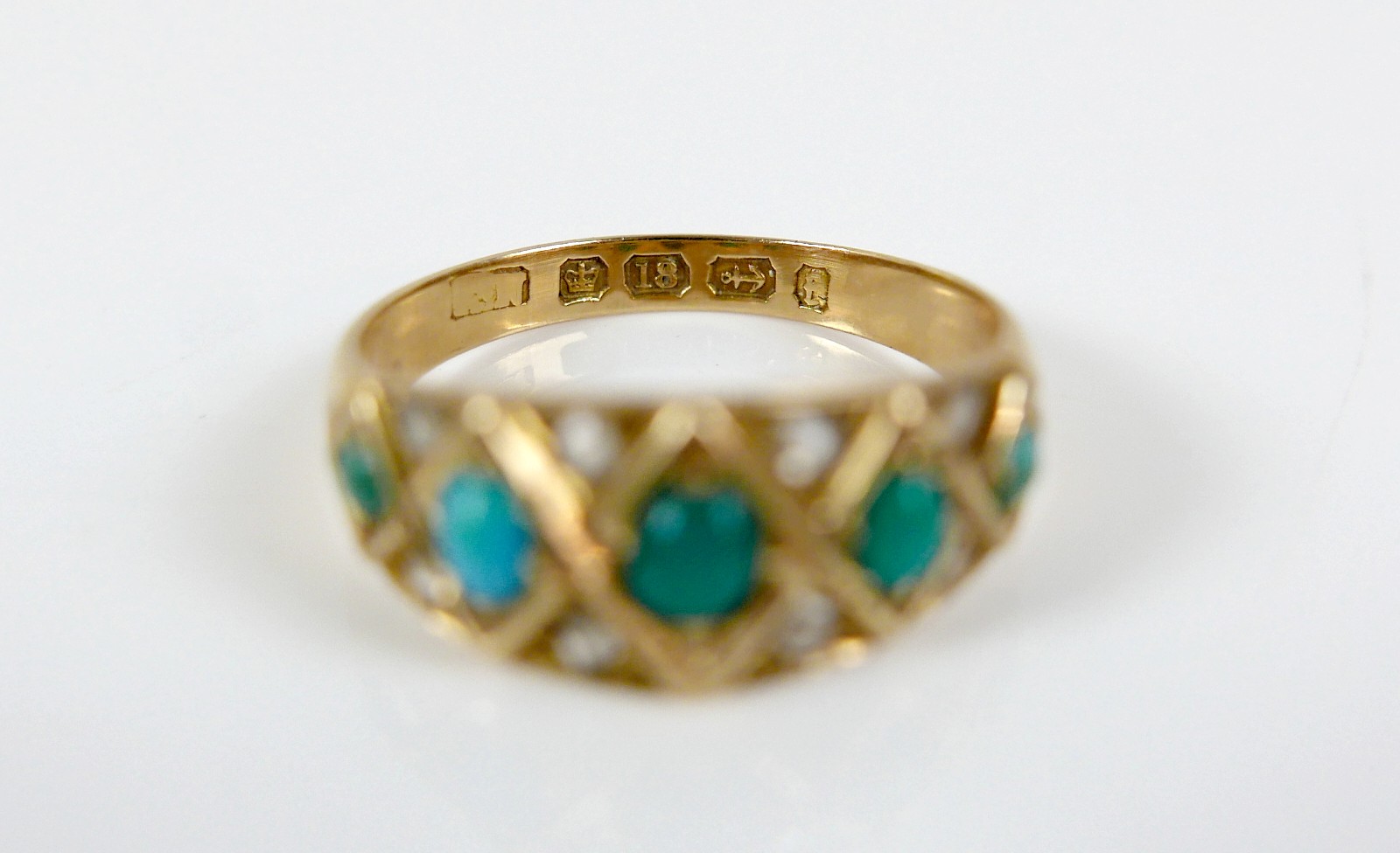 An 18ct gold turquoise and diamond ring, with five oval cut turquoise stones, interspersed with eight small round cut diamonds size P, 3.2g.