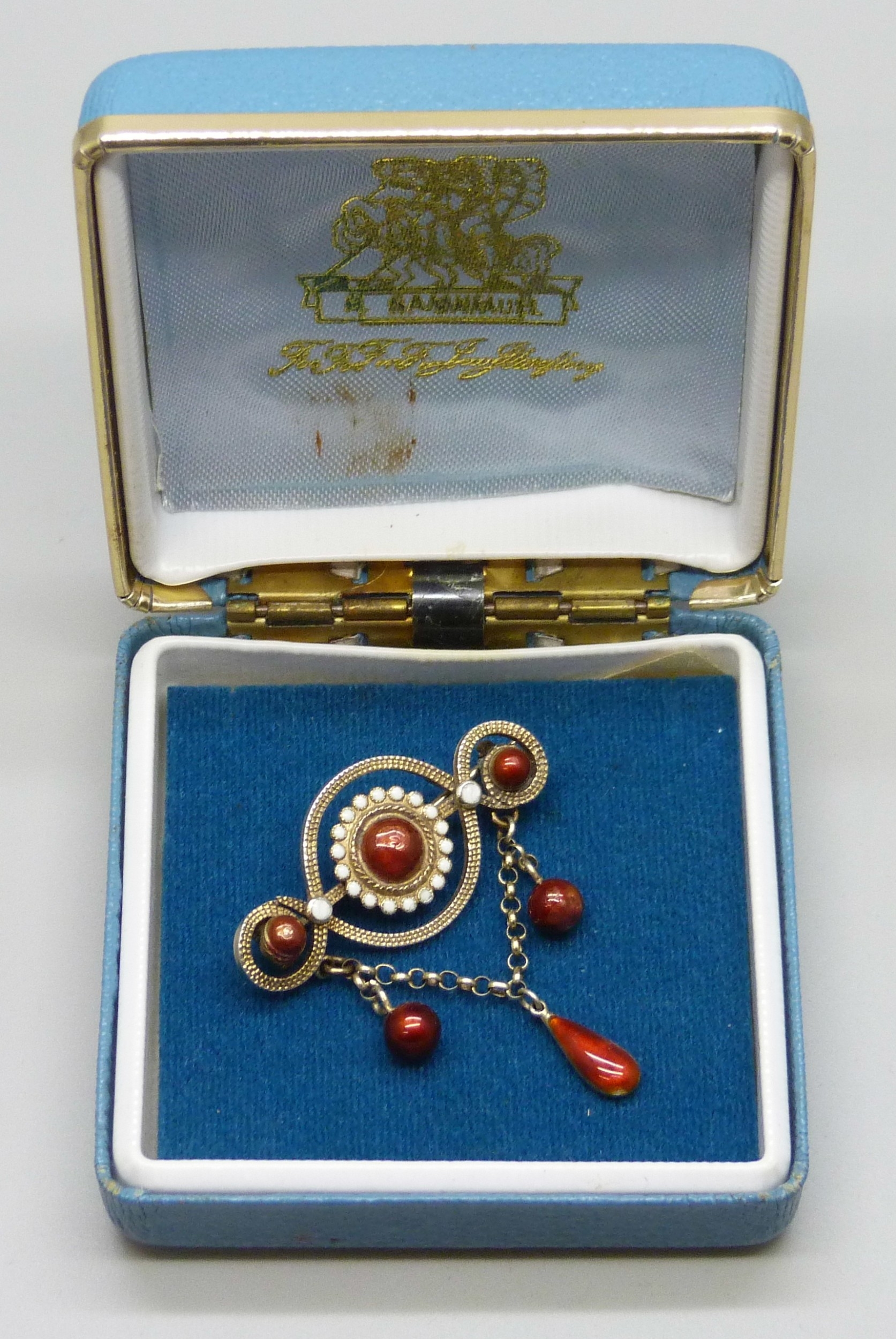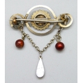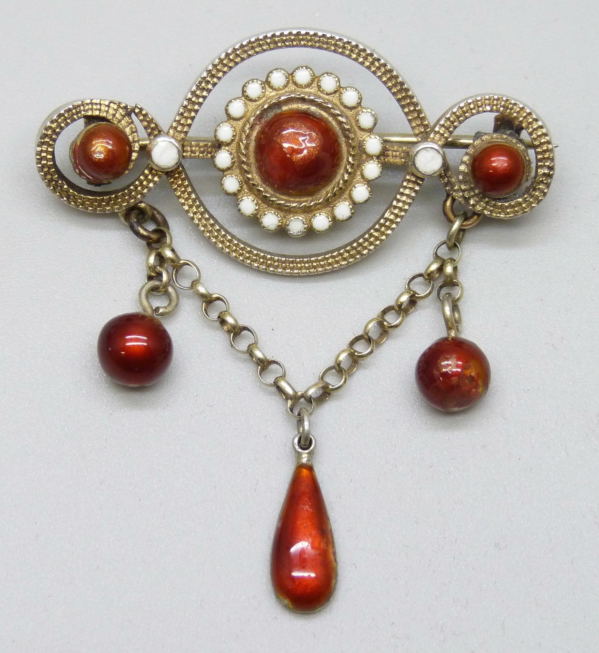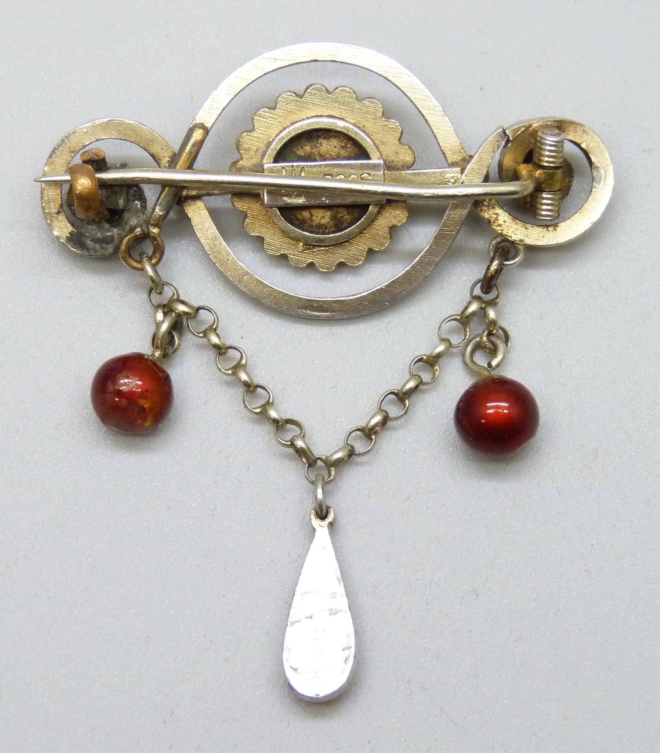 Scandinavian jewellery, a Marius Hammer Norwegian .930 silver and enamel drop brooch, a/f, repair to hook, 3.7cm bar