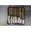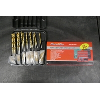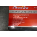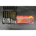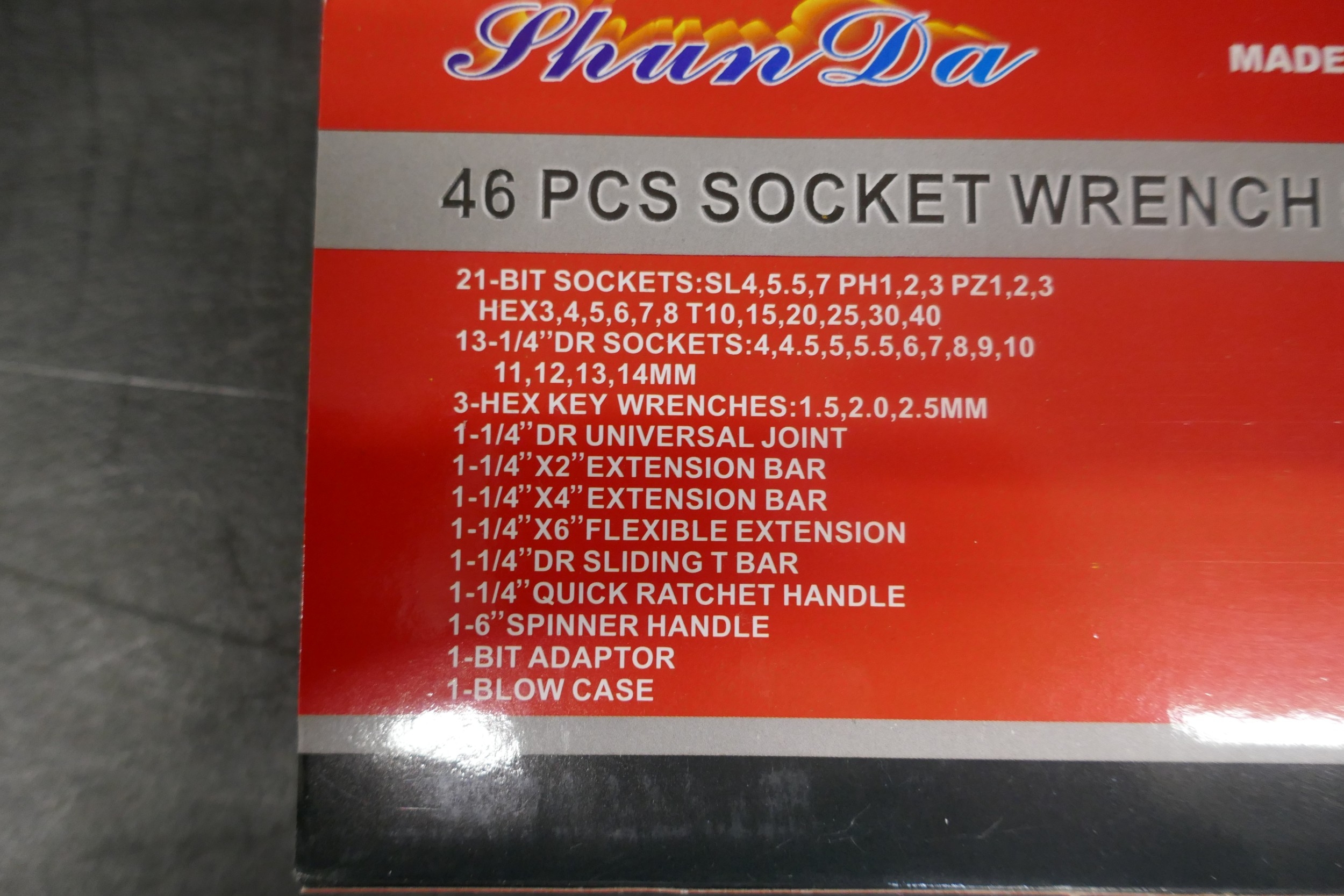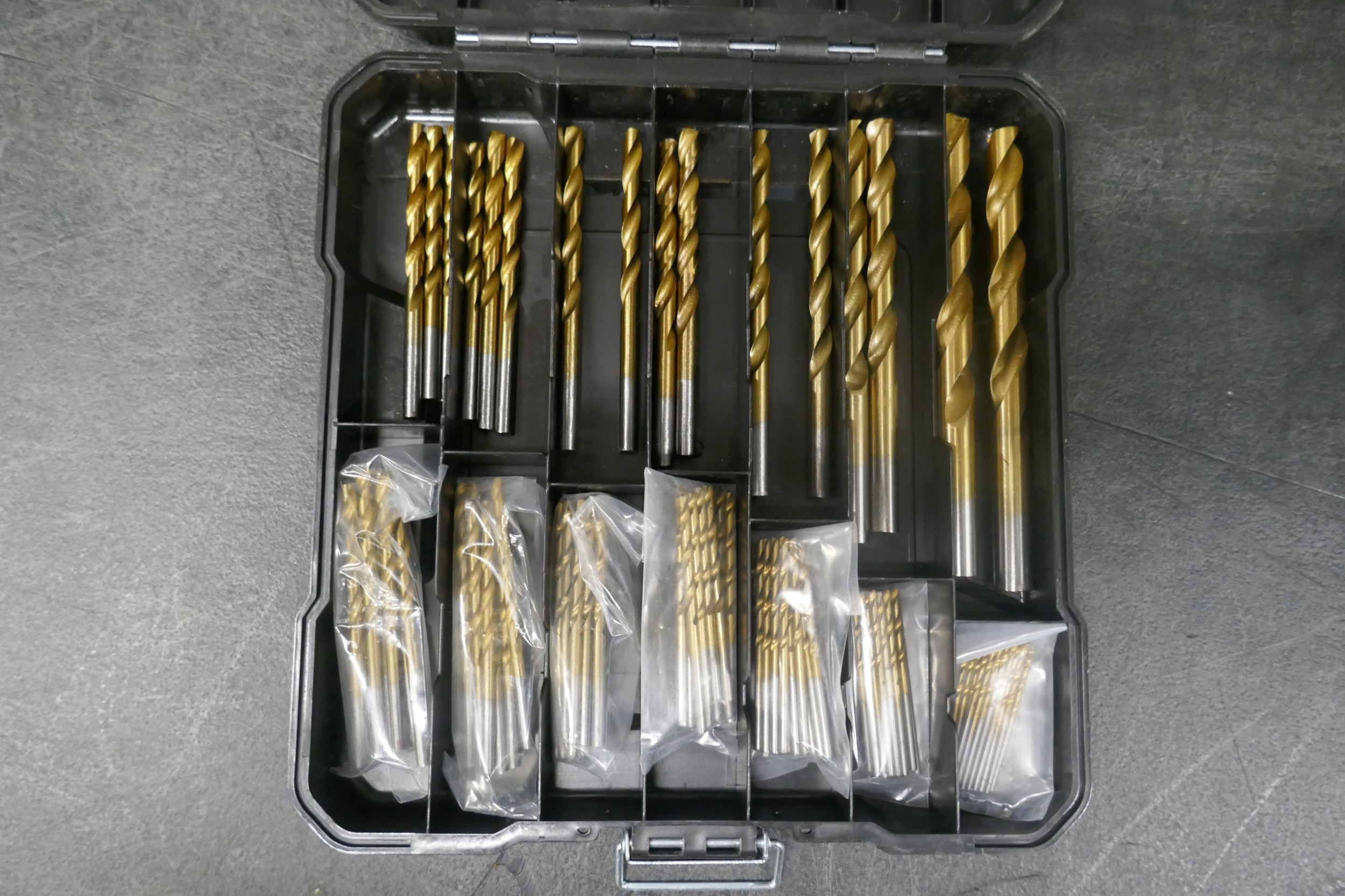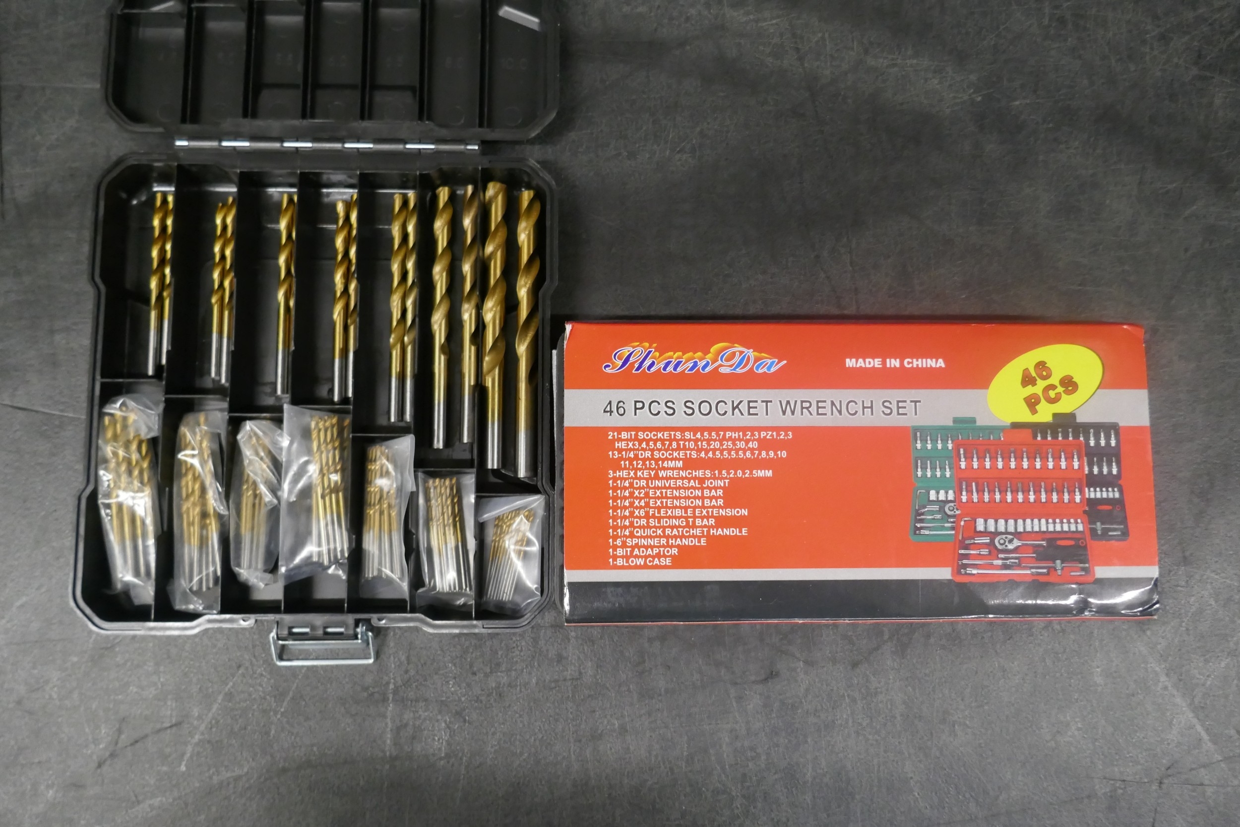 A 46 piece socket wrench set and a 100 piece twist drill set