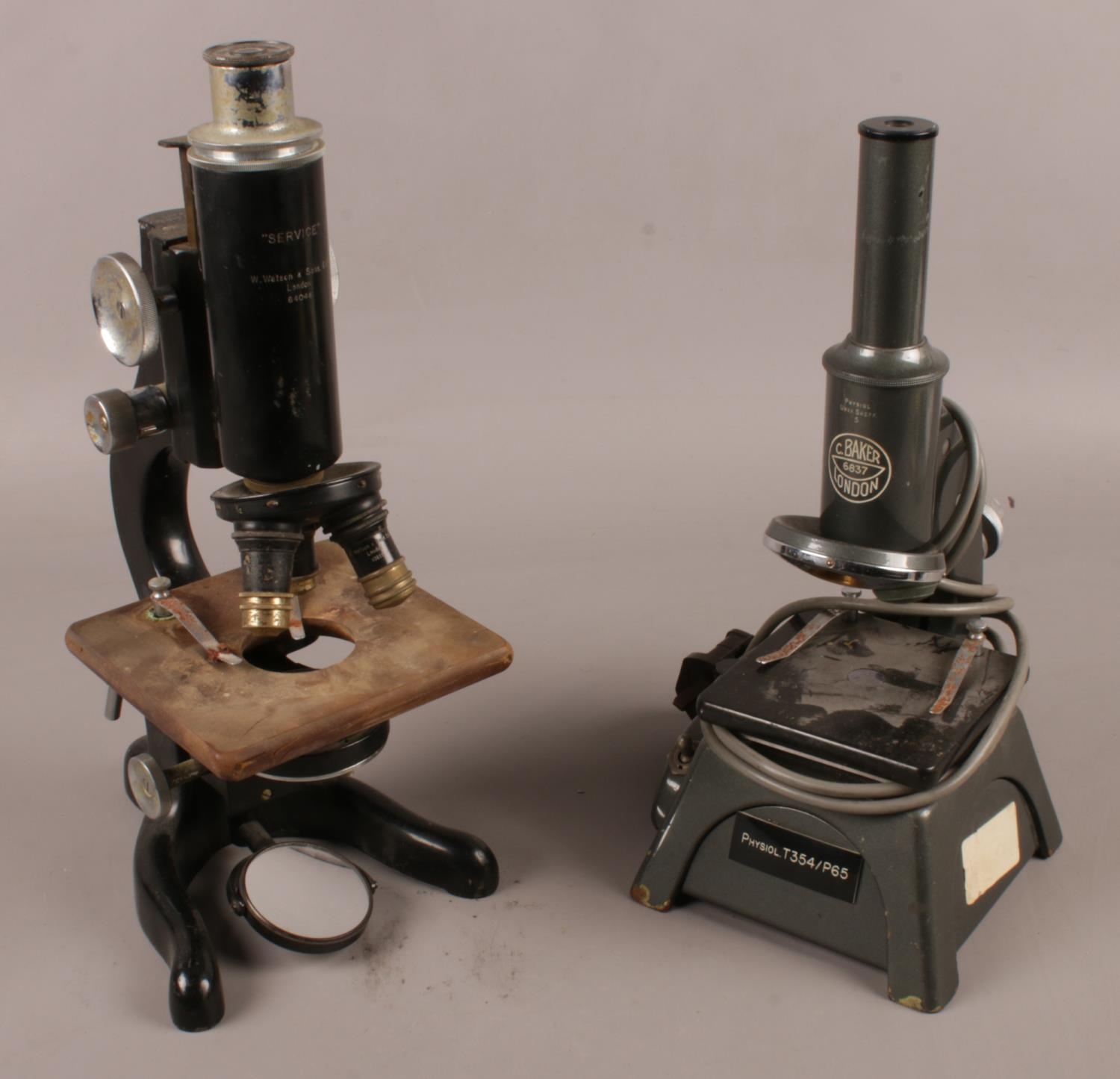 A C.Baker microscope along with W.Watson & Sons "Service" microscope.