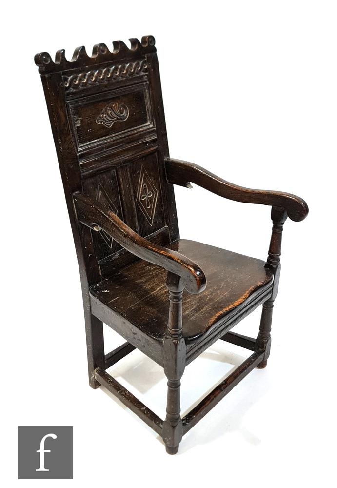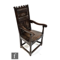 An oak wainscot chair in the 17th Century style, the fielded panel back above a solid seat and turned front legs, all above a stretcher frame, some damage.