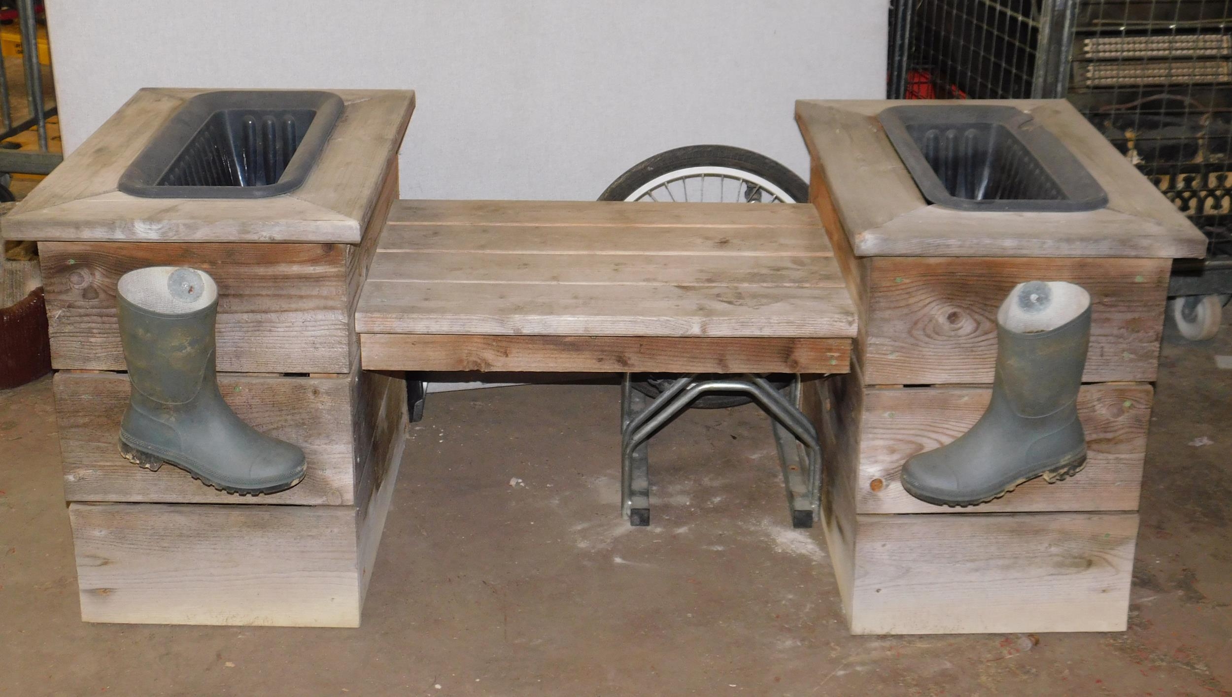Wooden garden bench with planters each side