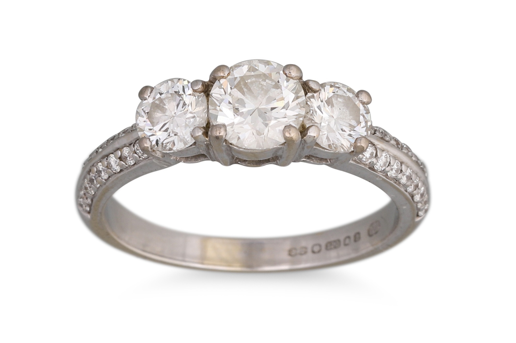 A THREE STONE DIAMOND RING, brilliant cut diamonds mounted in 18ct white gold. Estimated: weight of diamonds: 1.00 ct. Size K