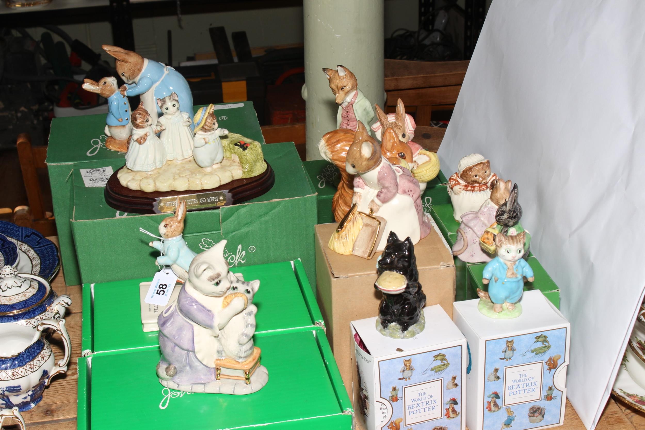 Collection of Beswick and Royal Doulton Beatrix Potter figurines including Duchess 1979, Peter and his Book P4217, Little Black Rabbit 1971, etc (13).