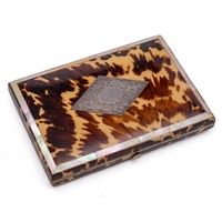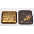 A Komai style iron cigarette case: inlaid with gold and silver depicting a temple before mount Fuji, 9cm wide and a brass cigarette case decorated with a village scene and mount Fuji in the background, 9cm wide.