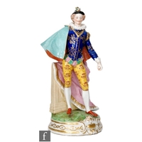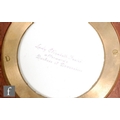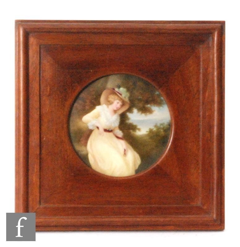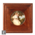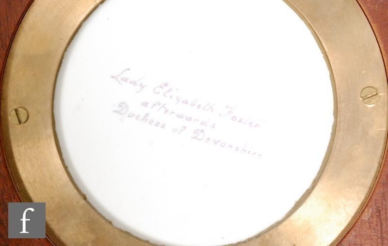 An early 20th Century circular porcelain panel decorated by Leslie Johnson with a hand painted portrait of Lady Elizabeth Foster afterwards Duchess of Devonshire, after the original by Angelica Kauffman, visible diameter 11cm, within a wooden frame
