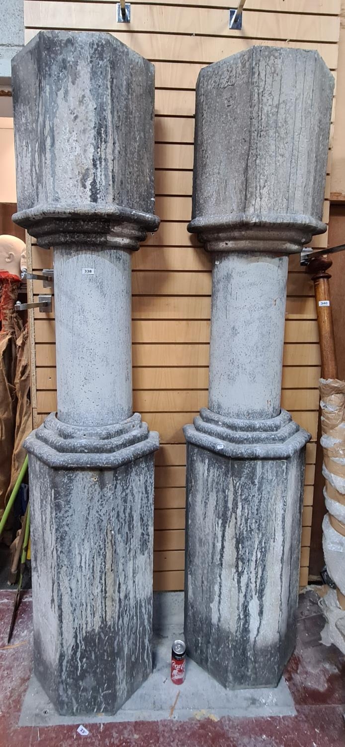 Pair of half faux stone pillars. 233cm tall