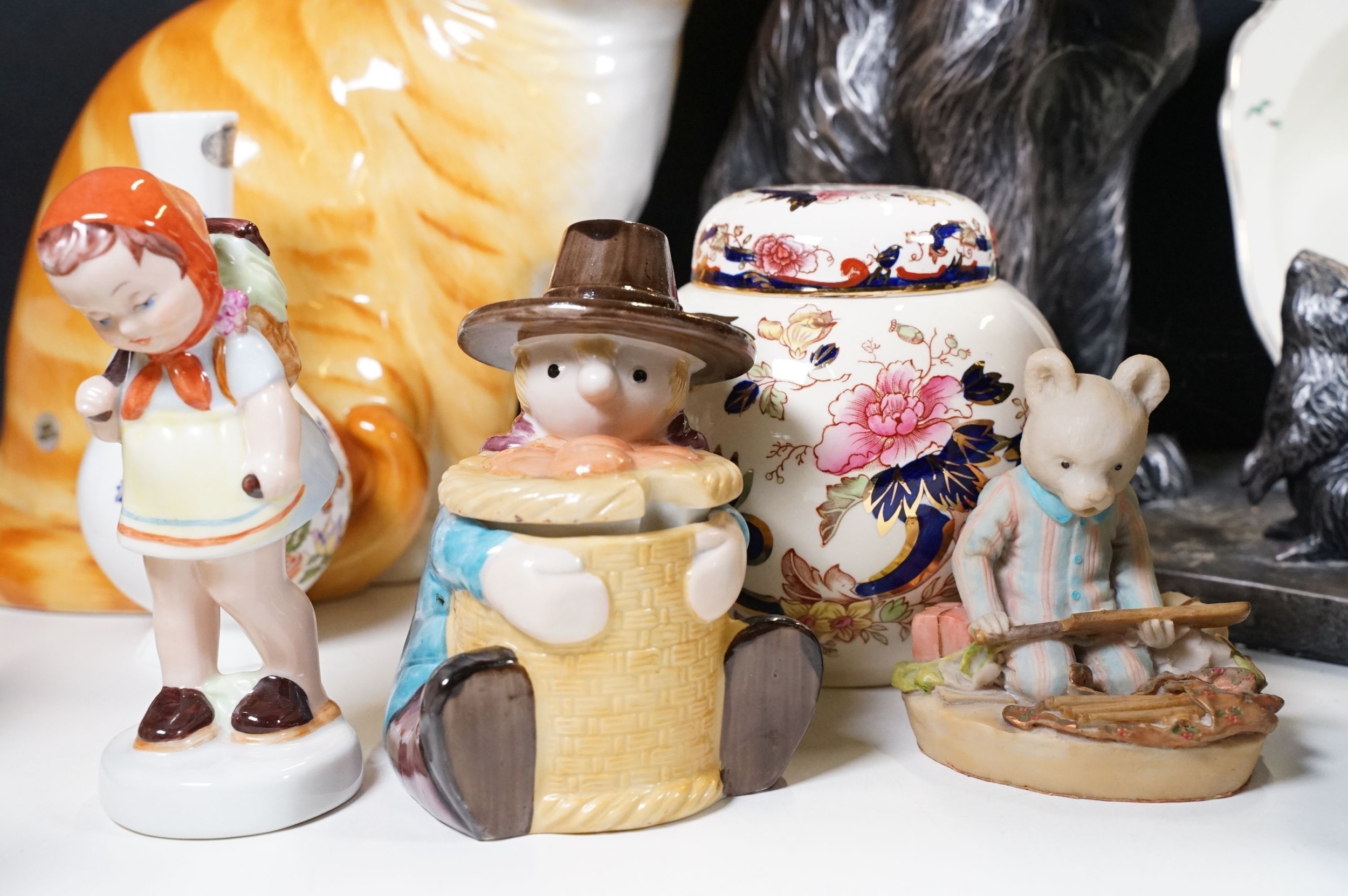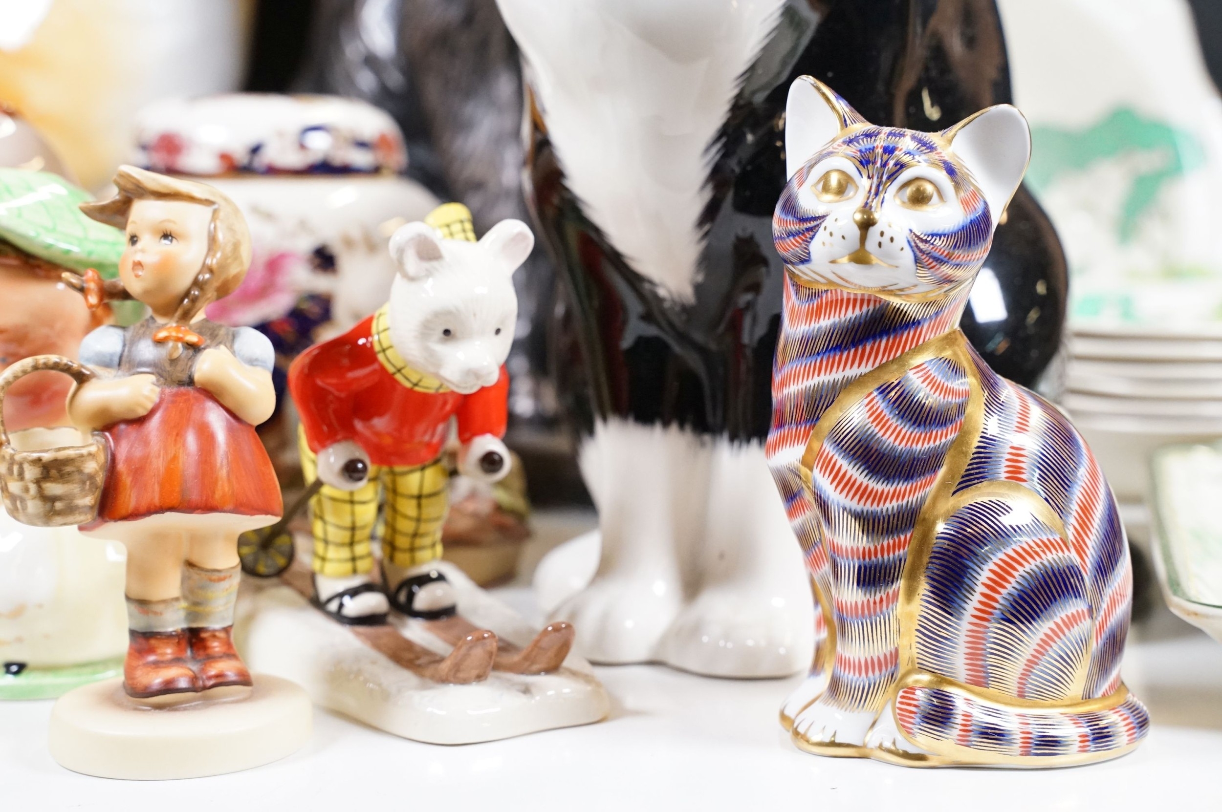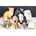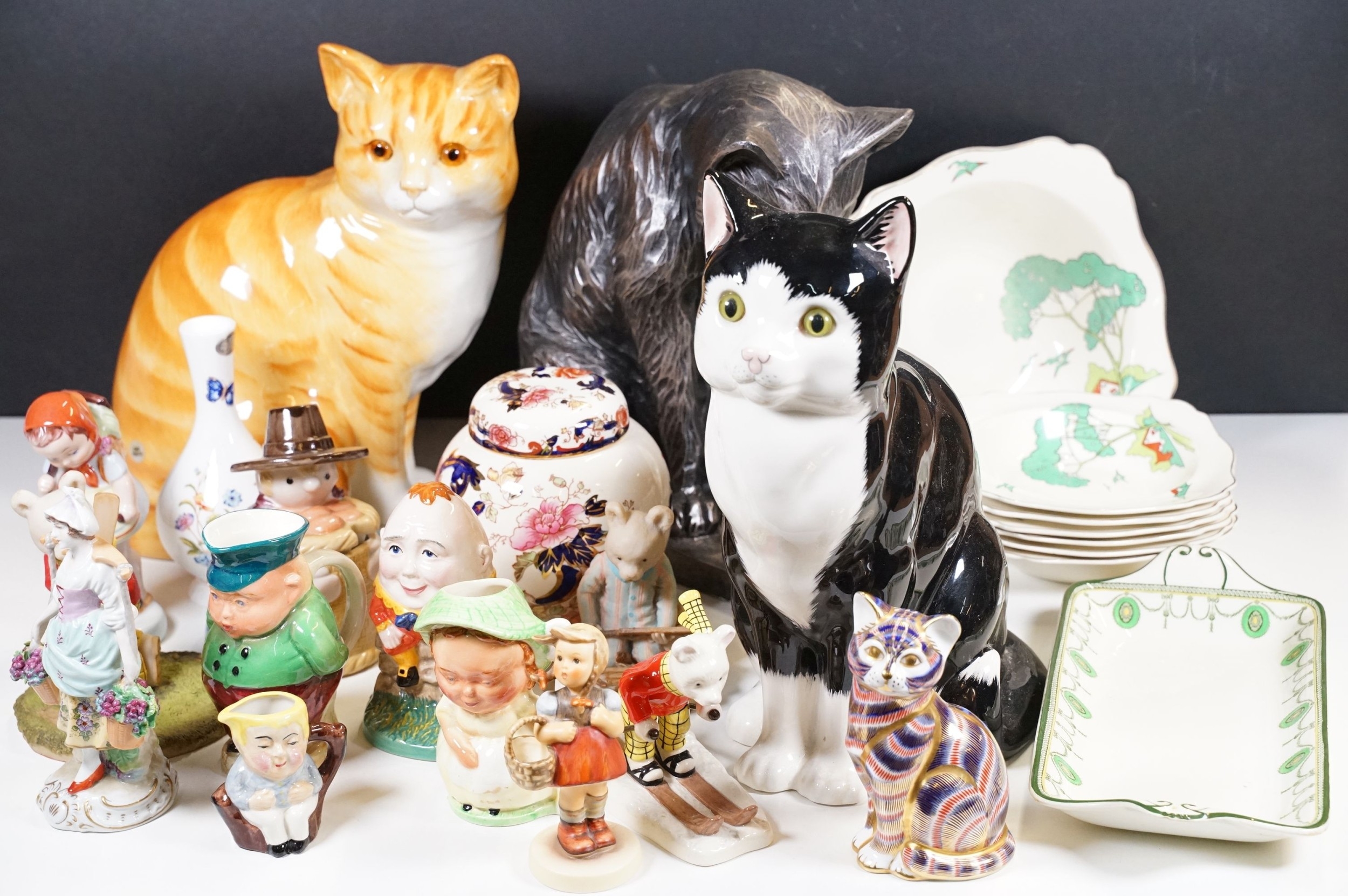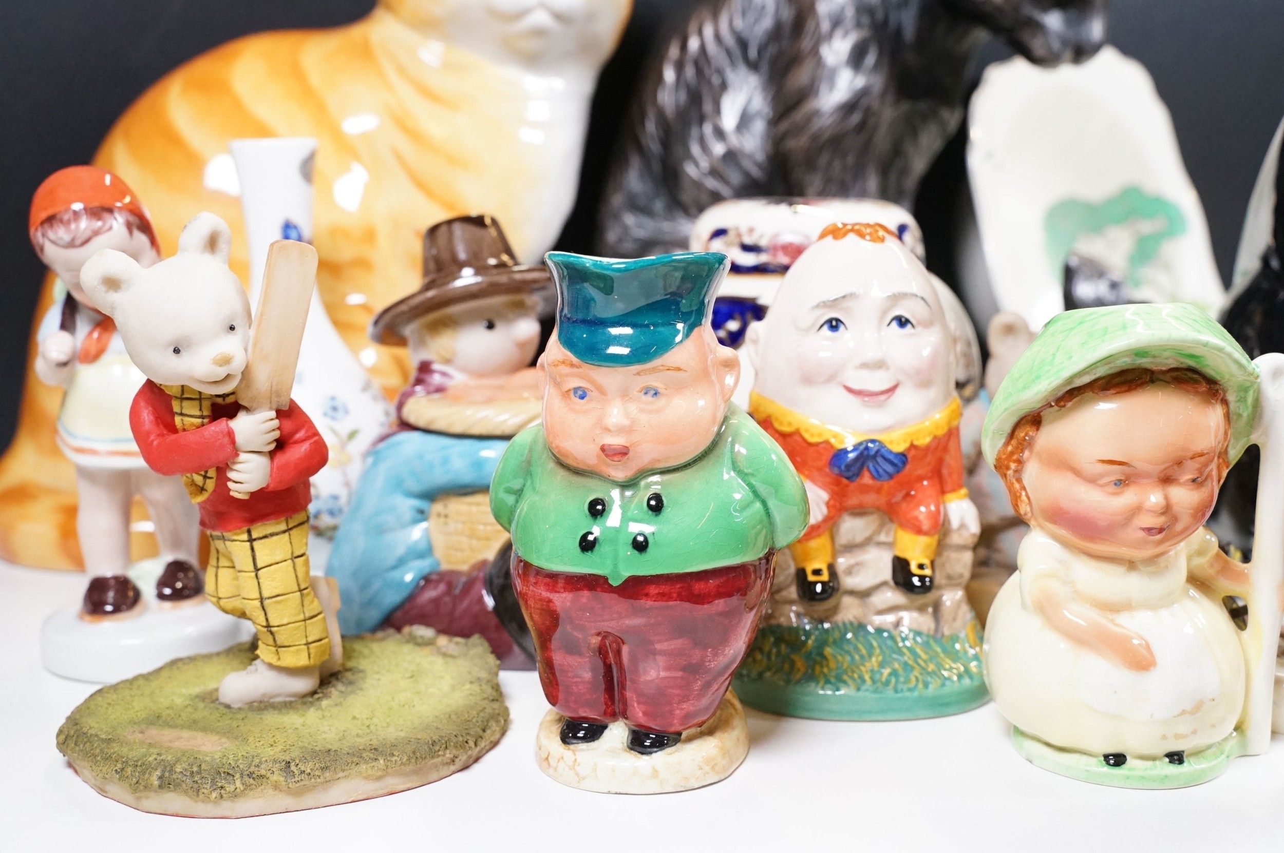 Assortment of mixed ceramics to include a Crown Derby cat paperweight - LX, Royal Doulton 'Humpty Dumpty' and 'Countess' pattern small tray, Rupert the Bear figurines, Aynsley 'Cottage Garden' bud vase, Windmill Bakery figurine, Clarice Cliff style 'Snow White' bowls together with three large cat figures, etc (2 boxes)