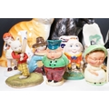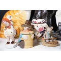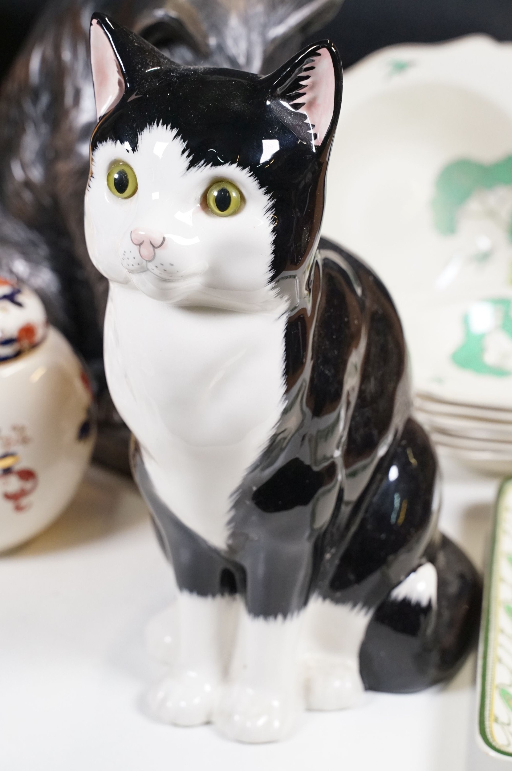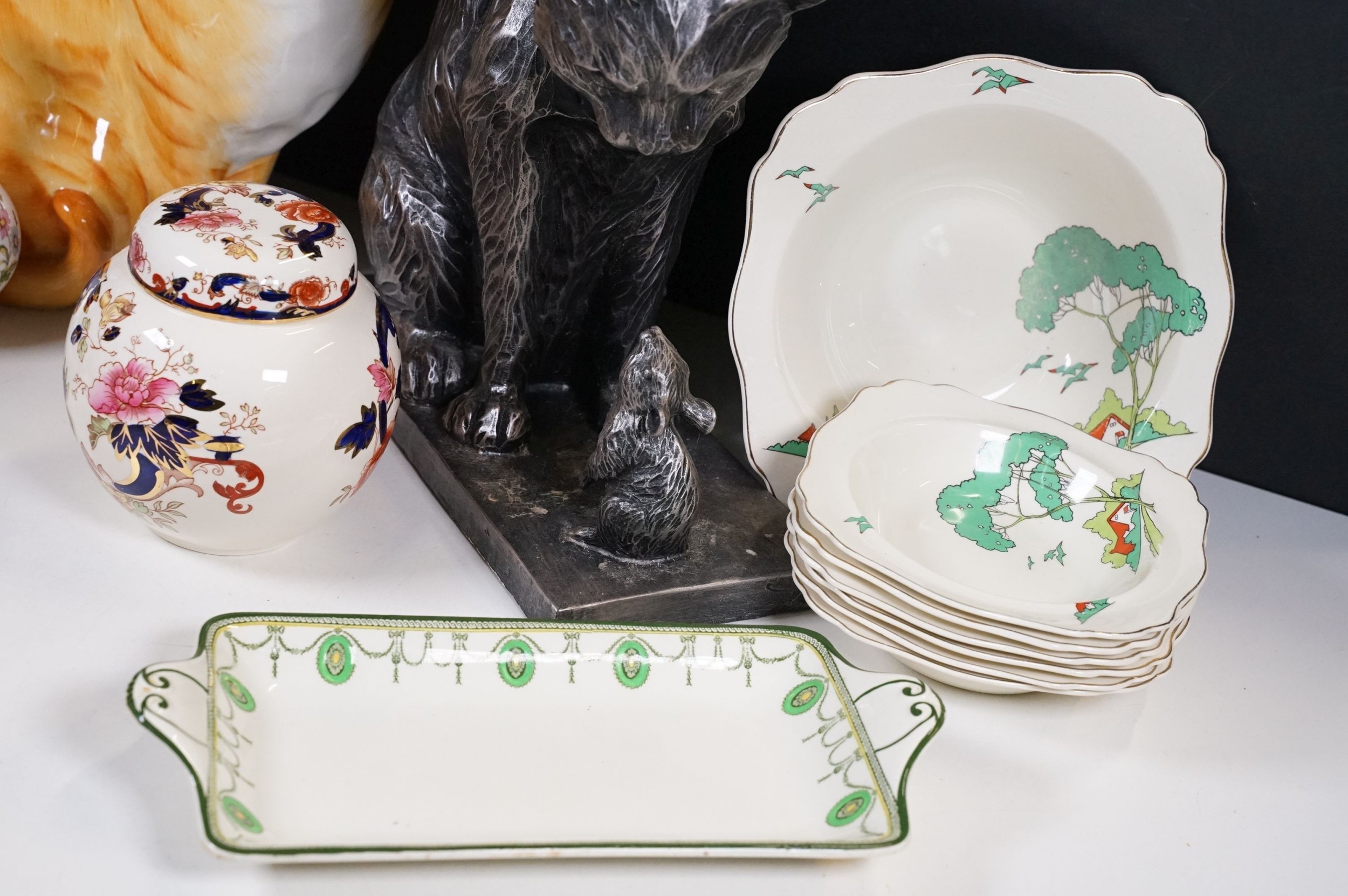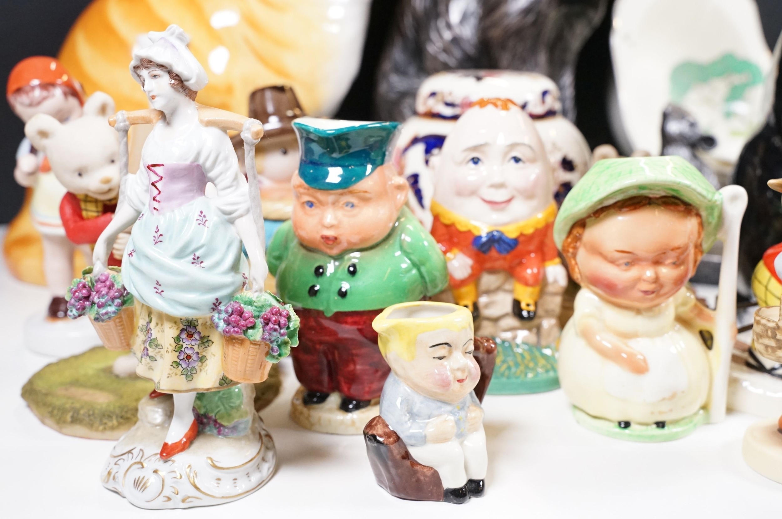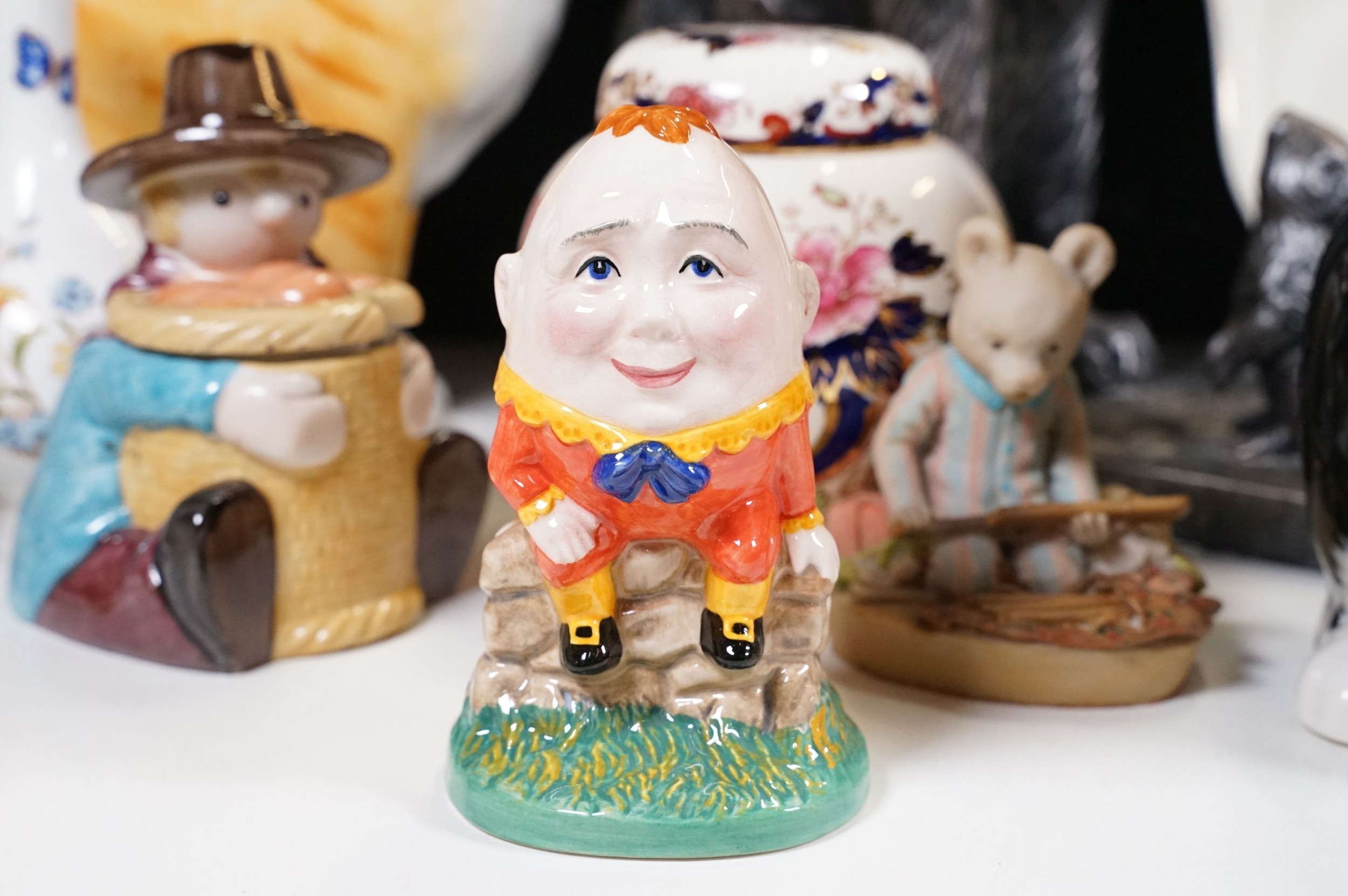 Assortment of mixed ceramics to include a Crown Derby cat paperweight - LX, Royal Doulton 'Humpty Dumpty' and 'Countess' pattern small tray, Rupert the Bear figurines, Aynsley 'Cottage Garden' bud vase, Windmill Bakery figurine, Clarice Cliff style 'Snow White' bowls together with three large cat figures, etc (2 boxes)
