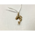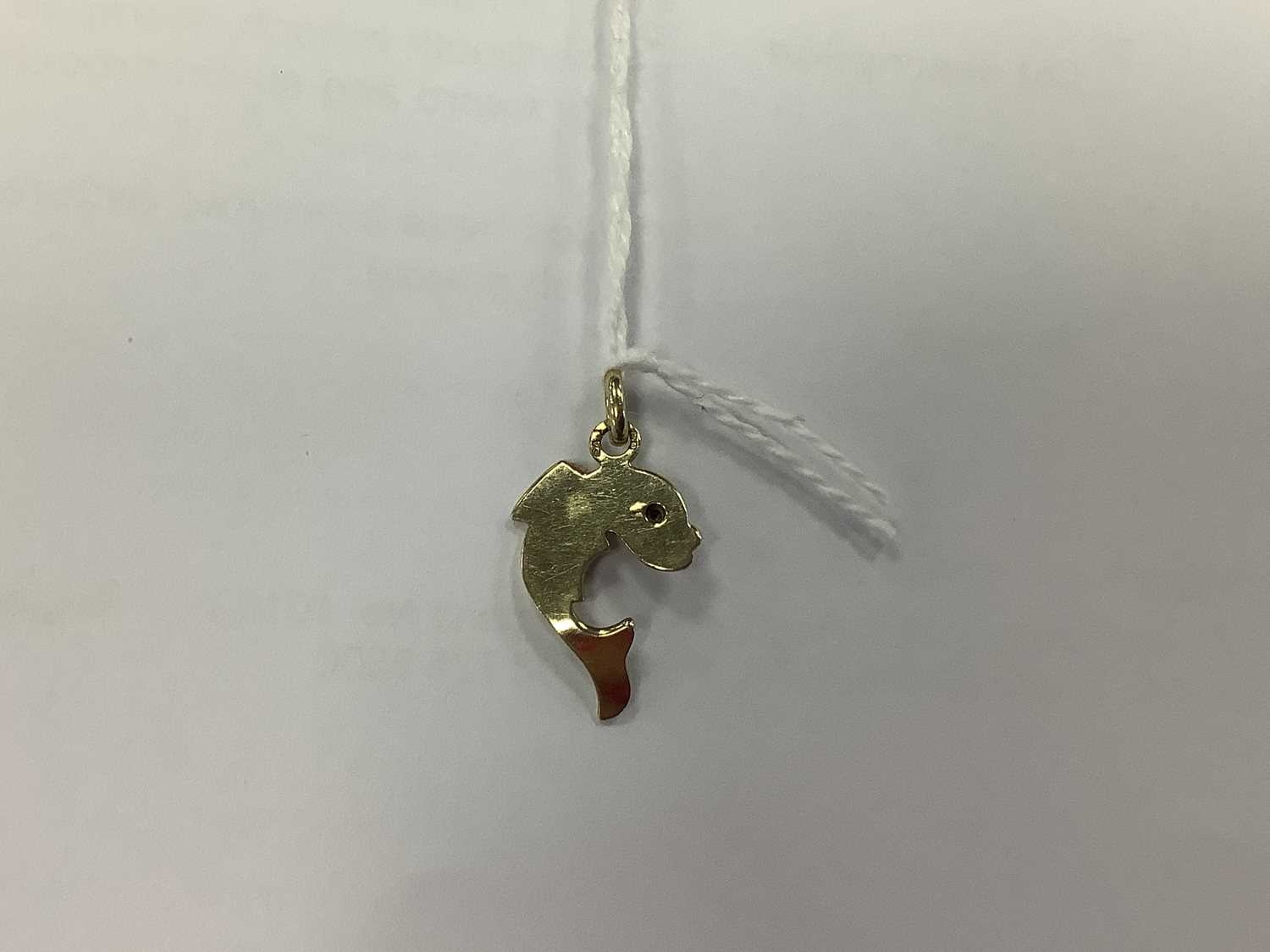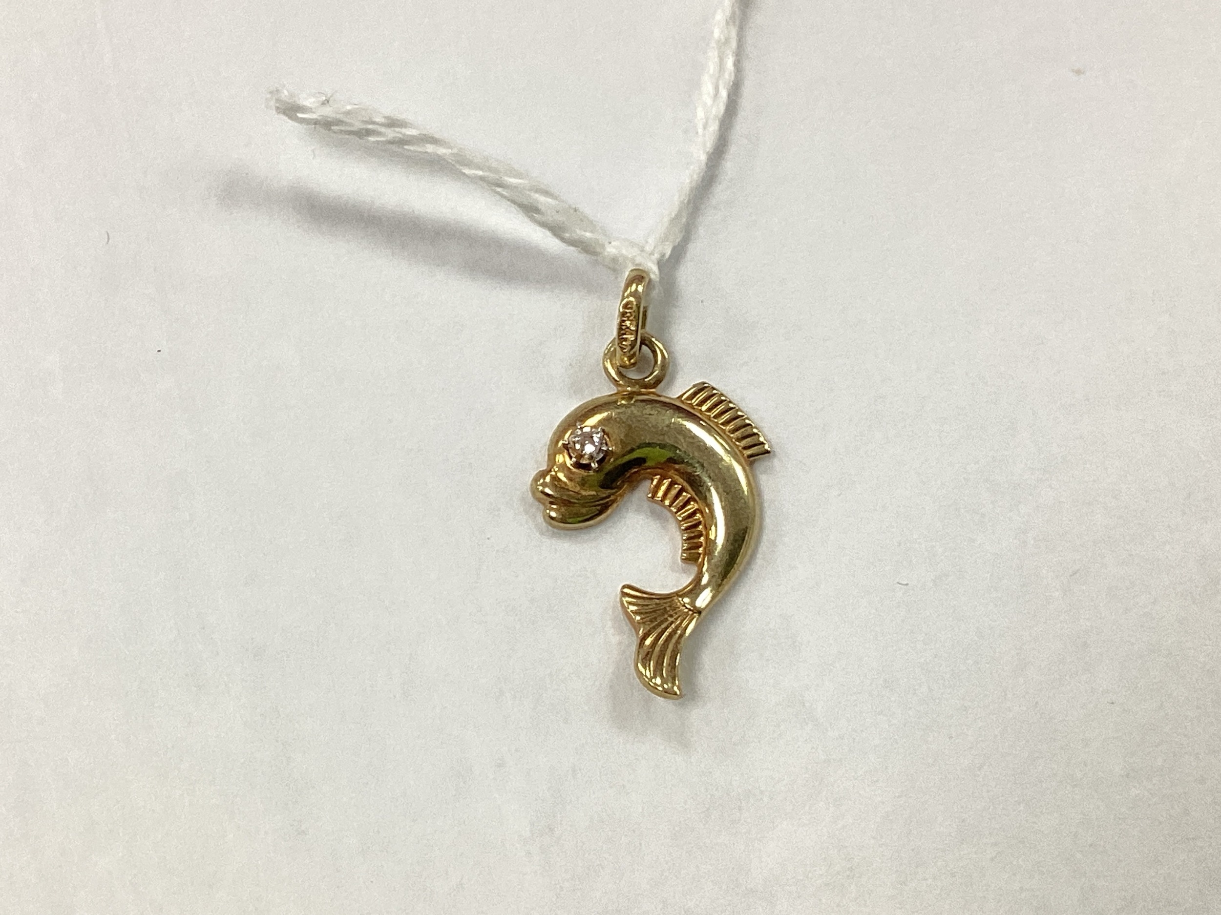 A Novelty Fish Pendant / Charm, claw set eye detail, textured fins and flicked tail, stamped "375" (1.6grams).