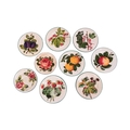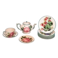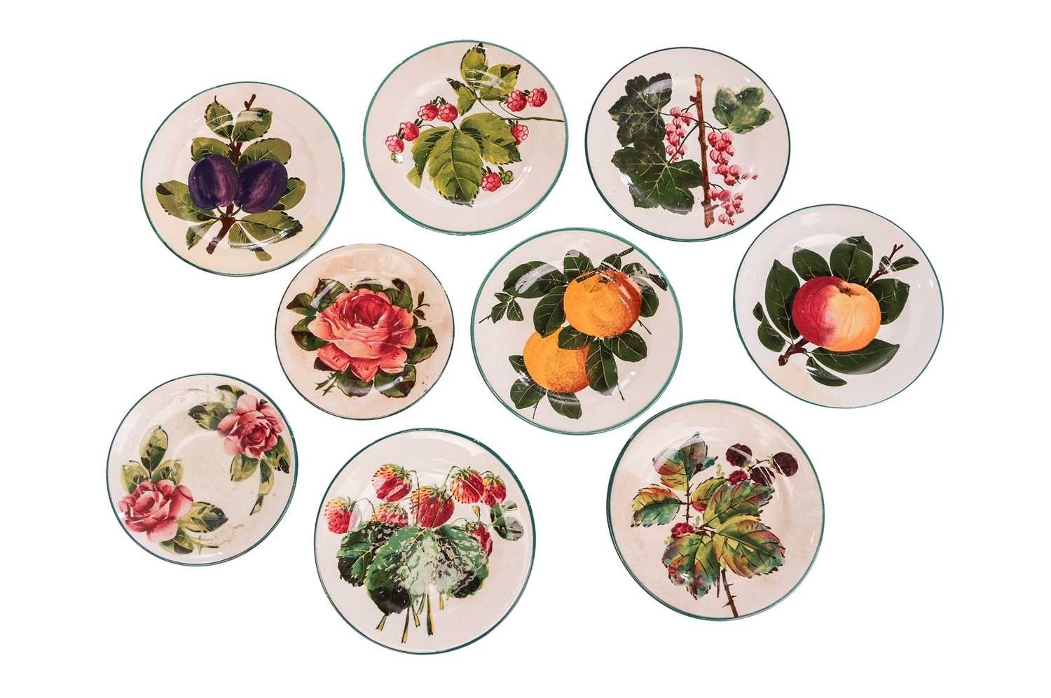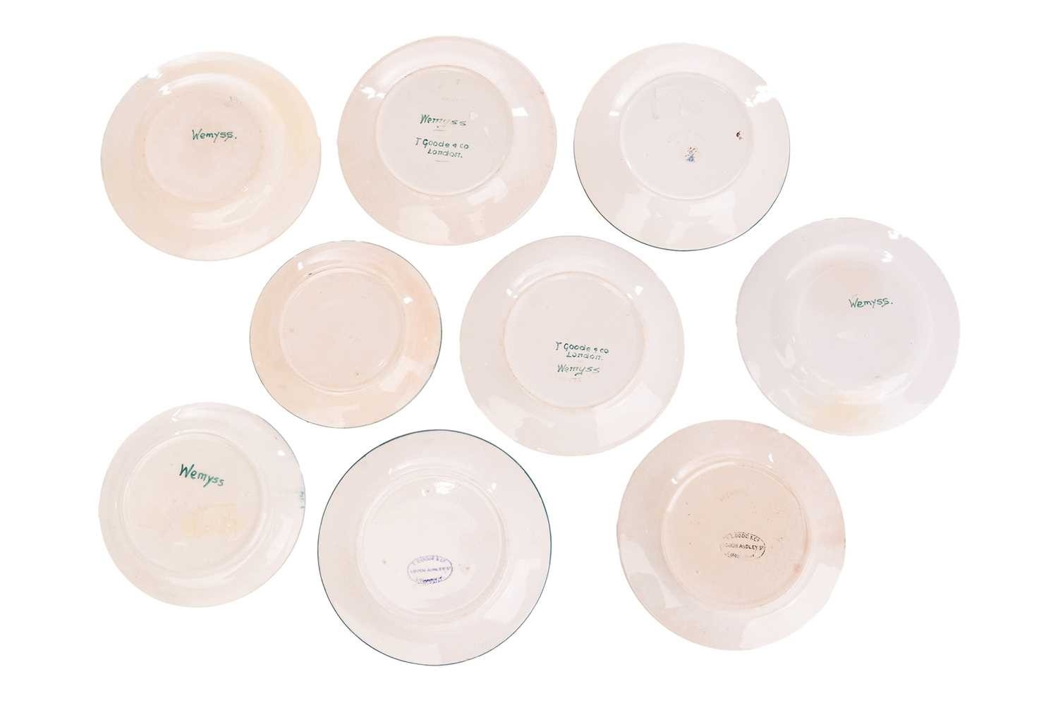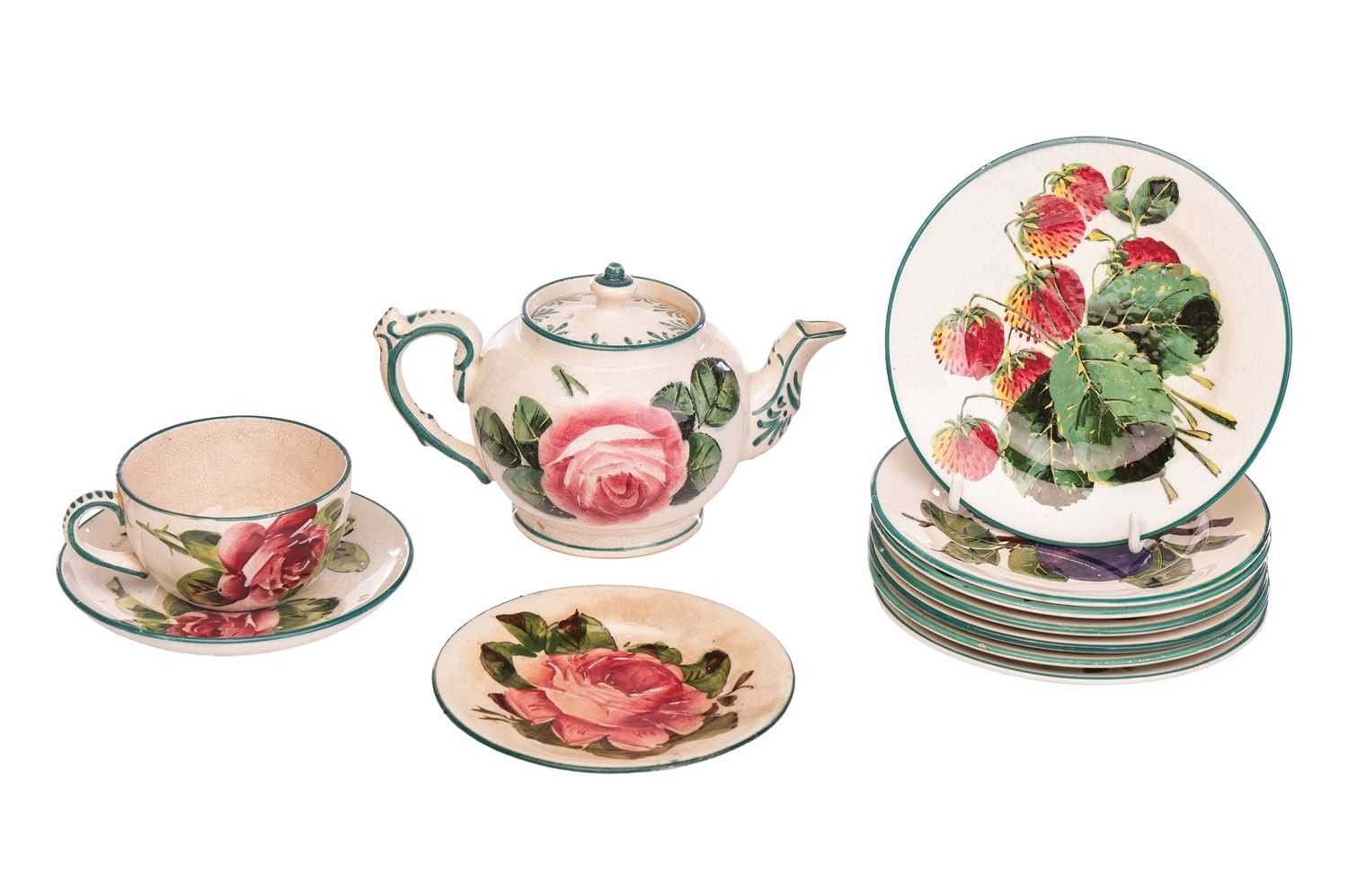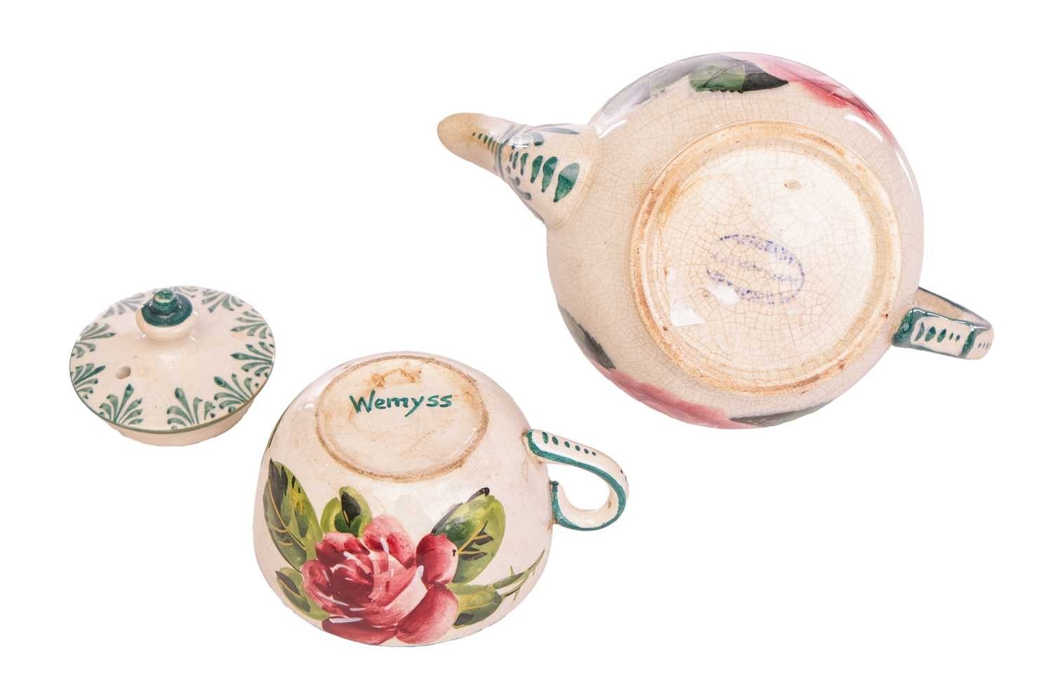 A collection of Wemyss Ware, comprising a teapot, cup, saucer and sideplate, in the Cabbage Rose pattern, (teapot 10 cm high), together with seven assorted sideplates with fruit decoration, 14 cm diameter. Restoration to the teapot. Extensive crazing to all pieces, with some further evidence or restoration.