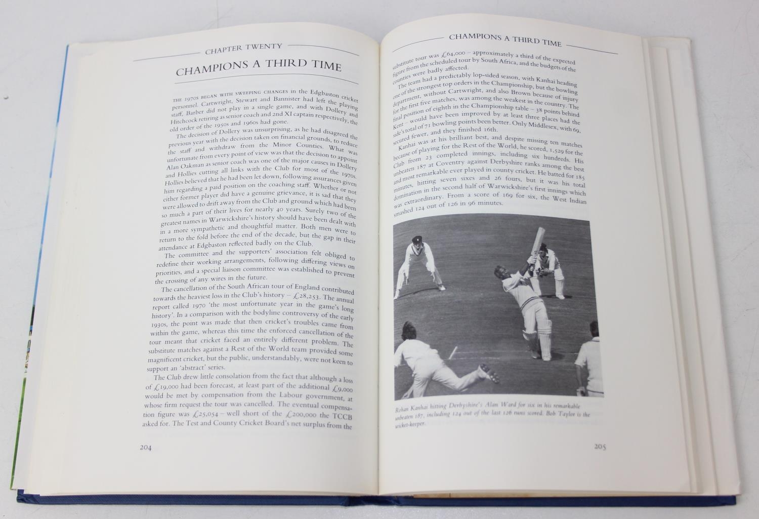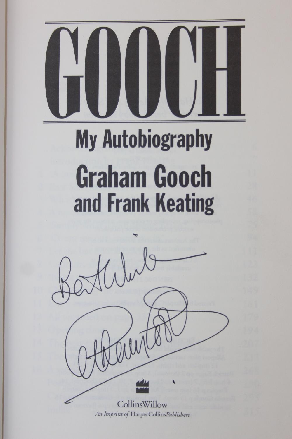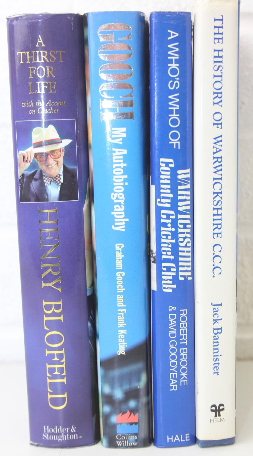 Autographs; Cricketers - Books about cricket, with approximately 40 autographs, mostly cricketers, to include signed by the author copies of 'A Thirst for Life' by Henry Blofeld and 'Gooch' by Graham Gooch and extensively signed Warwickshire County Cricket Club book [4]