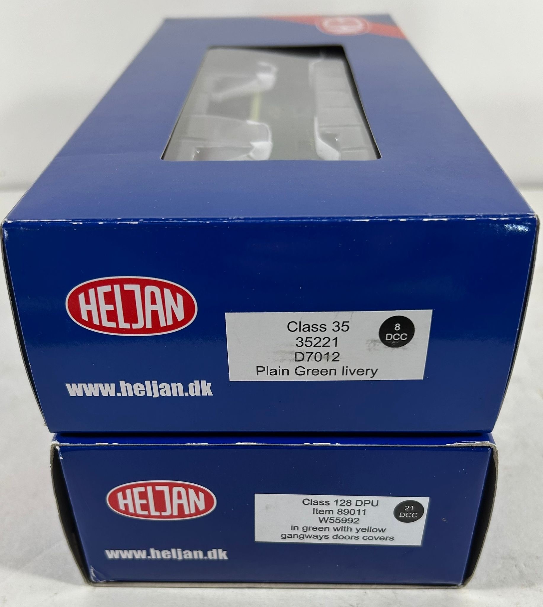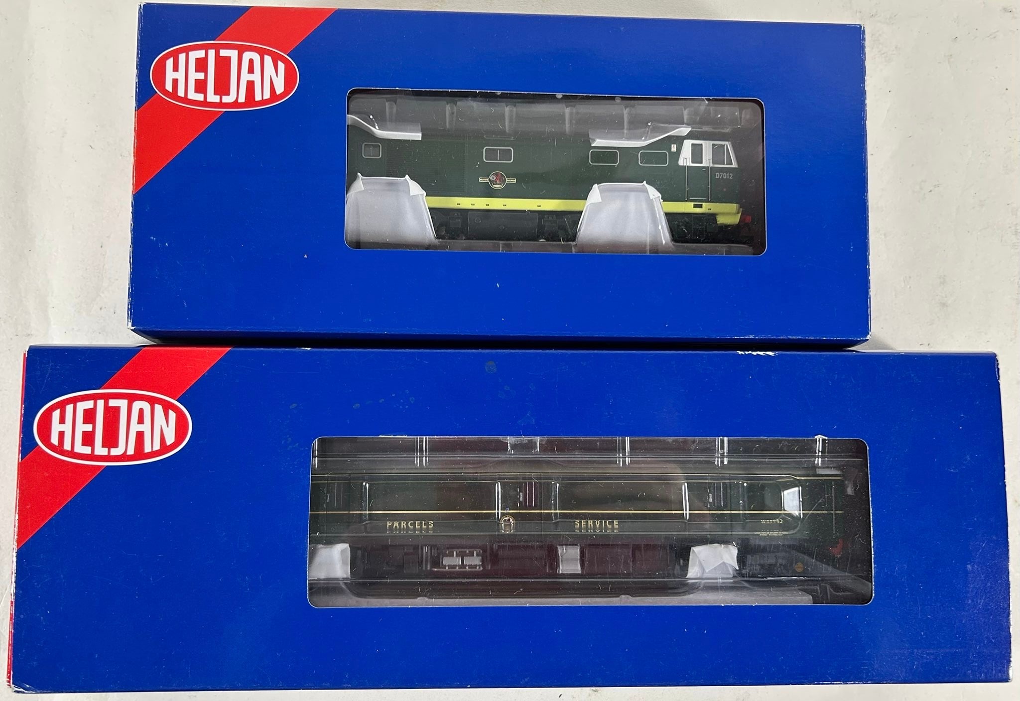 2 Heljan OO Locomotives. A BR Class 128 DPU W55992 (89011) in BR dark green livery 'Parcels Service'. Plus a BR Class 35 Bo-Bo diesel hydraulic D7012 (35221). Both boxed. Contents VGC-Mint.