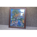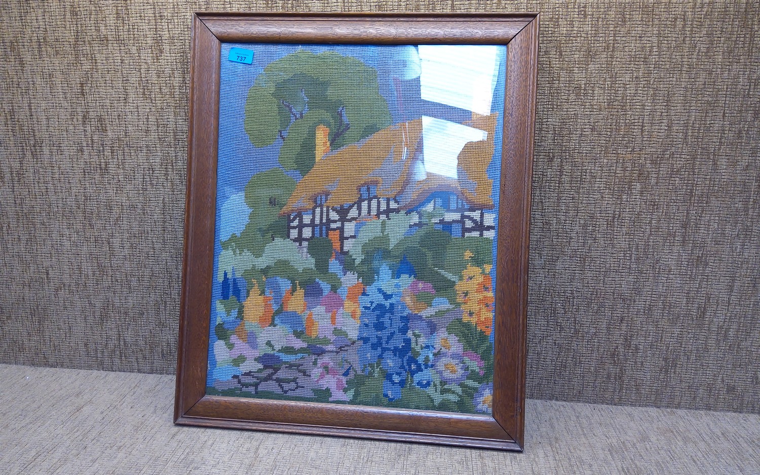 Framed sampler of a cottage scene 66cm x 54cm.