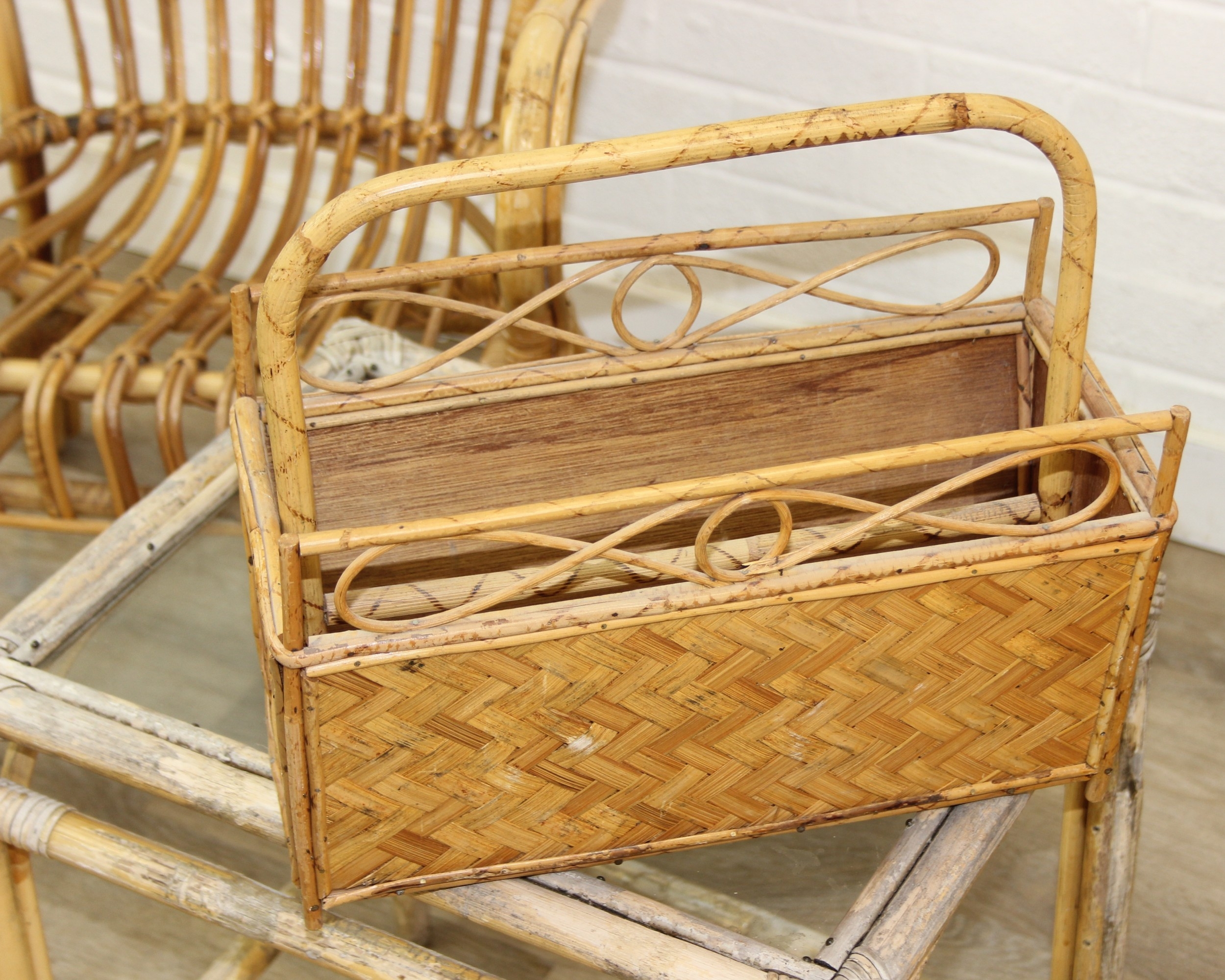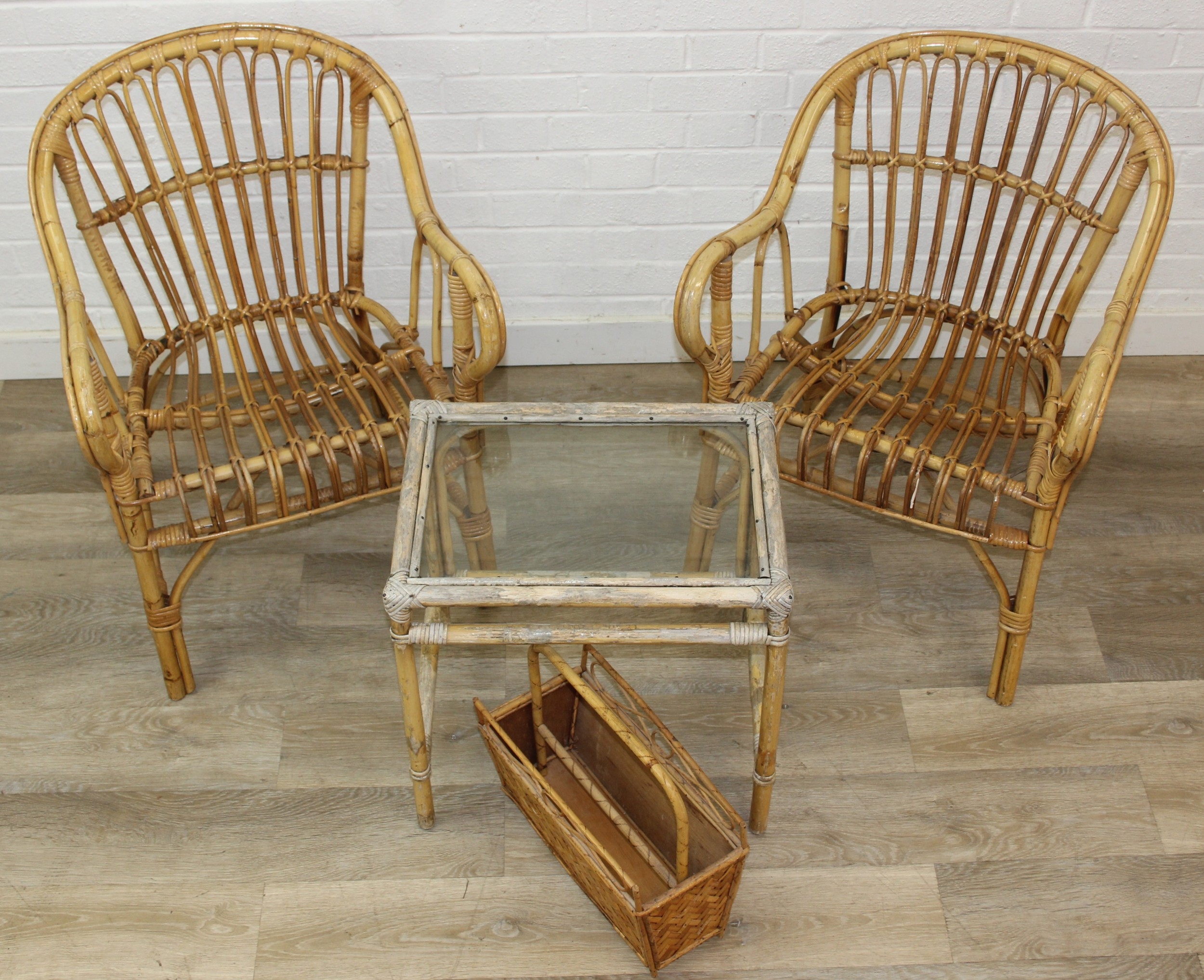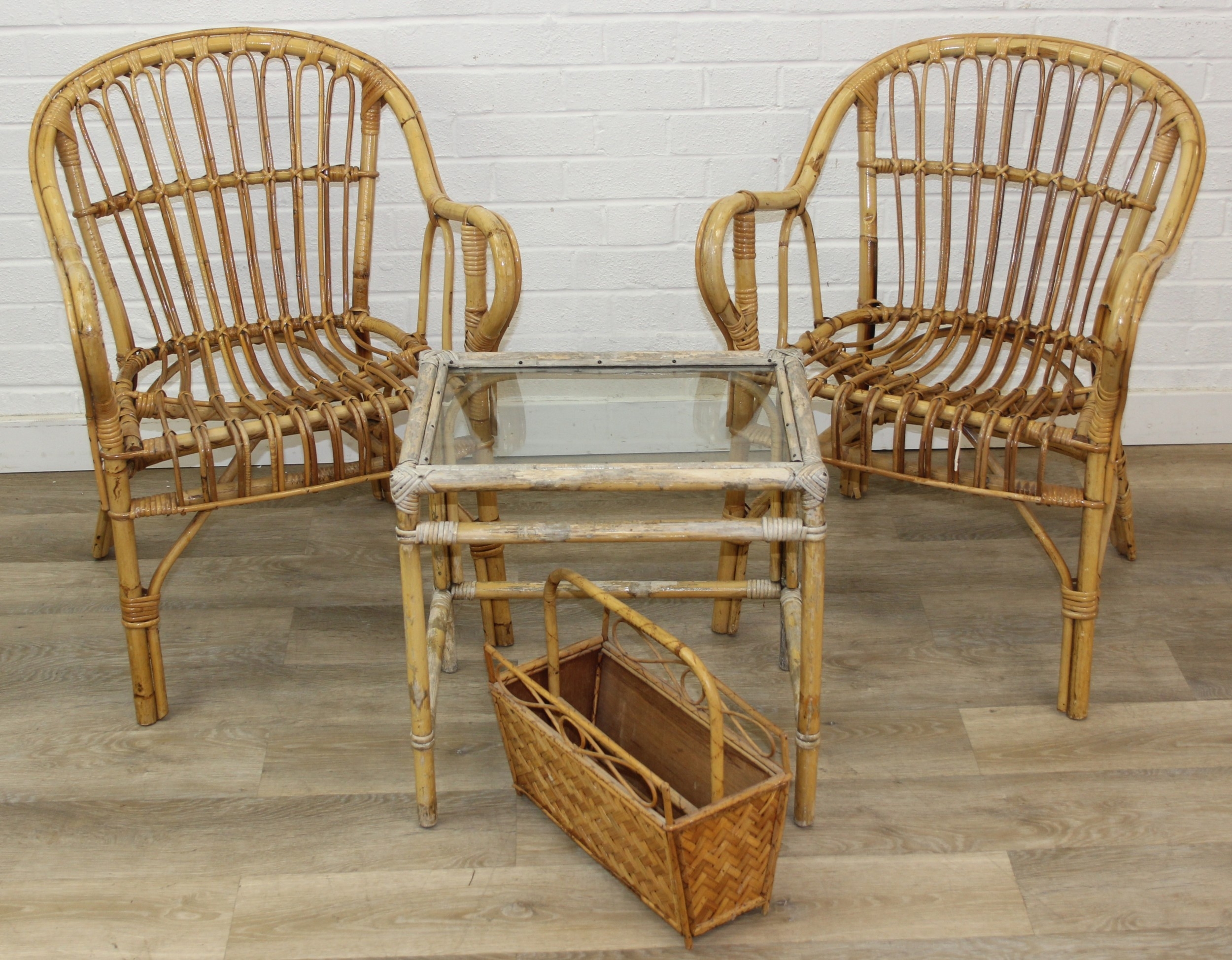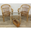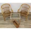 Four pieces of bamboo furniture to inc a pair of armchairs in the manner of Franco Albini, a small glass topped coffee table and a magazine rack, the chairs 57cm wide x 75cm tall [4 pieces]