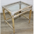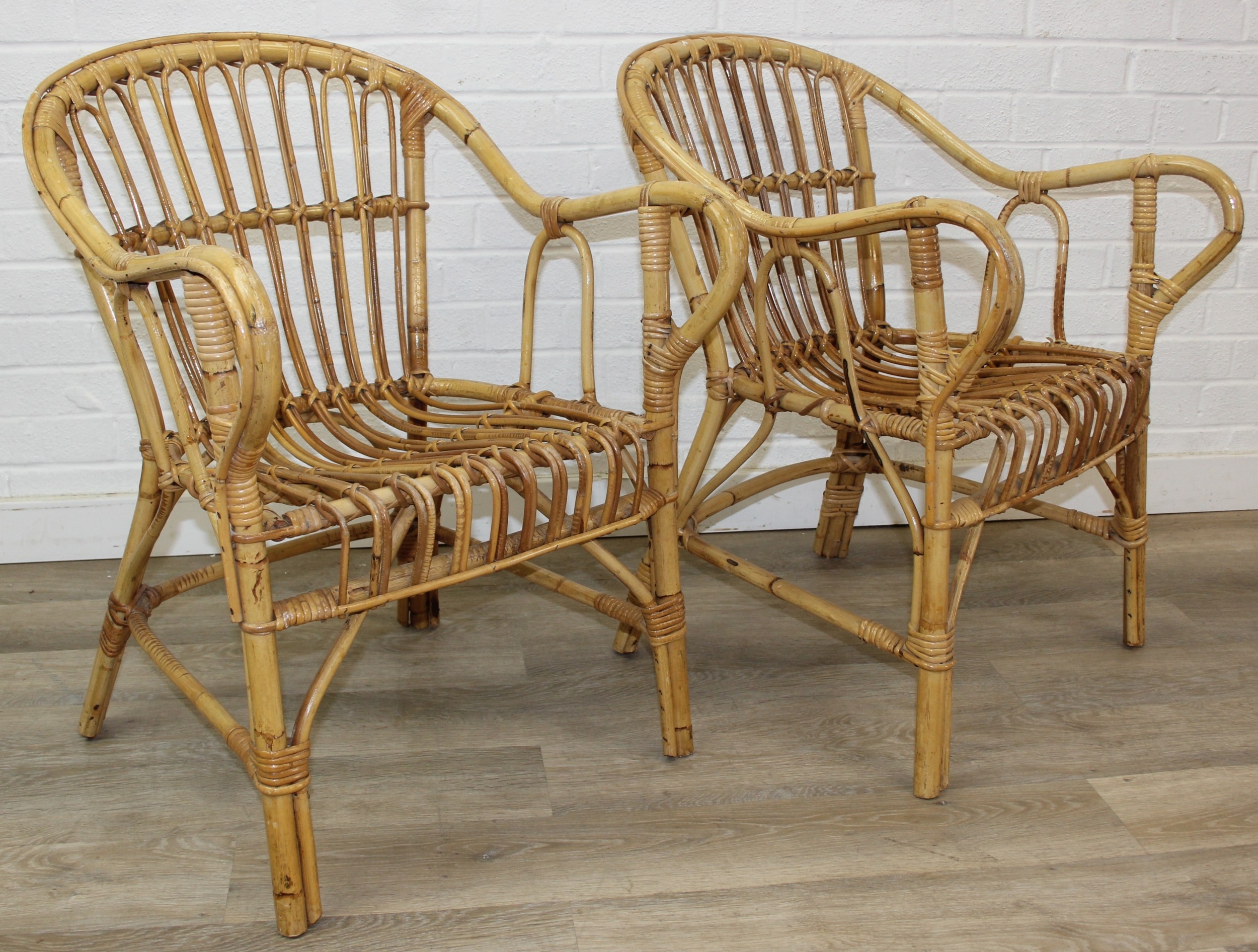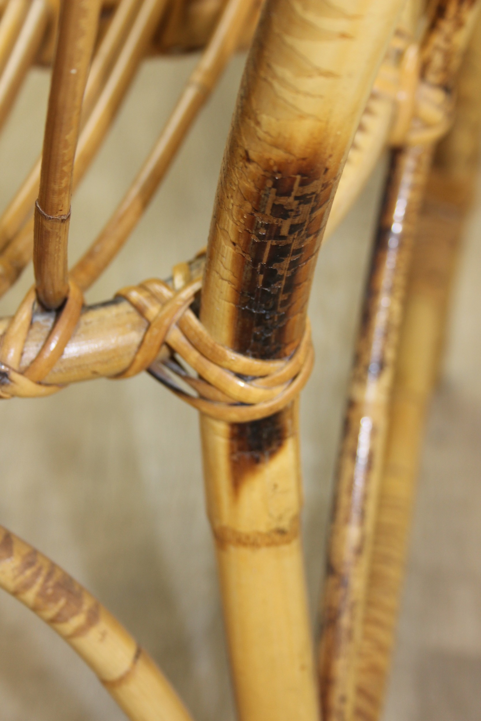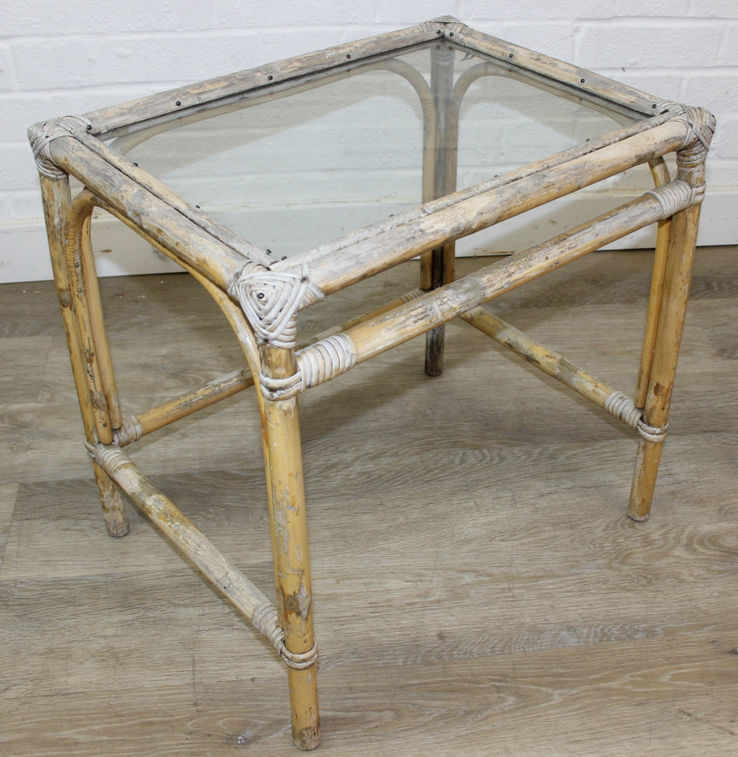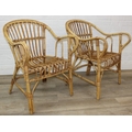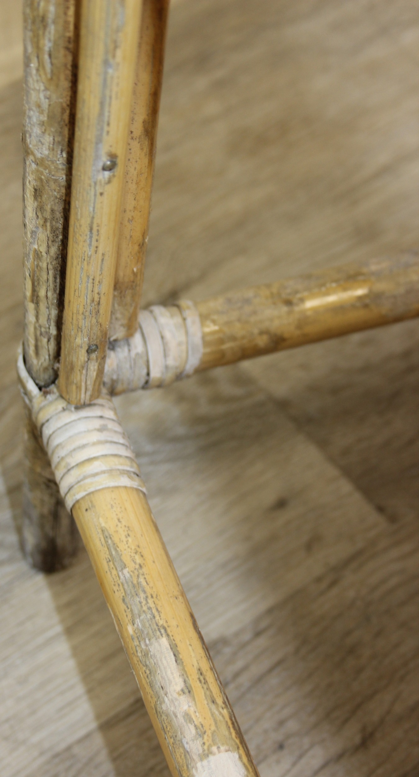 Four pieces of bamboo furniture to inc a pair of armchairs in the manner of Franco Albini, a small glass topped coffee table and a magazine rack, the chairs 57cm wide x 75cm tall [4 pieces]