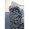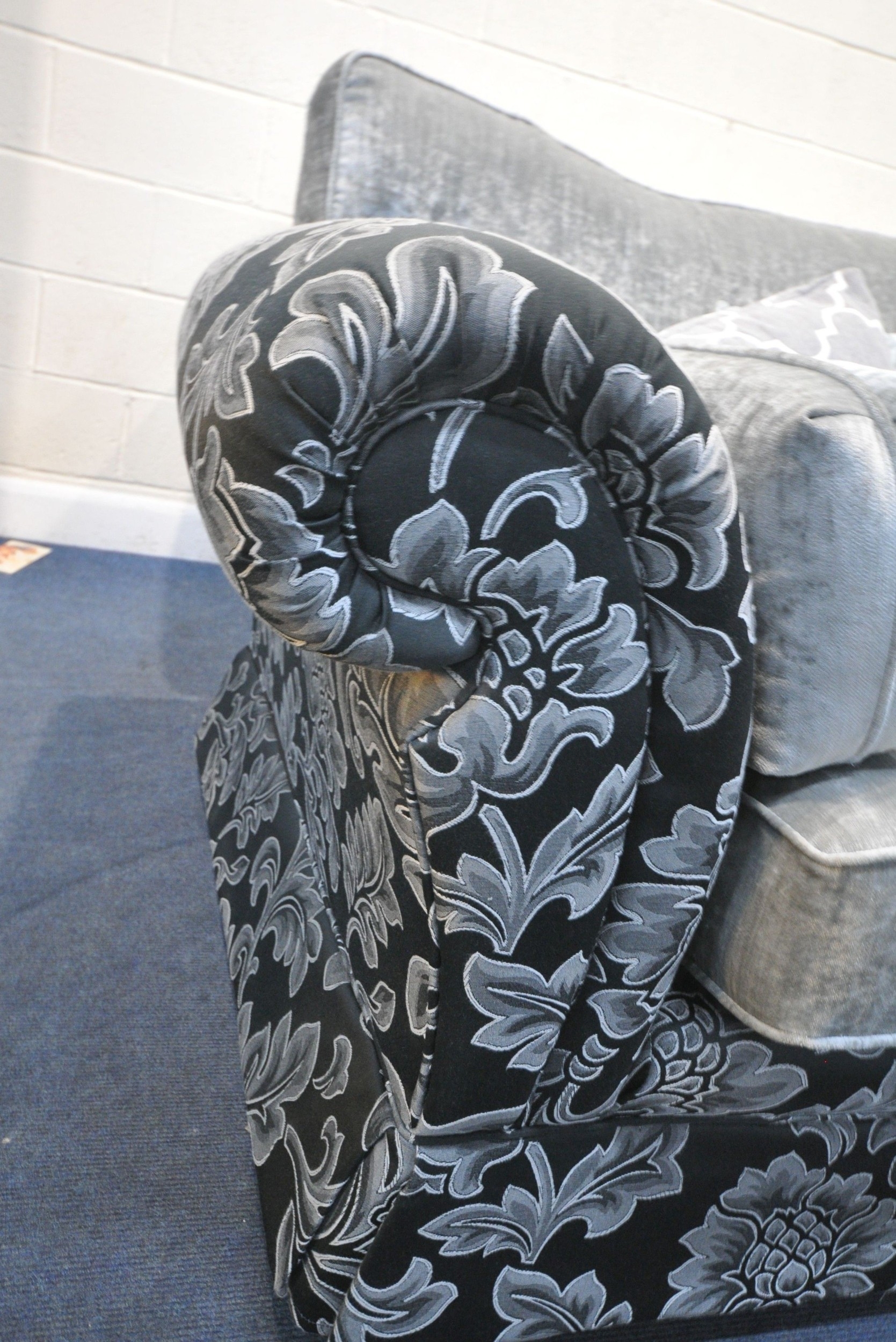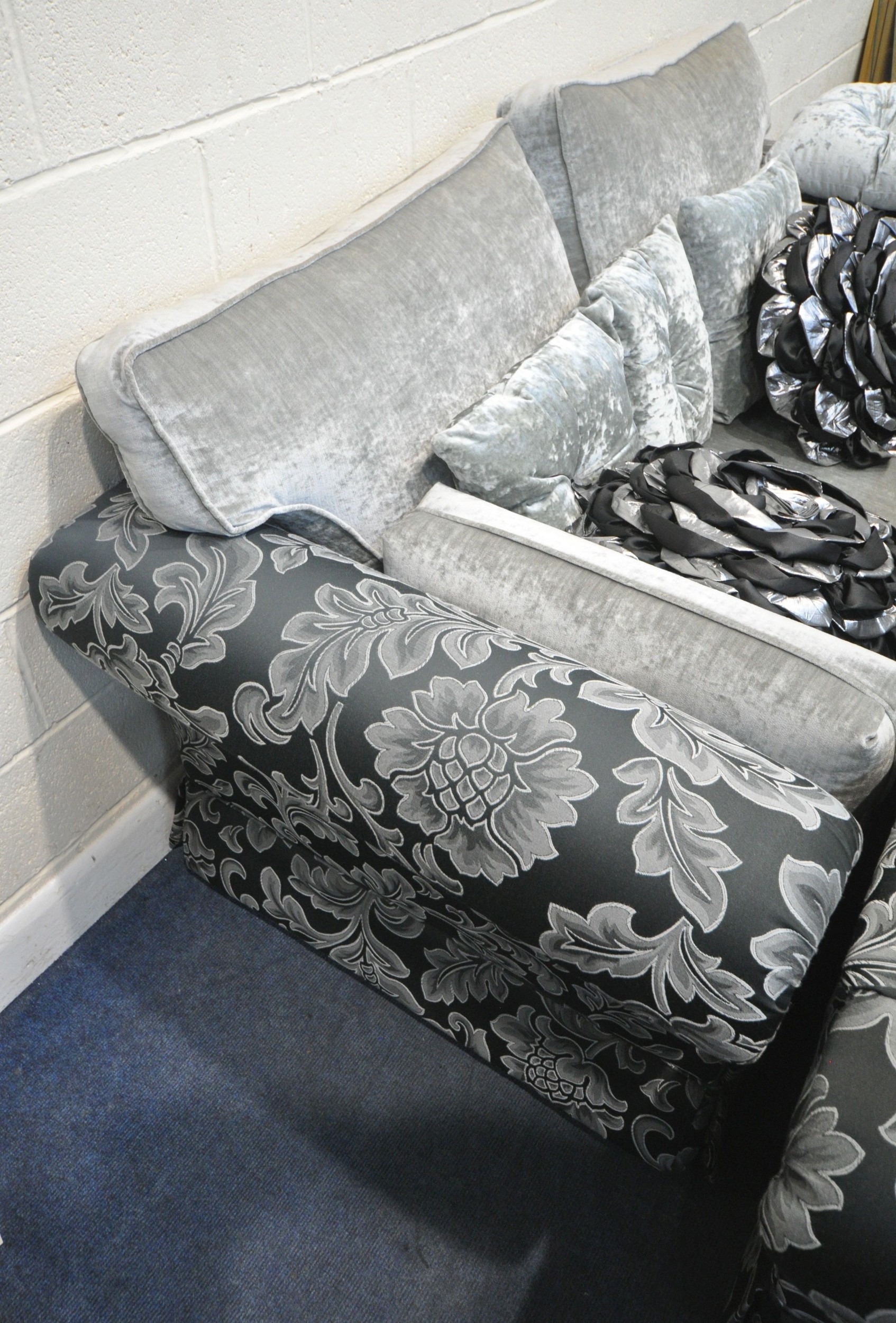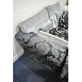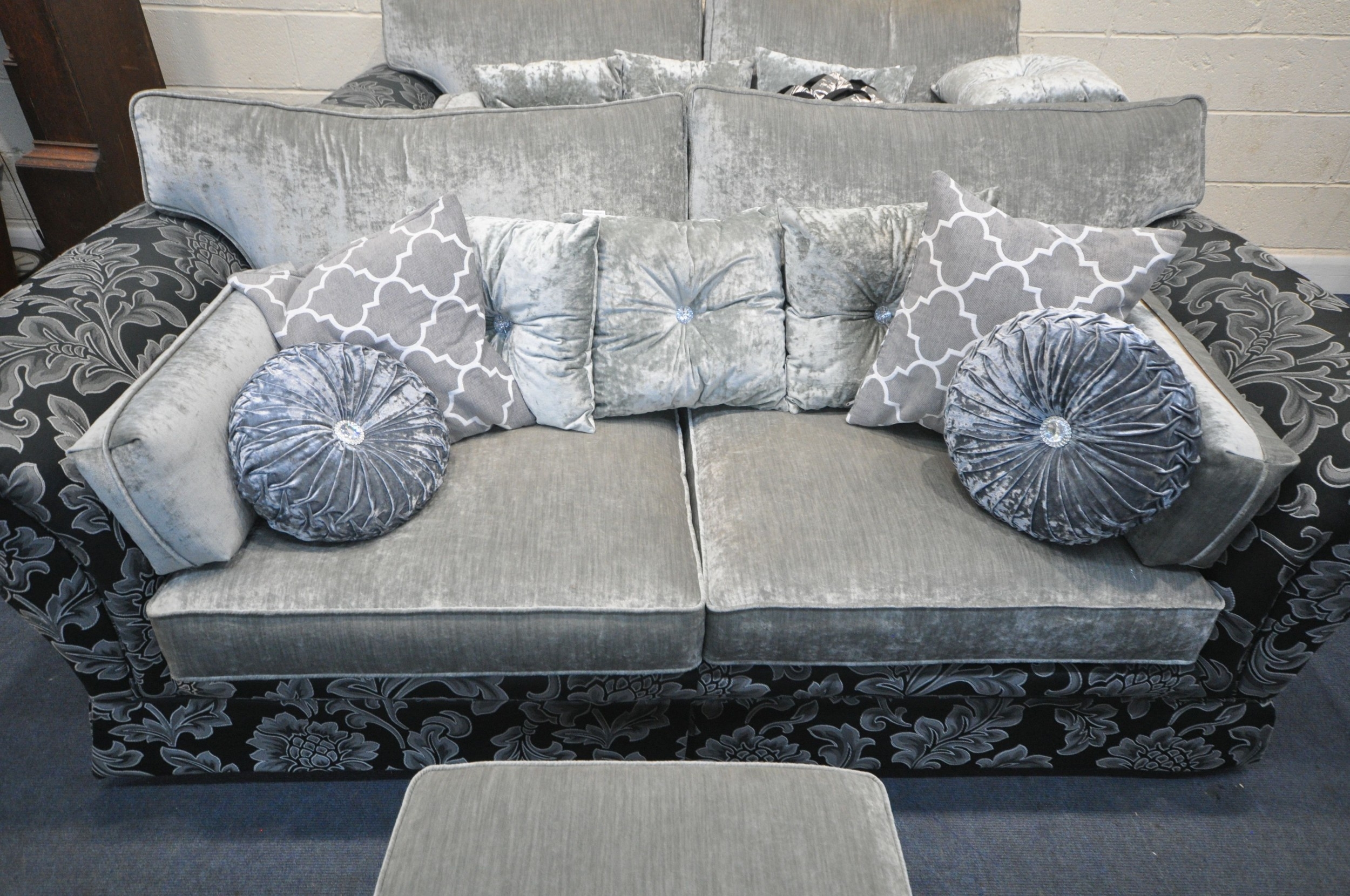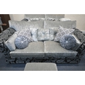 A BLACK AND FOLIATE LARGE TWO SEATER SOFA, length 233cm x depth 99cm x height 94cm, a slightly smaller sofa, along with a pouffe, condition report: large quantity of assorted scatter cushions, general signs of usage, fire labels to inner padding (3)