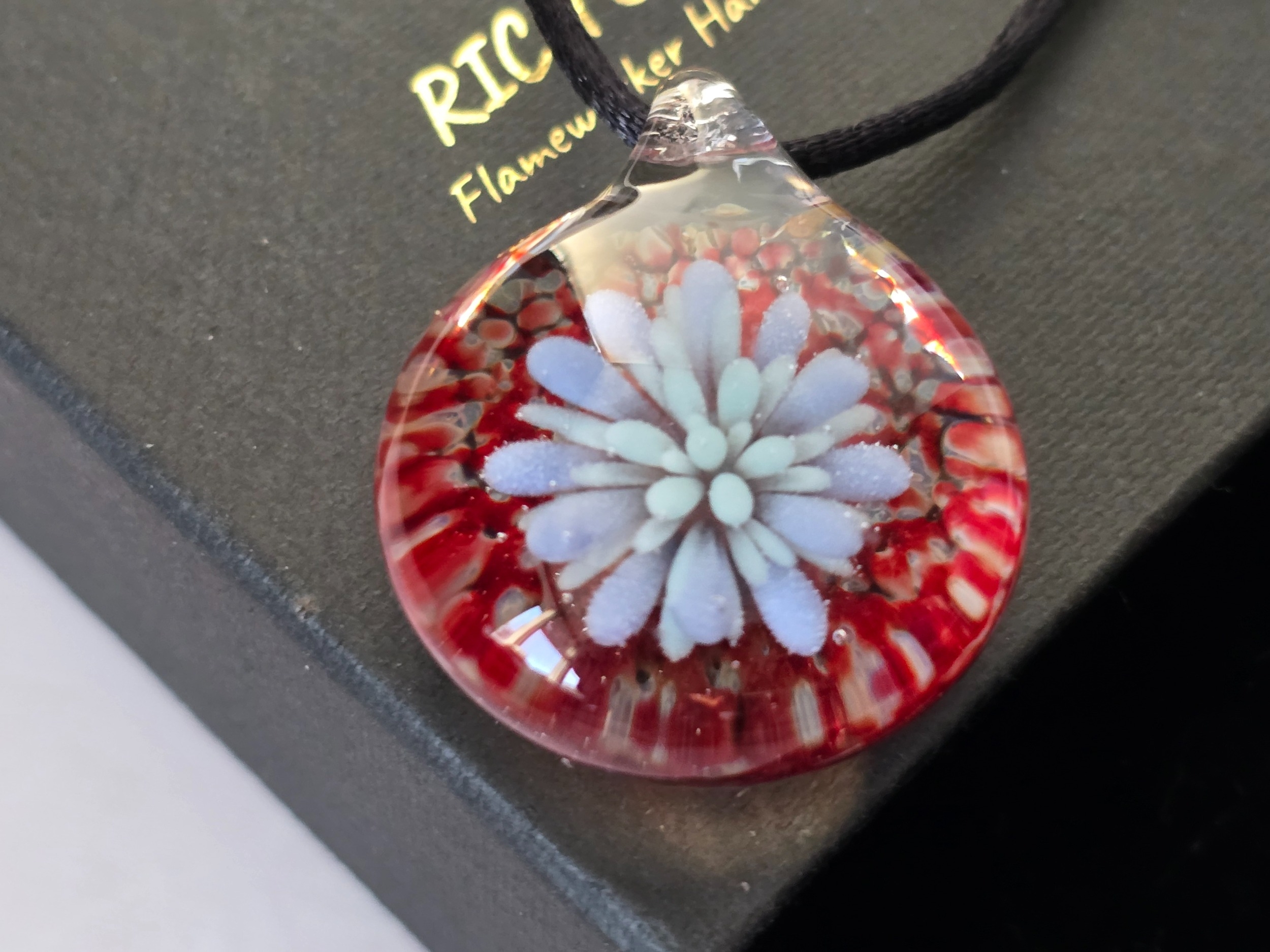 Pendant/necklace Paperweight glass jewellery/jewelry. Attractive flameworked piece hand made by Rich Evans, Stourbridge. Inc.neckstrap.Excellent condition 31mm across