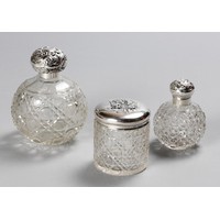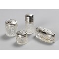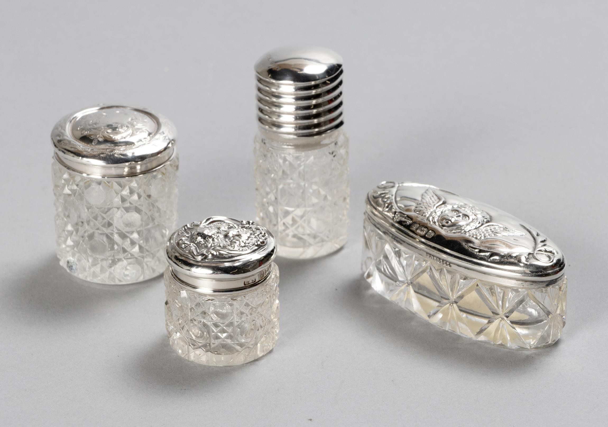 Comprising: An Edward VII Silver-Mounted and Glass Scent Bottle, Henry Hobson and Sons, Birmingham, 1903, 7,5cm wide; And an Edward VII Silver-Mounted and Glass Dressing Table Jar, Levi and Salaman, Birmingham, 1905, 3,5cm high; And an Edward VII Silver-Mounted and Glass Dressing Table Jar, possibly William Vale and Sons, Birmingham, 1907, 5,5cm high; And a George V Silver-Mounted and Glass Dressing Table Jar, G and C Ltd, Birmingham, 1915, 4,5cm high