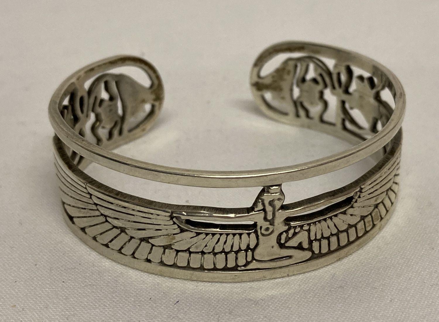 A decorative white metal open work bangle with Egyptian goddess Isis and scarab beetle detail. Indistinct mark to back of bracelet.