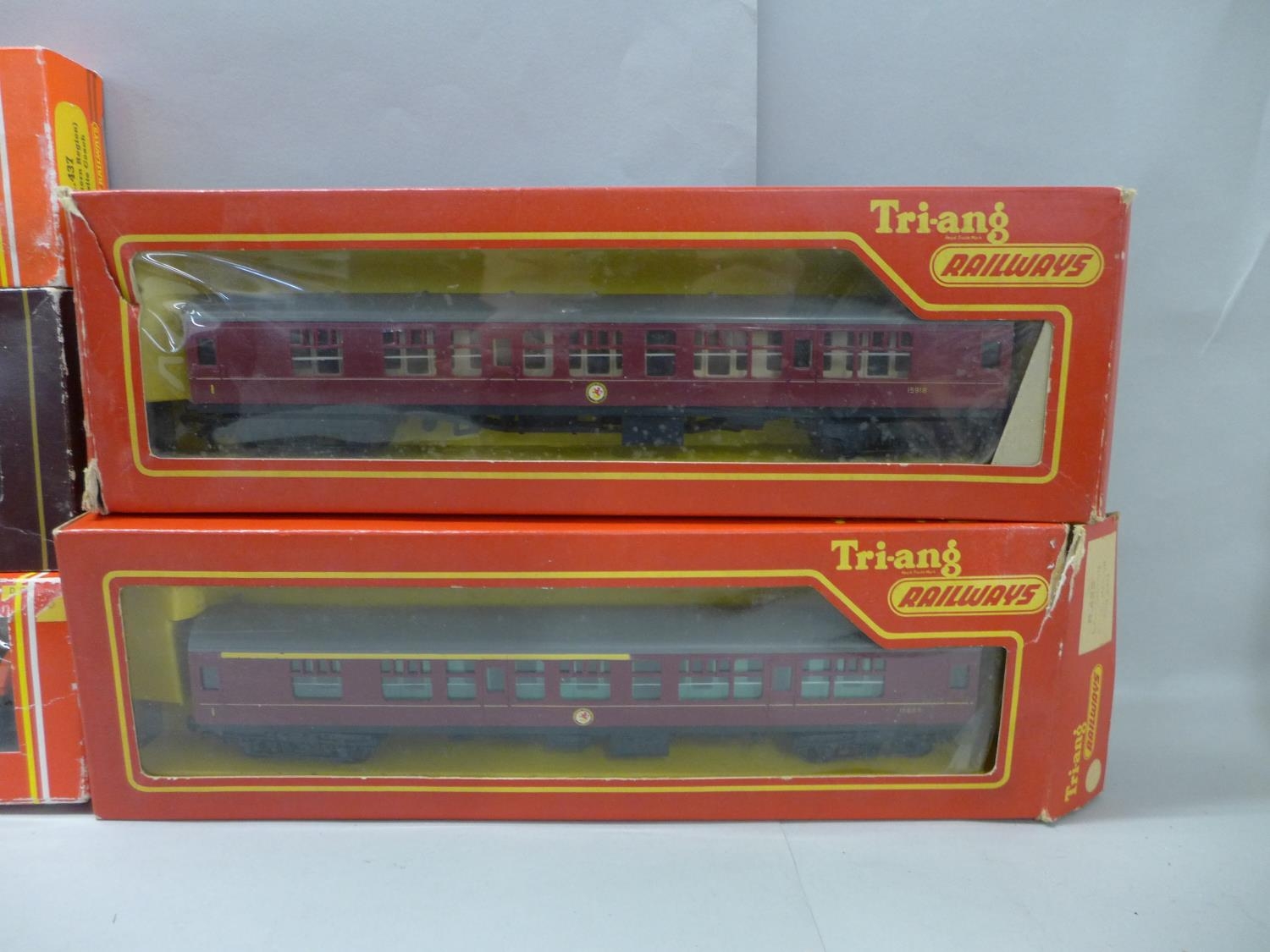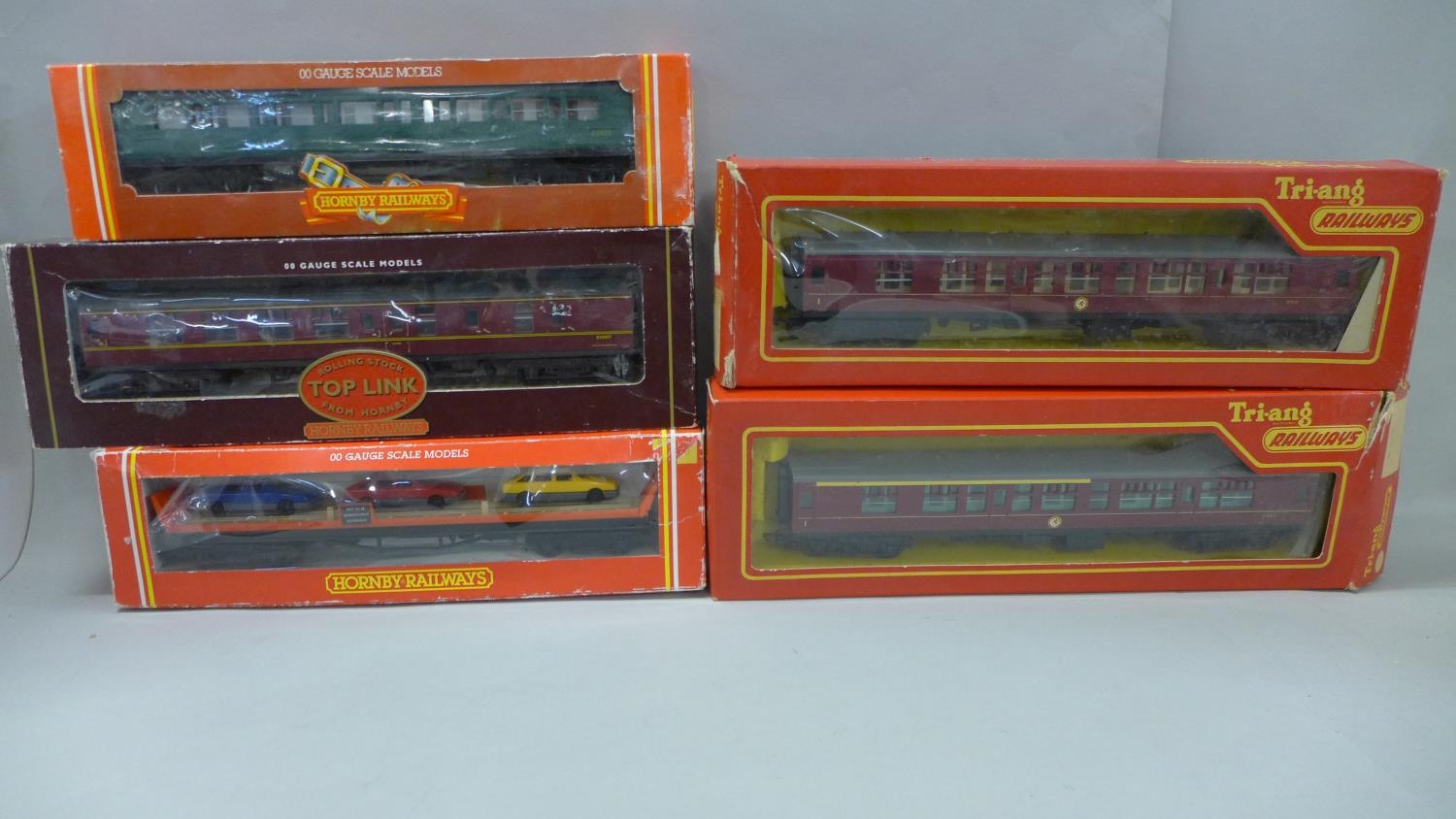 Five Hornby and Tri-ang 00 gauge carriages, boxed