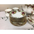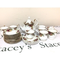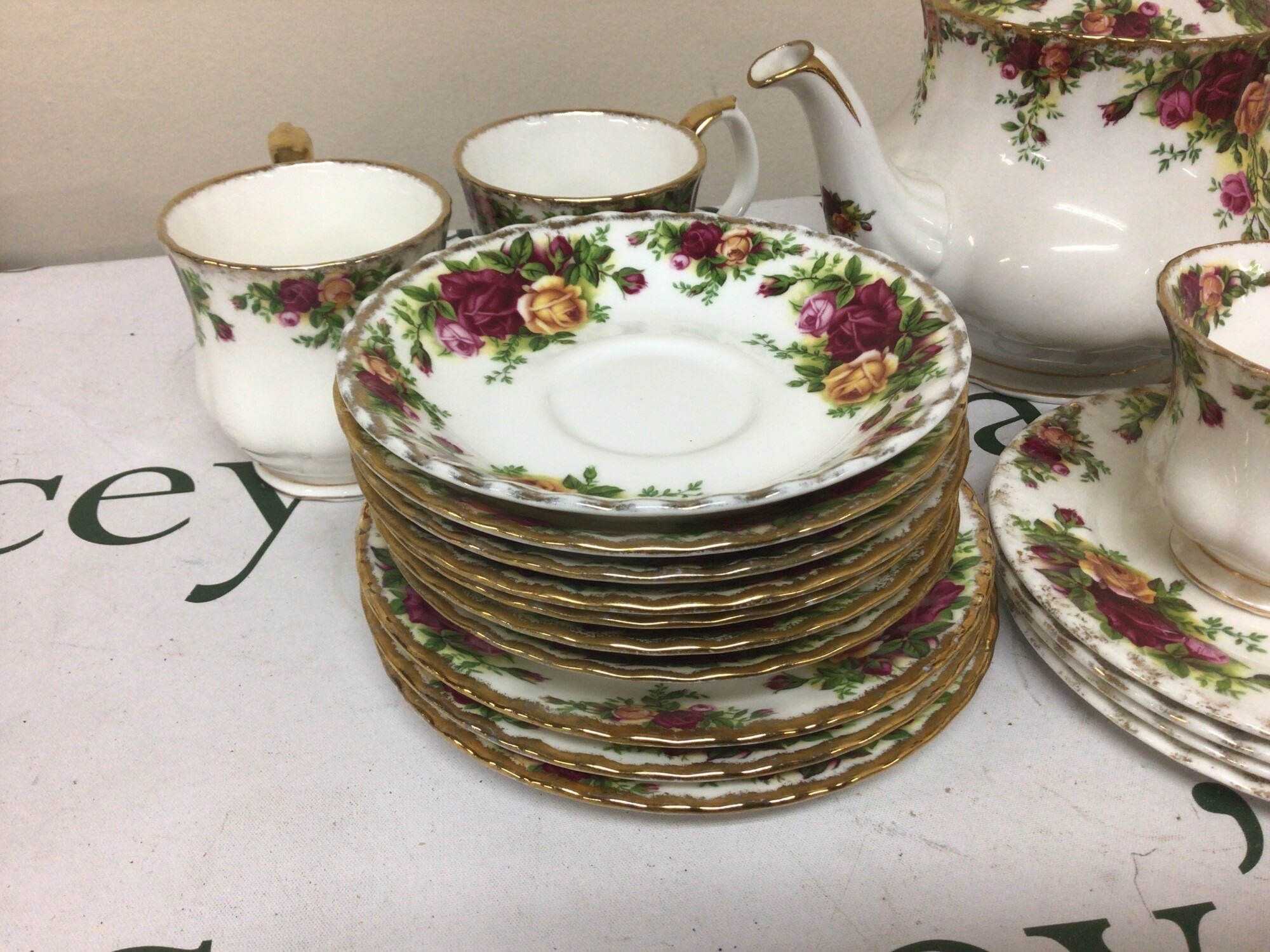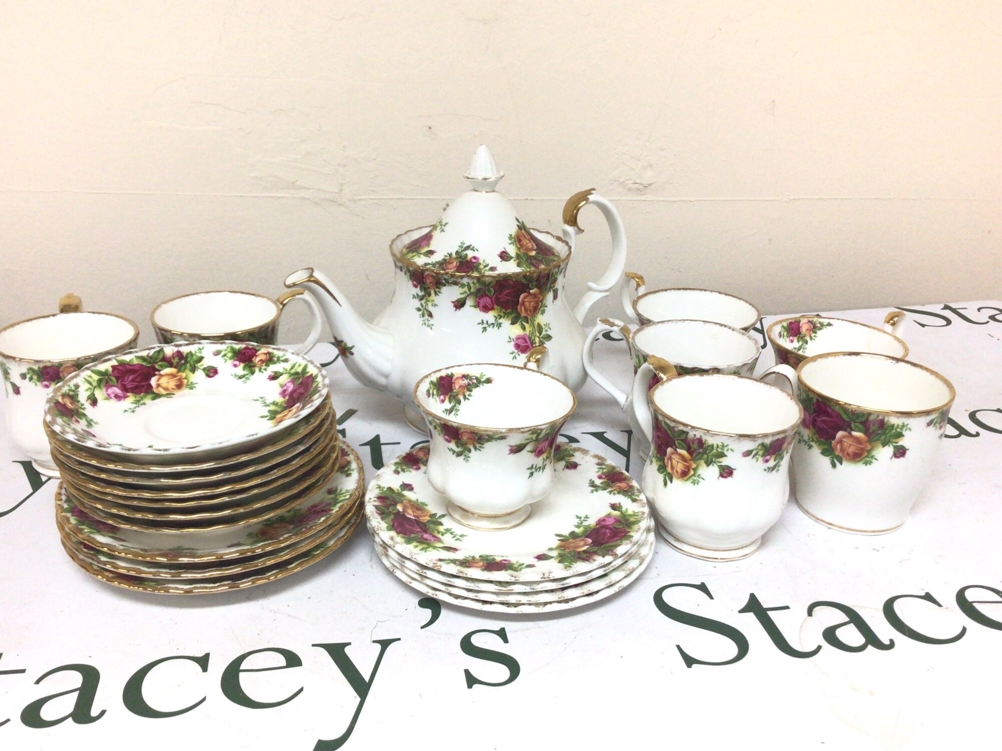 A Collection of Royal Albert old English Country Rose bone china comprising a tea pot coffee cups tea cups side plates and saucers gilding rubbed on some saucer edges.