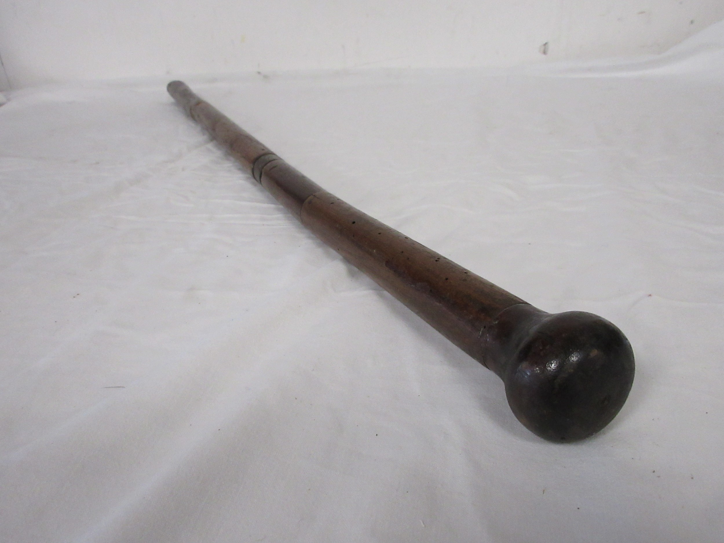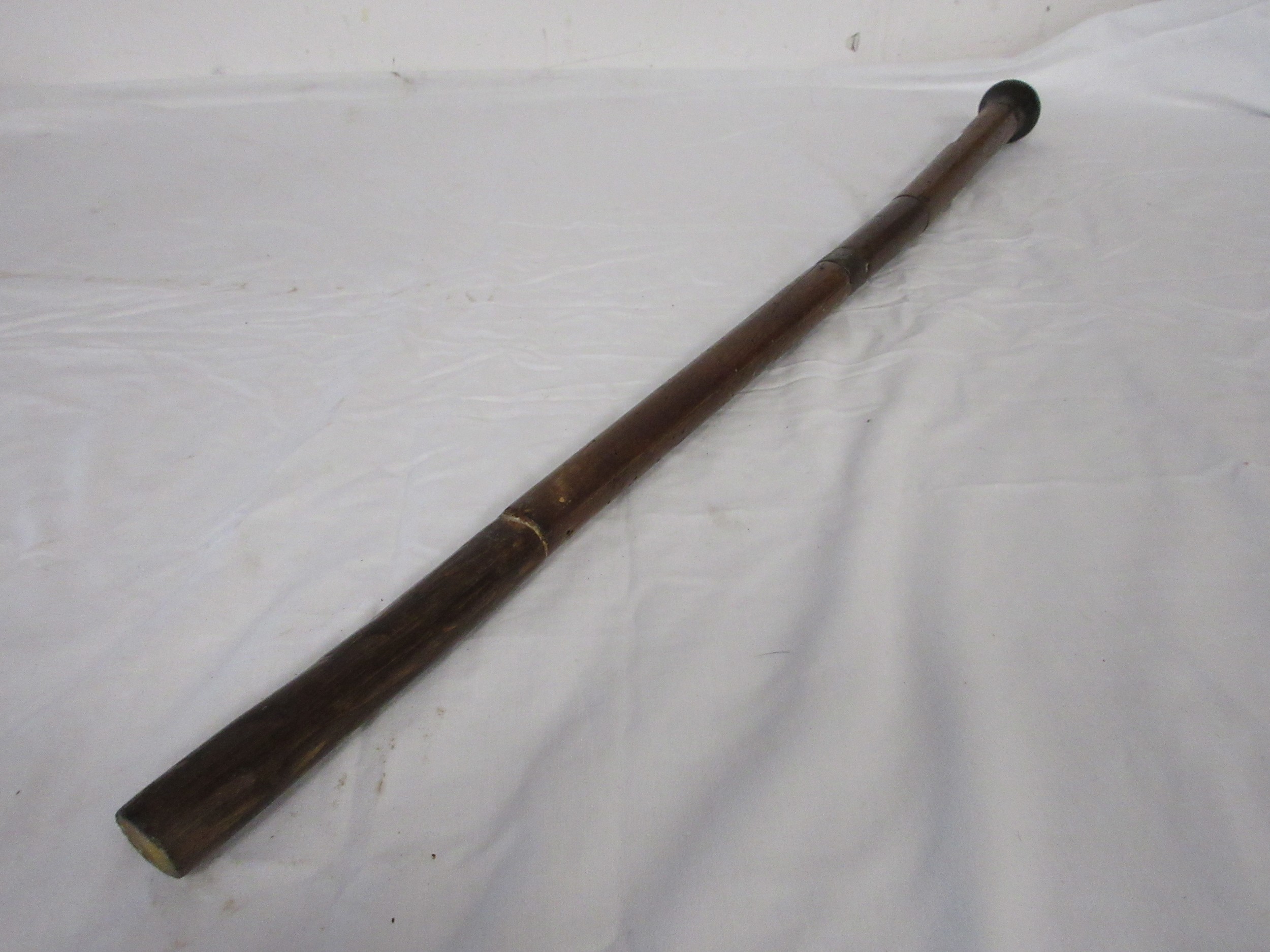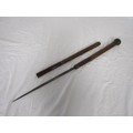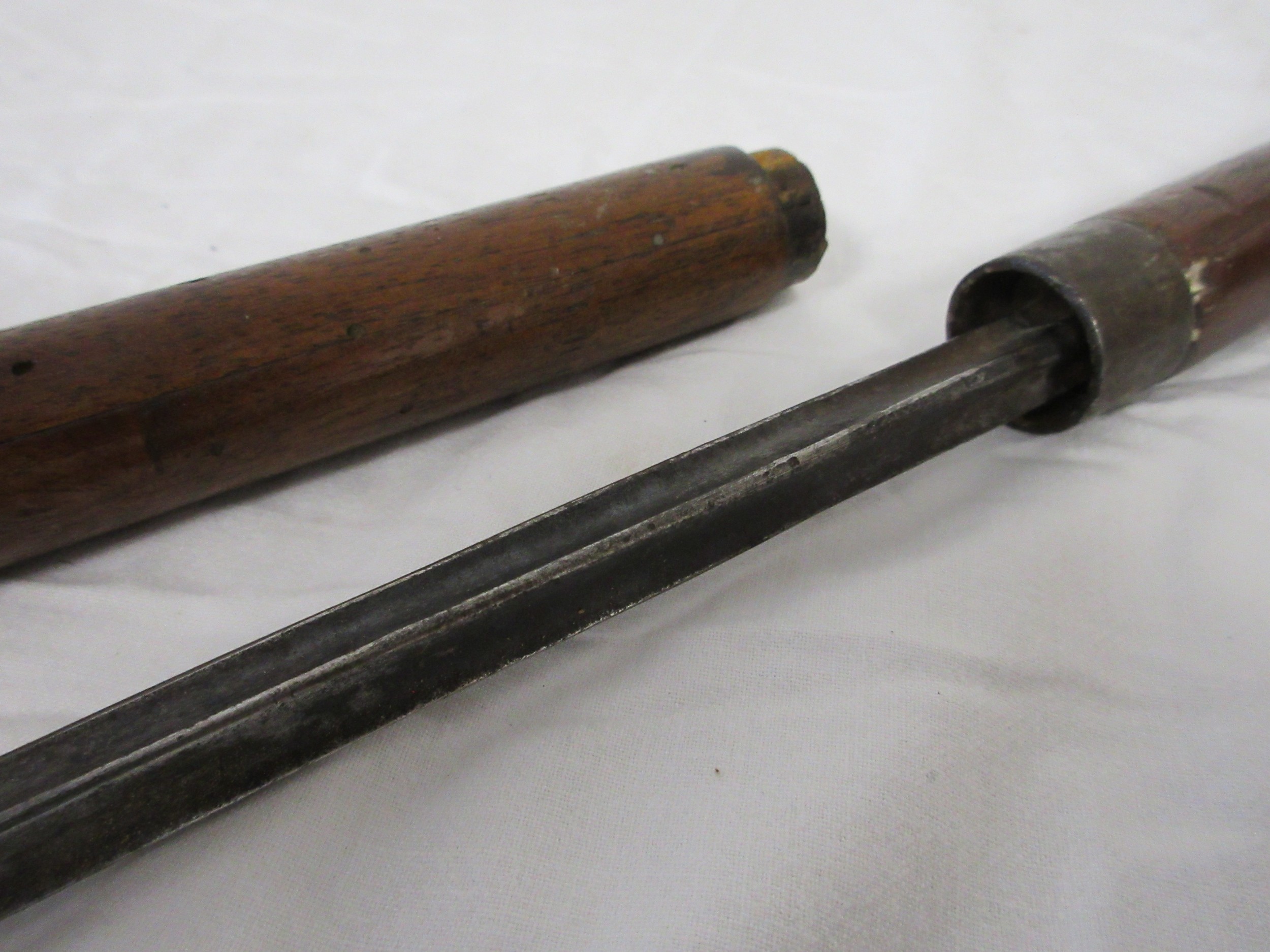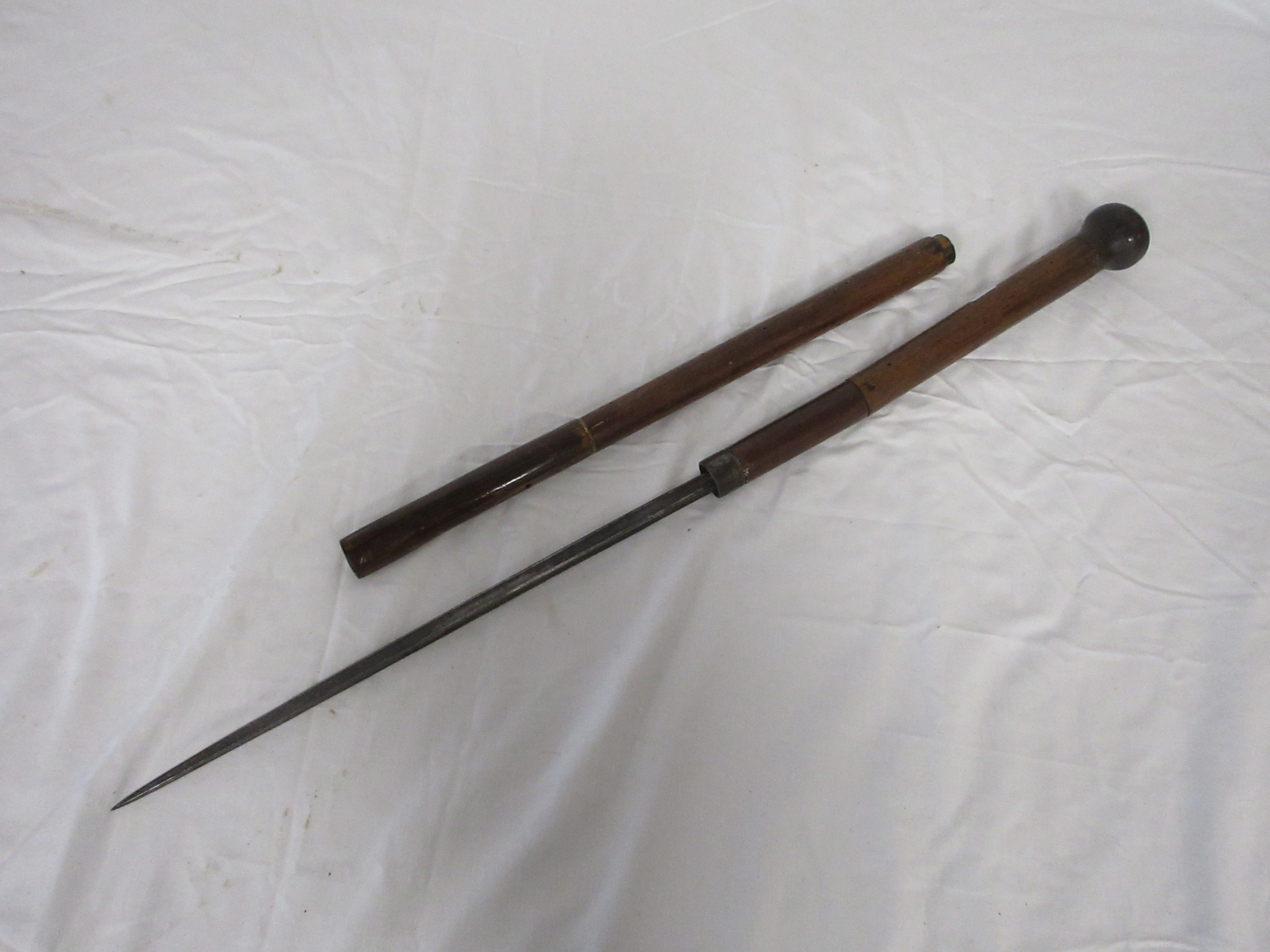 A wooden shafted sword stick with a 36.5cms triangular section blade. Overall length of 72cms
