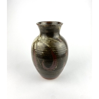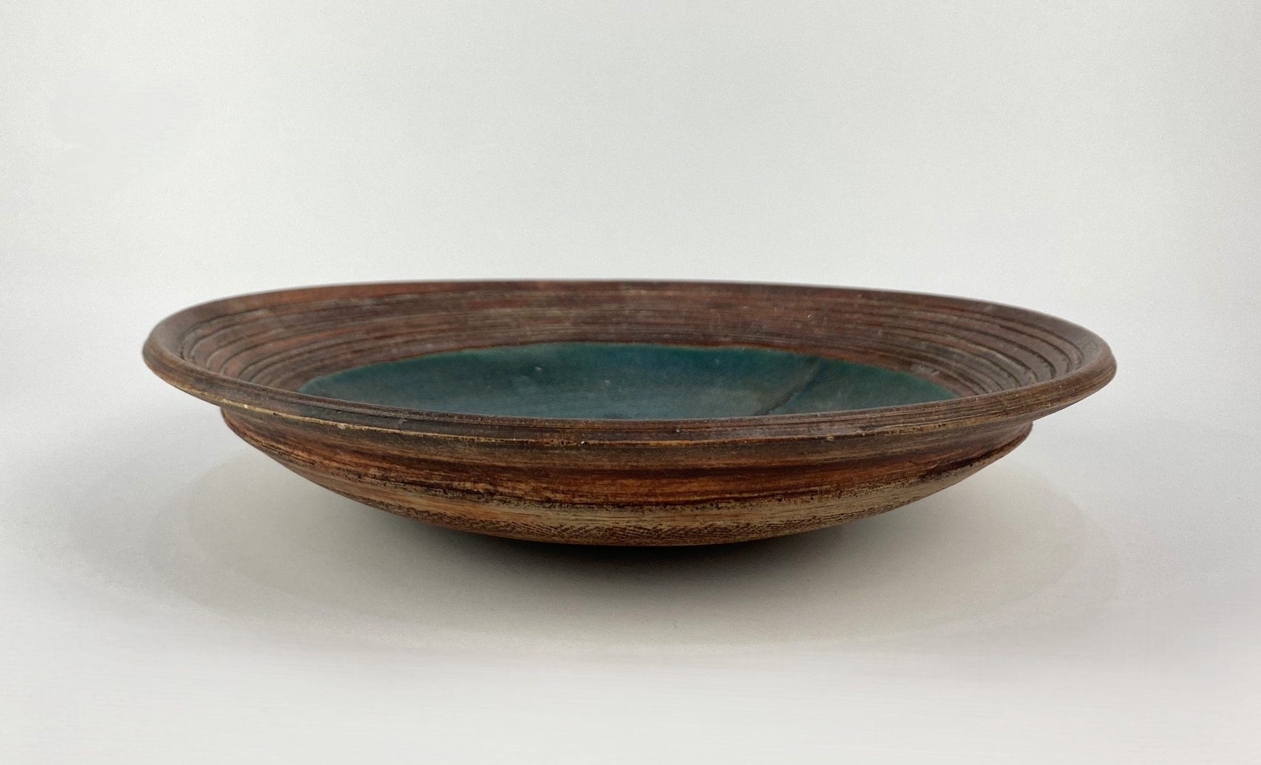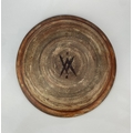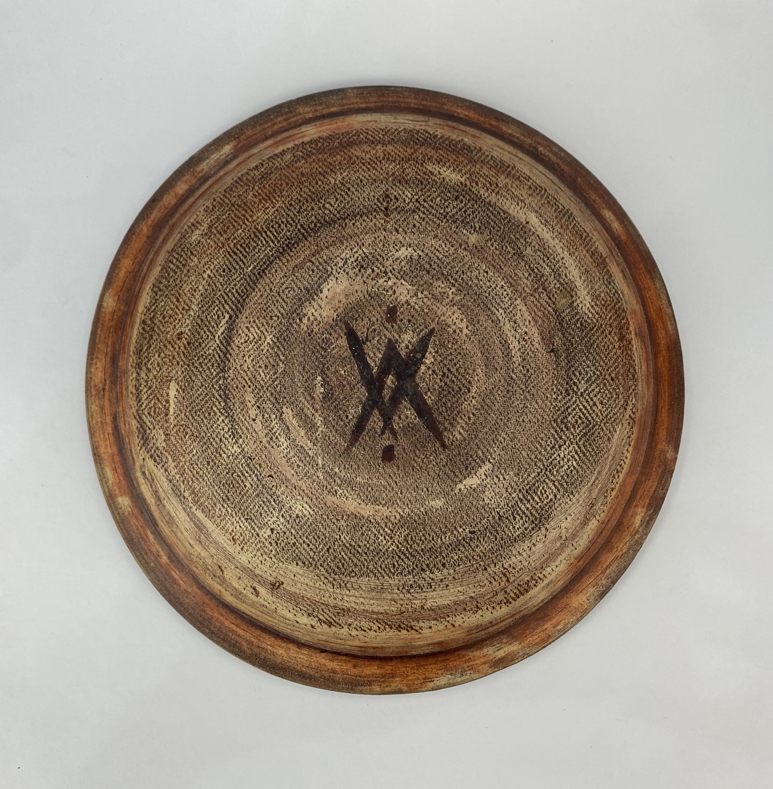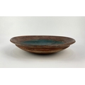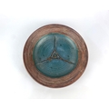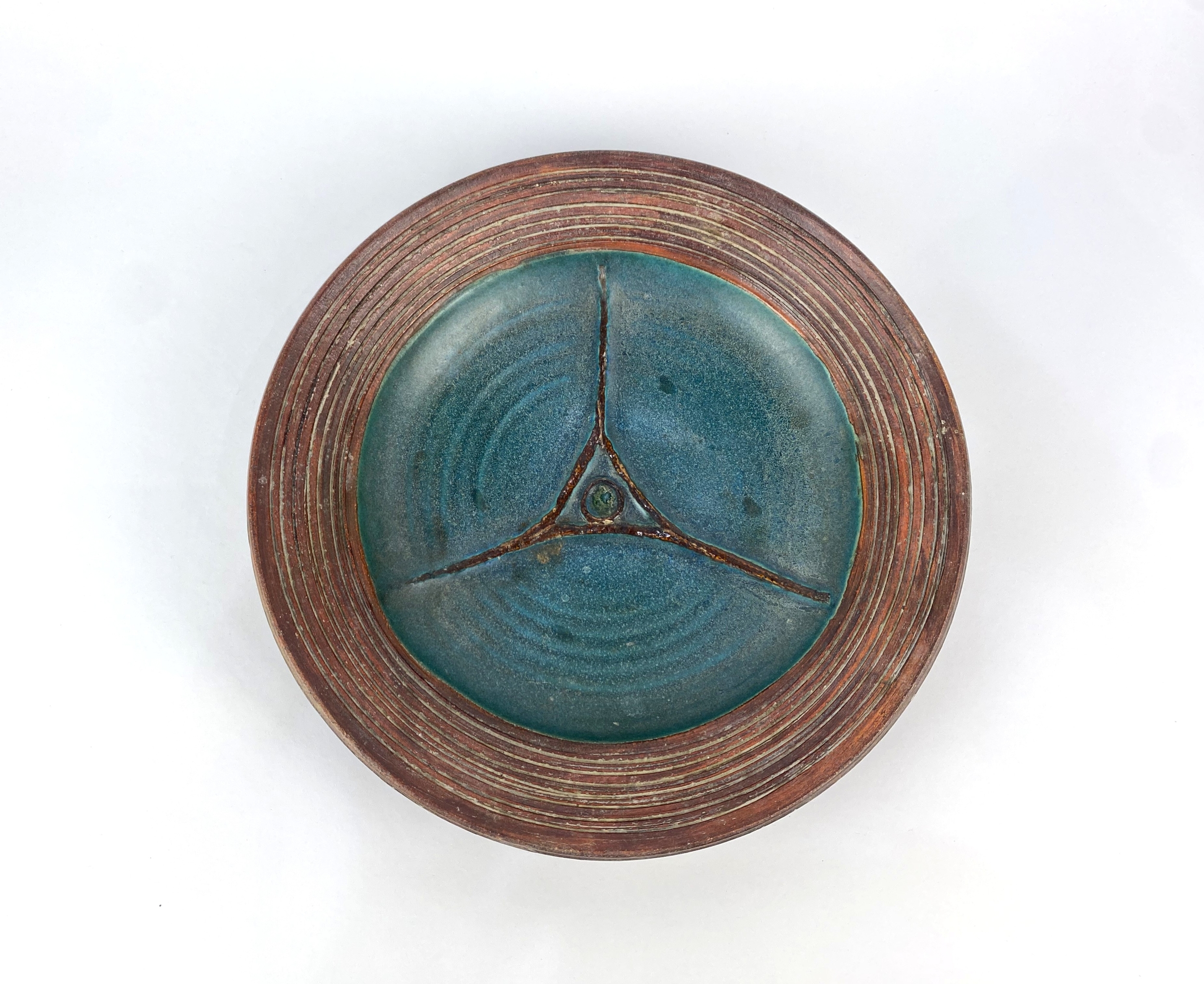 A studio pottery dish, late 20th century, stoneware, with brown and teal coloured glaze, raised geometric motif to centre, monogrammed to base, diameter 30cm