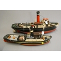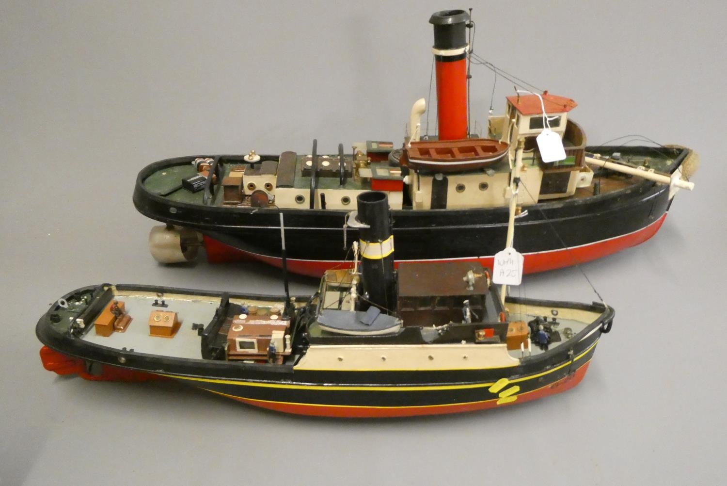 Two Radio controlled harbour tugboats fitted with speed controller and servos, some parts loose, in need of some repairs, fair