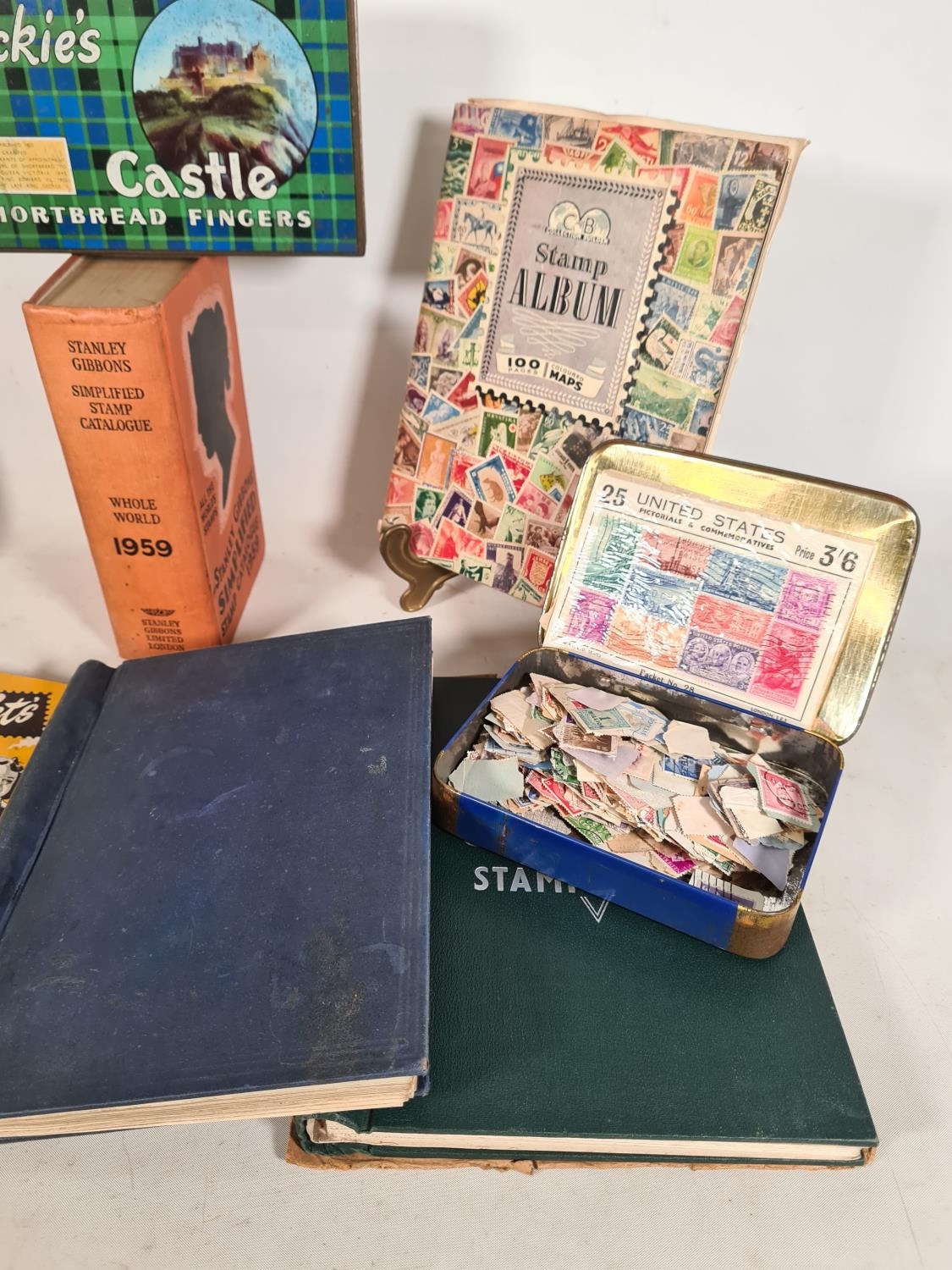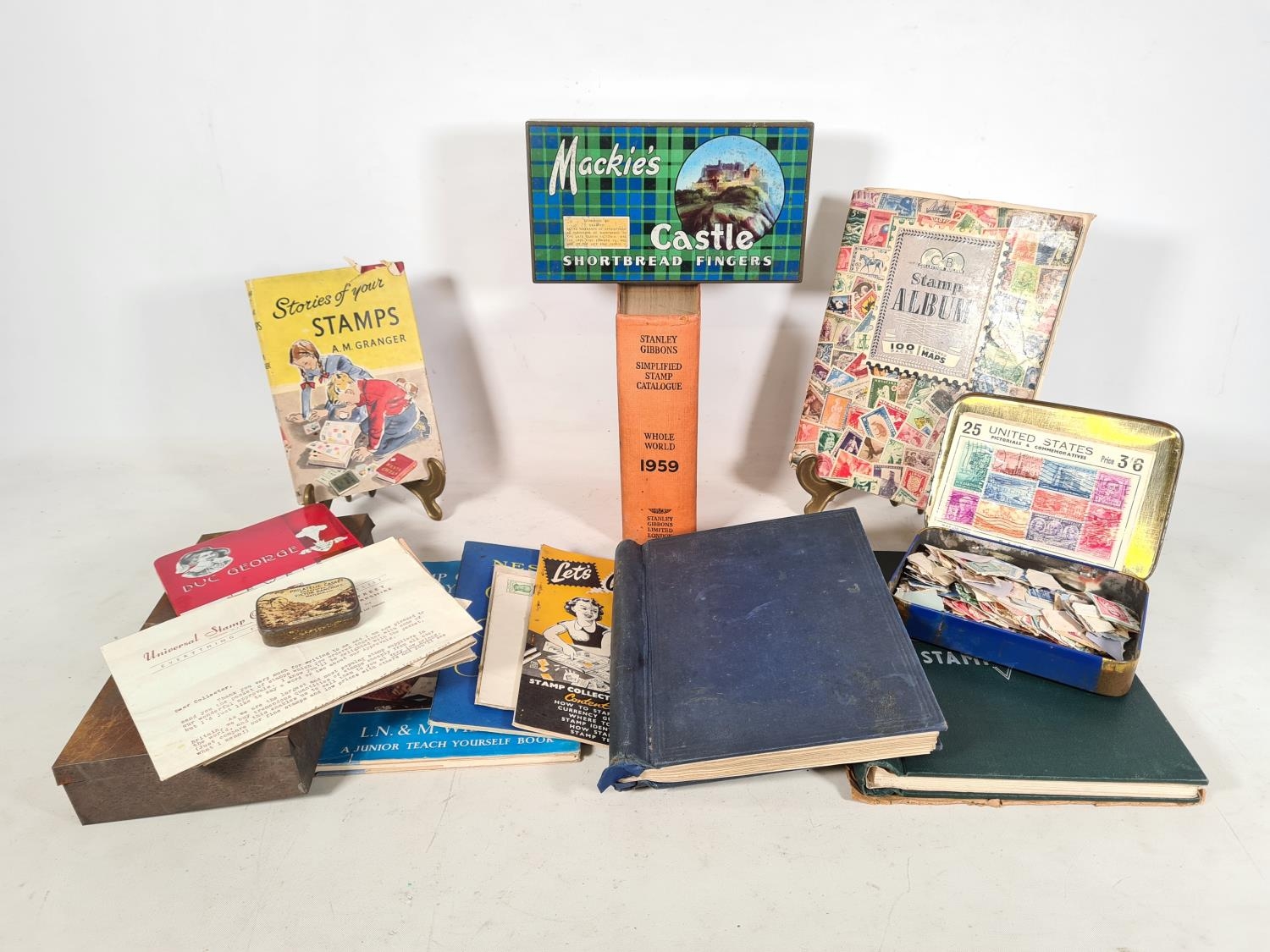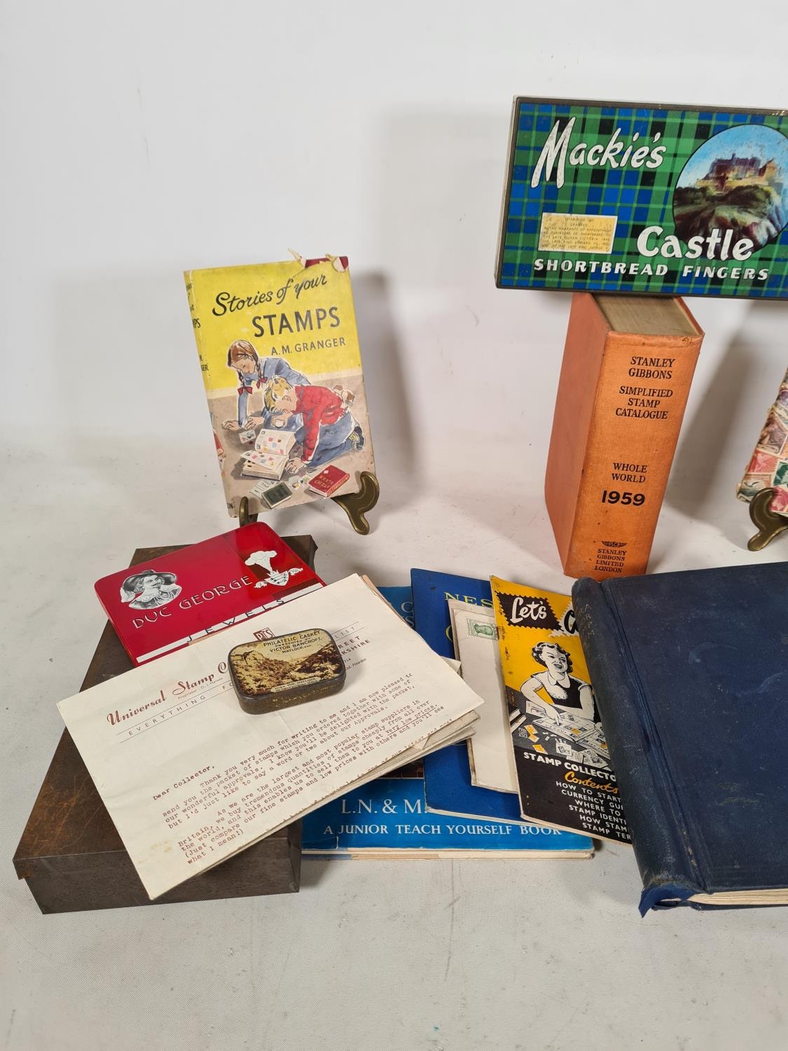 A box containing a large quantity of stamp albums, stamp books and stamp magazines to include 'Stanley Gibbons 1959 Simplified Stamp catalogue', 'Stories of your Stamps', Lets Collect Stamps' etc.