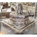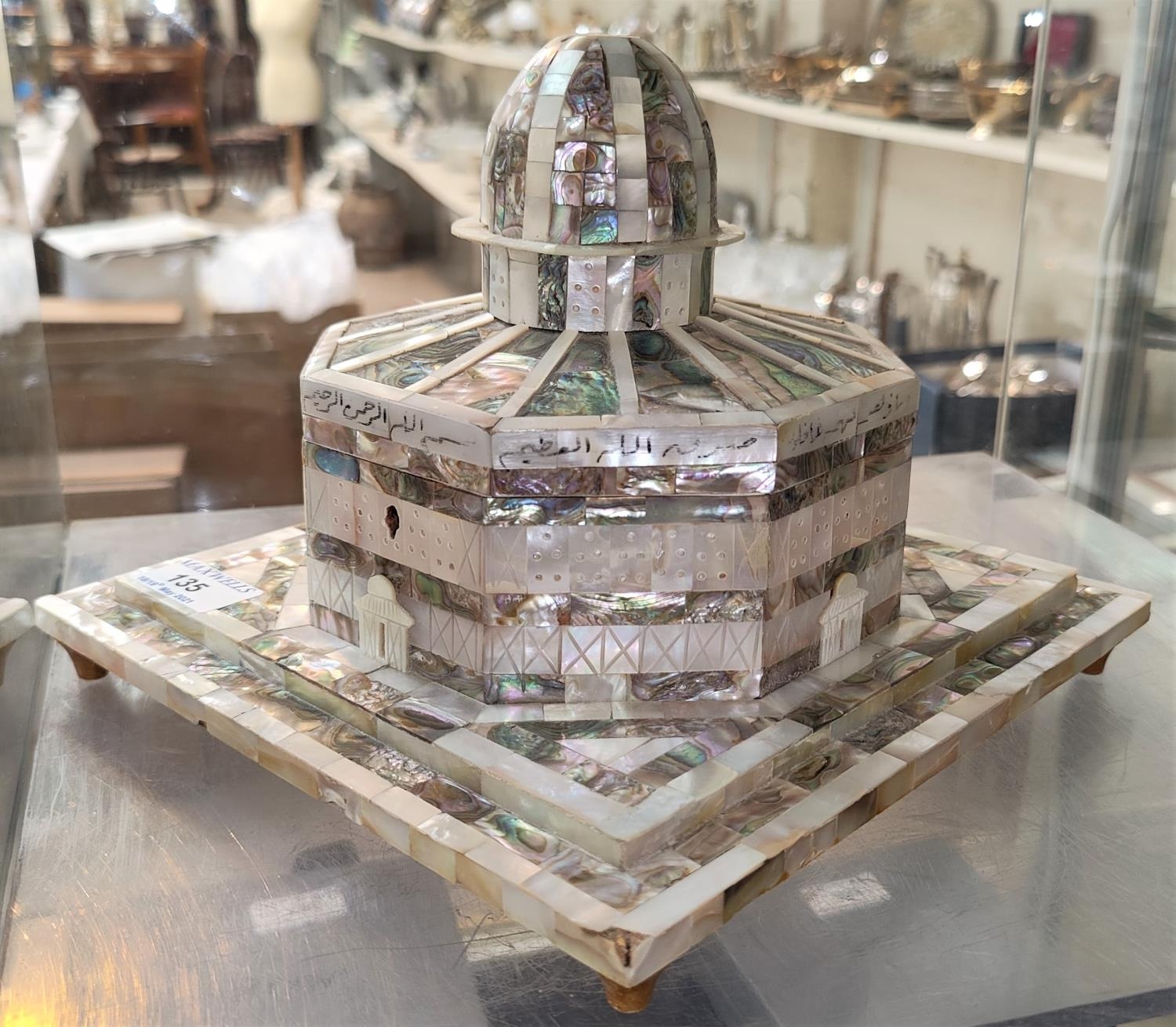 A mother of pear large lidded box in the form of a temple, made up of various small squares, H: 19cm, L:24cm
