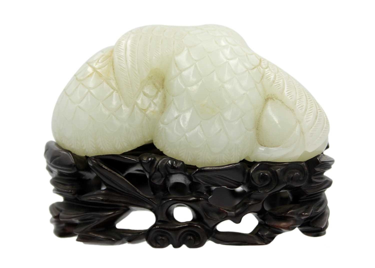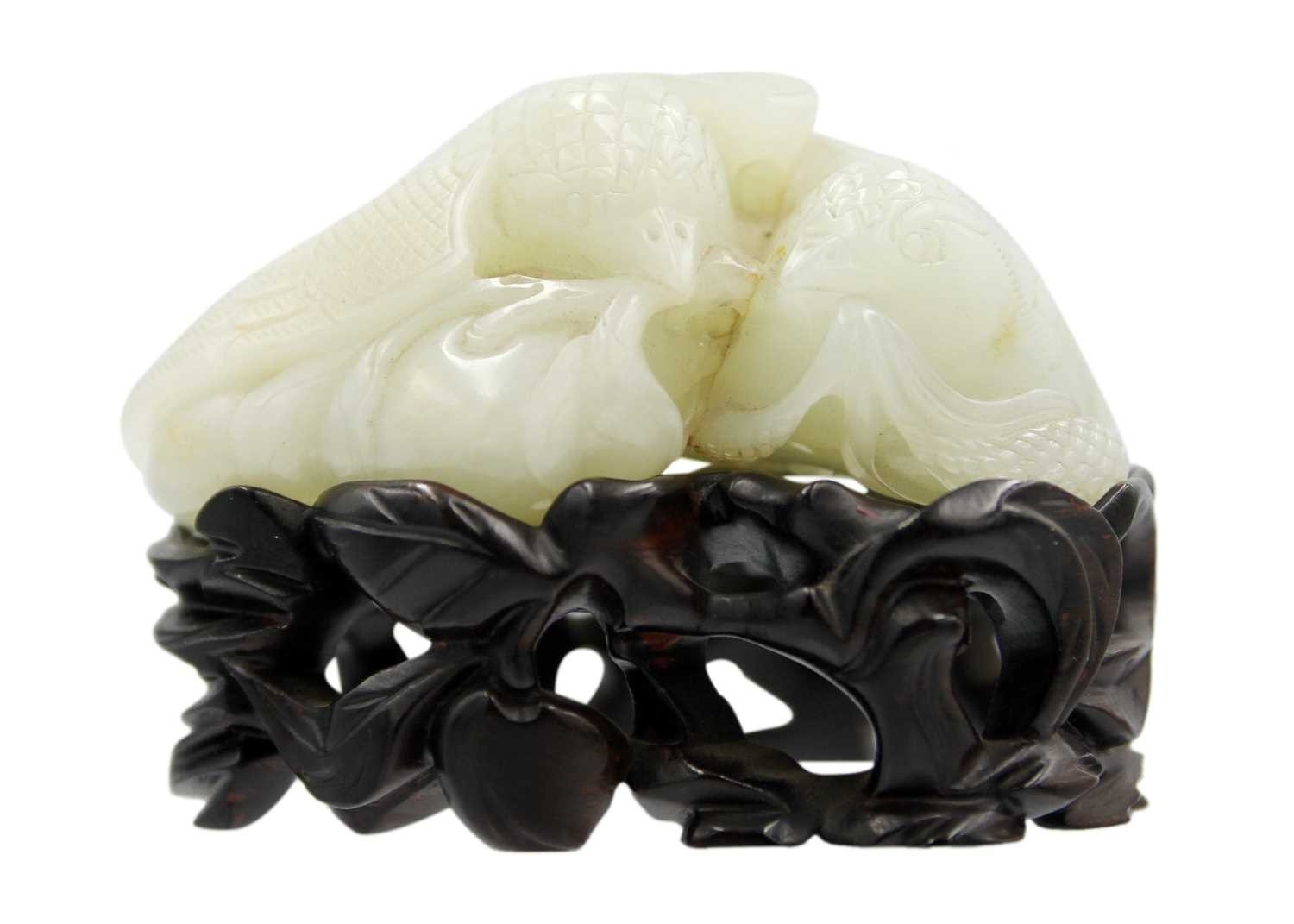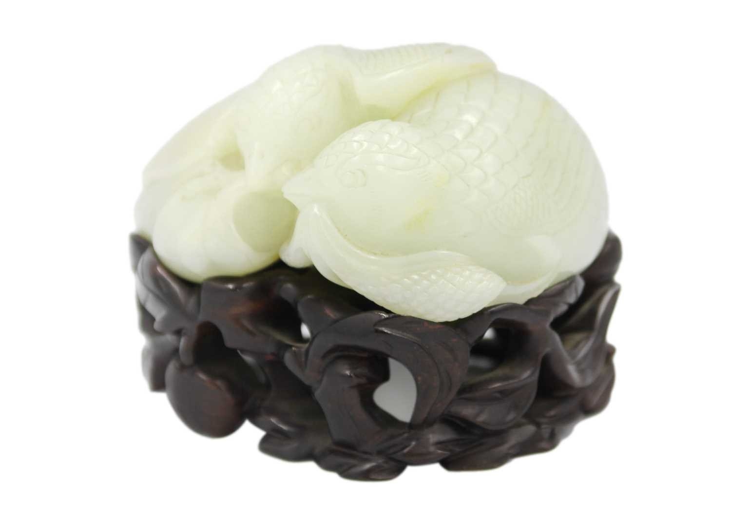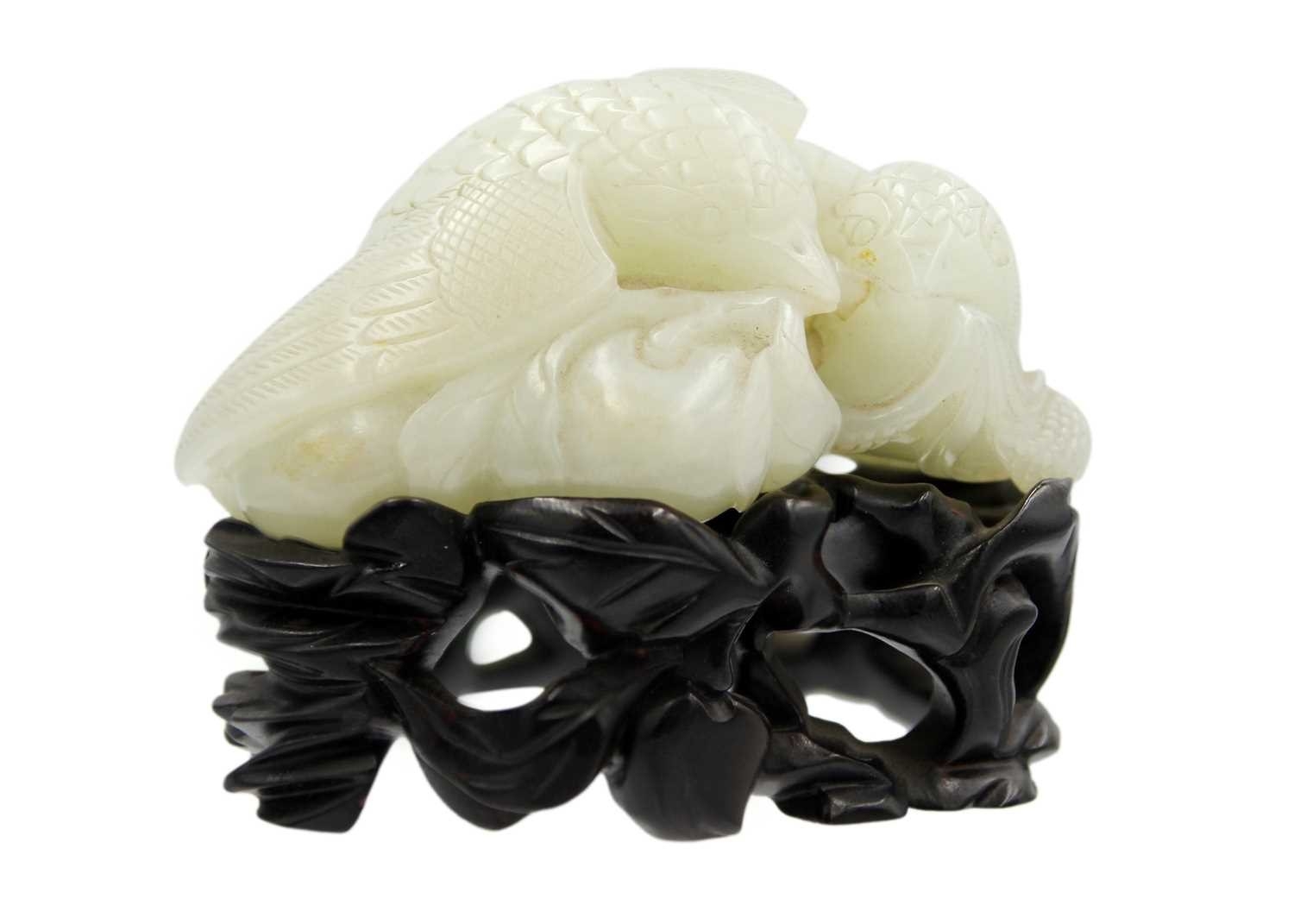 A Chinese carved celadon jade group of quail, Qing Dynasty, 18th/19th century. Jade height 4cm, width 8cm, depth 6.5cm, with fitted carved wood stand, height 2.8cm, width 8.3cm, depth 6.7cm. This exquisite carving has no damage and no restoration.