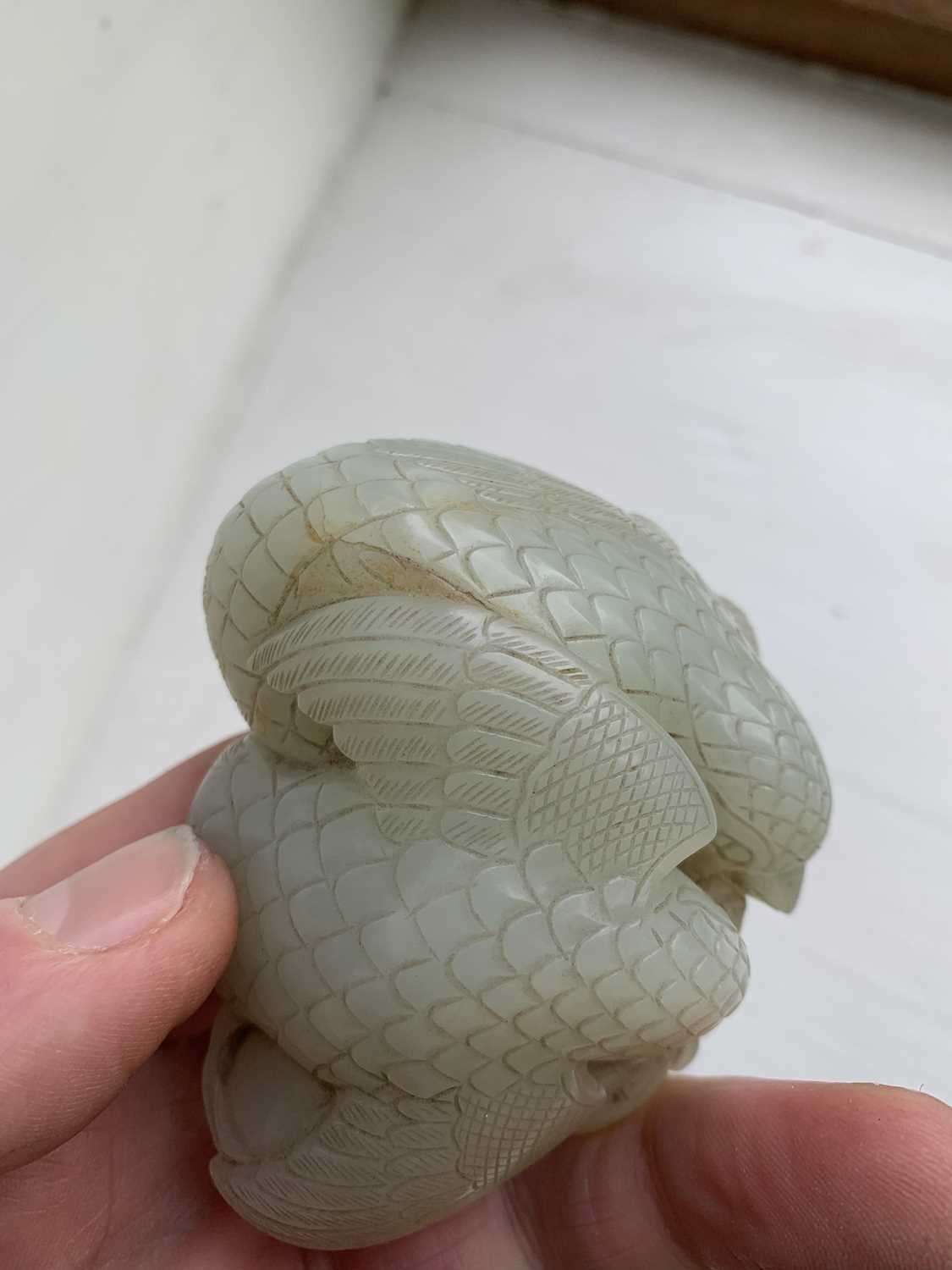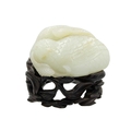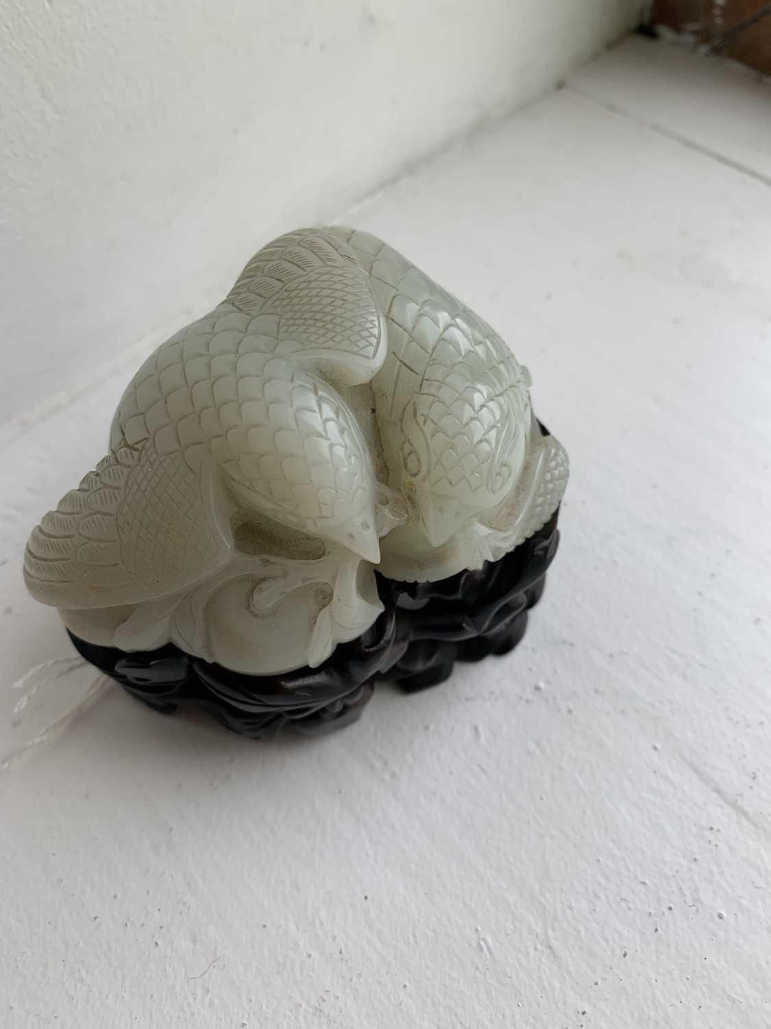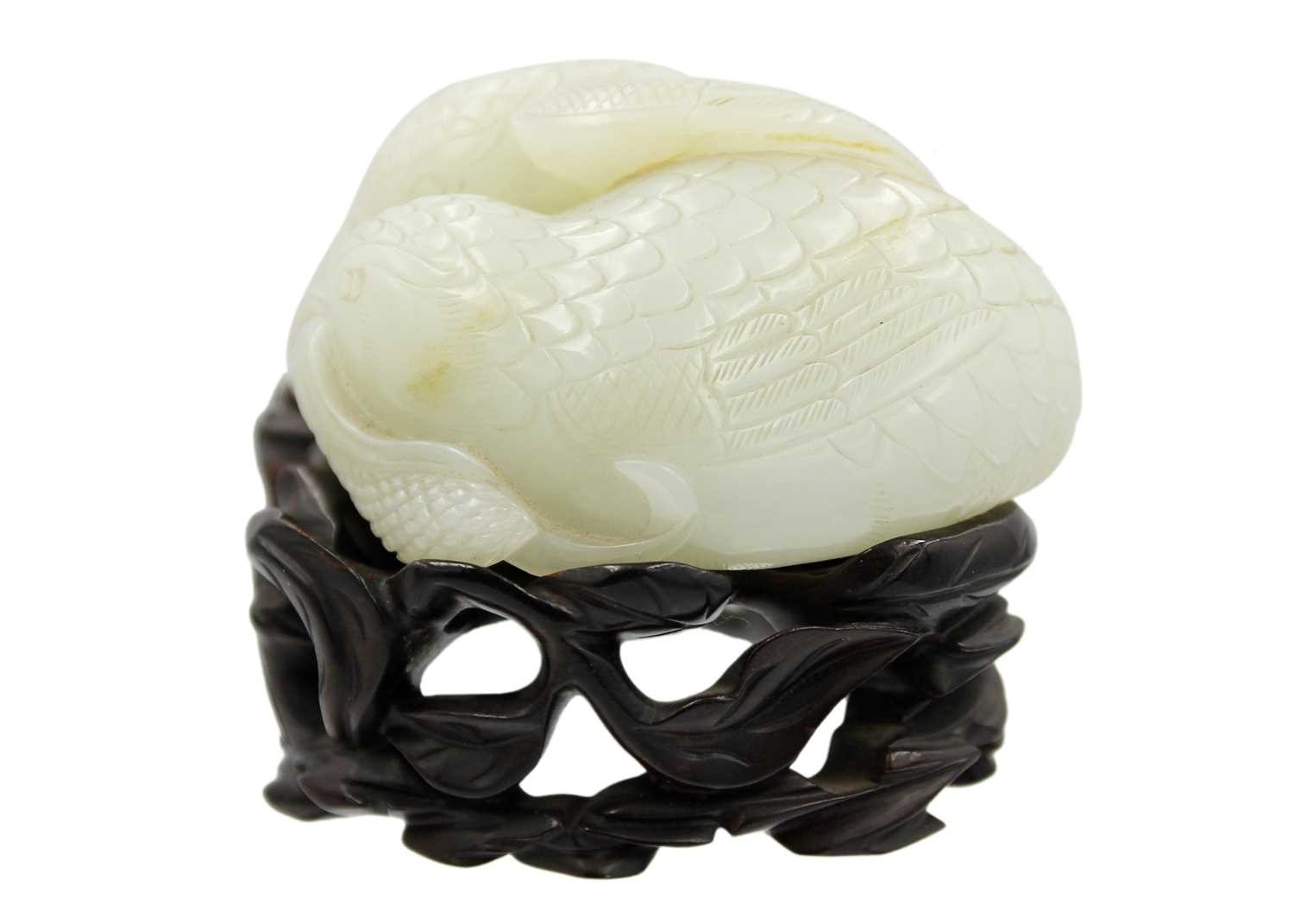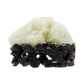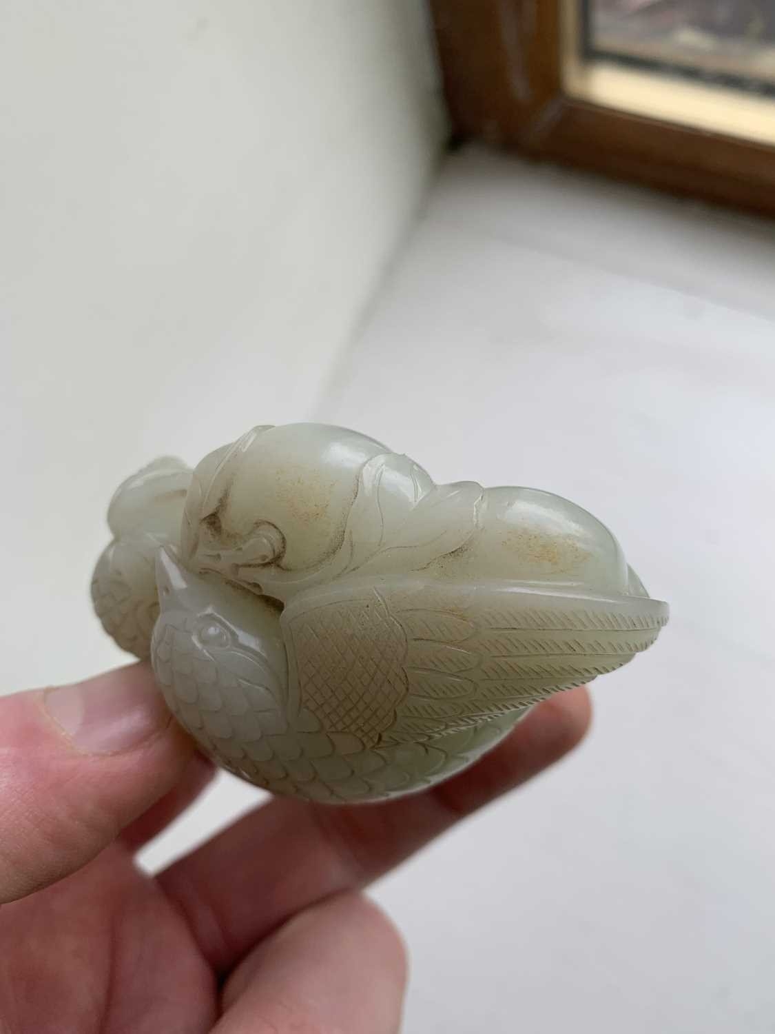 A Chinese carved celadon jade group of quail, Qing Dynasty, 18th/19th century. Jade height 4cm, width 8cm, depth 6.5cm, with fitted carved wood stand, height 2.8cm, width 8.3cm, depth 6.7cm. This exquisite carving has no damage and no restoration.