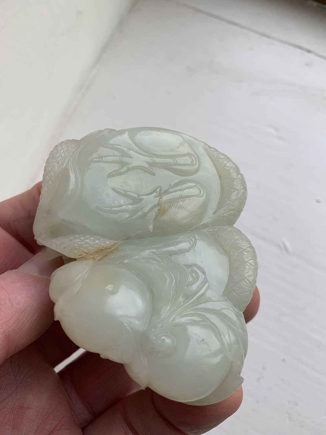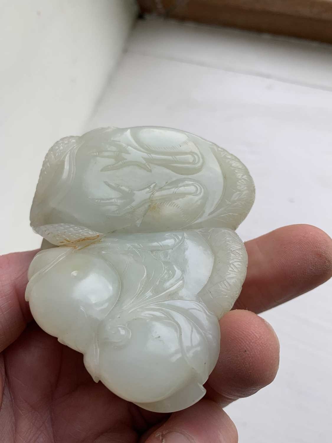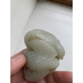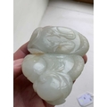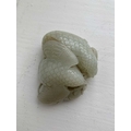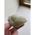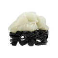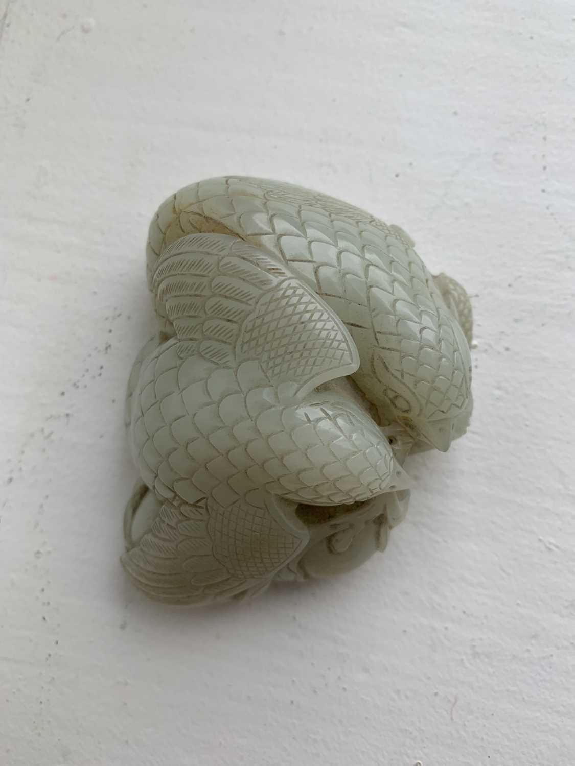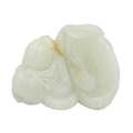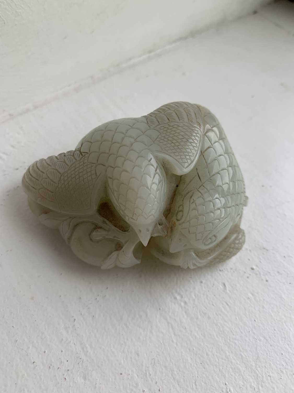 A Chinese carved celadon jade group of quail, Qing Dynasty, 18th/19th century. Jade height 4cm, width 8cm, depth 6.5cm, with fitted carved wood stand, height 2.8cm, width 8.3cm, depth 6.7cm. This exquisite carving has no damage and no restoration.