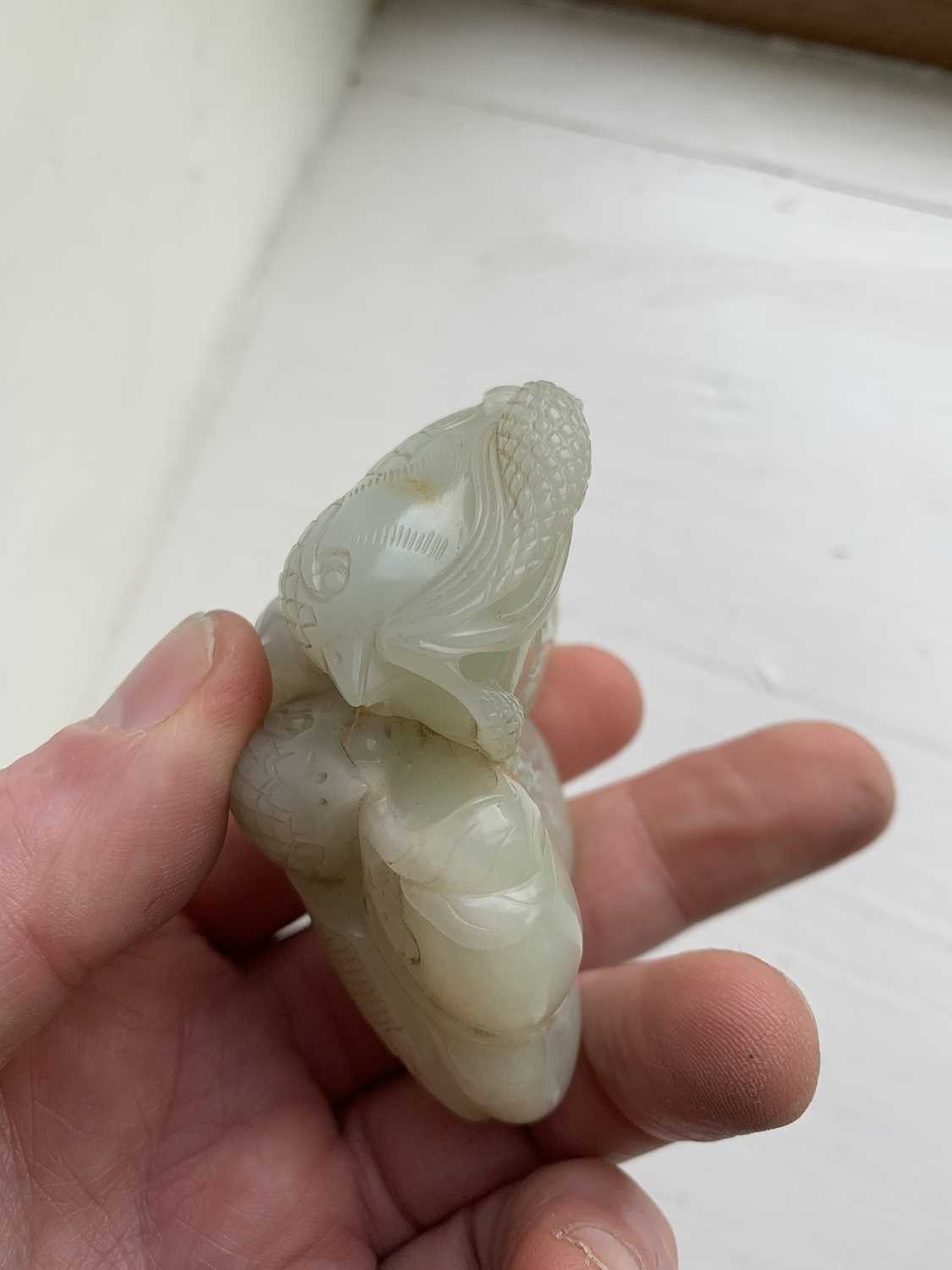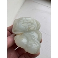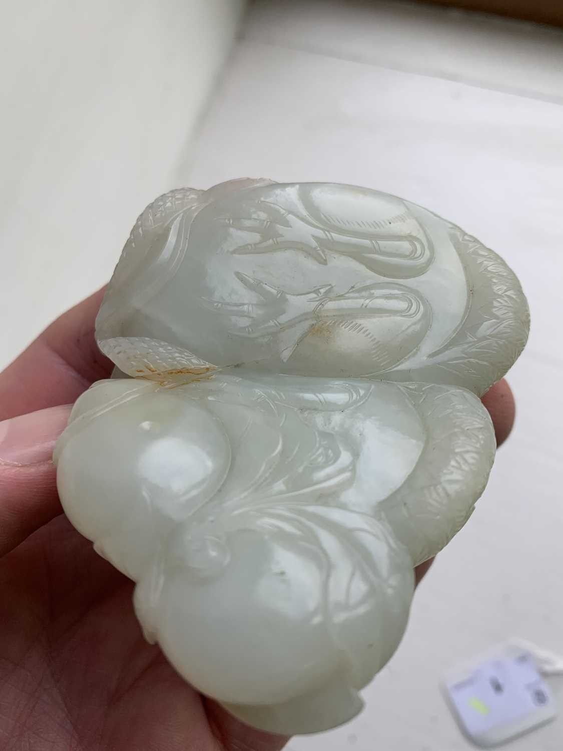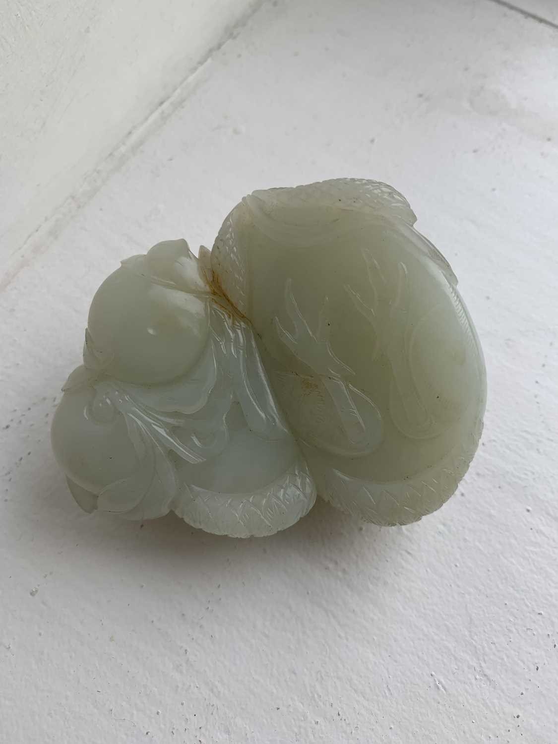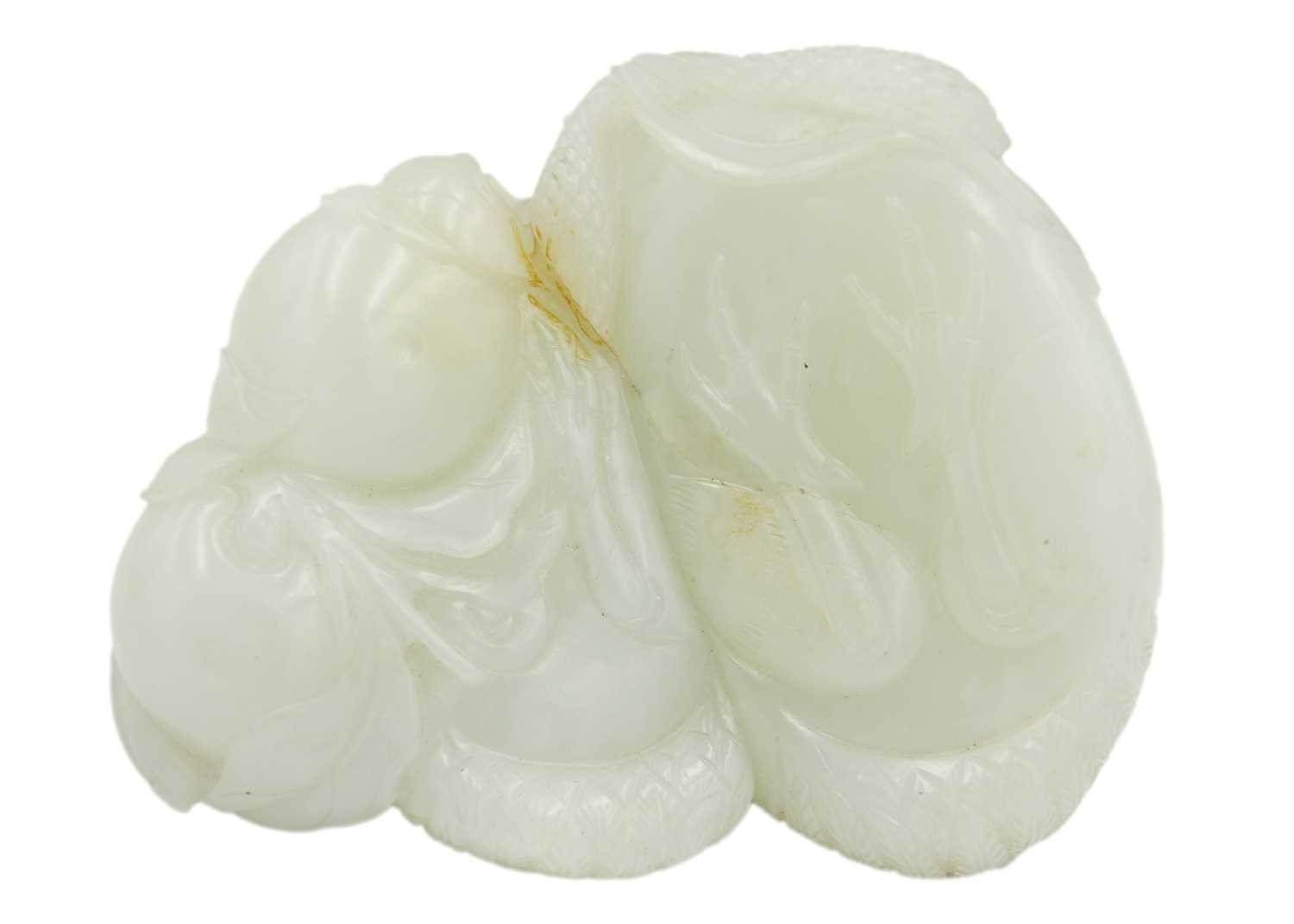 A Chinese carved celadon jade group of quail, Qing Dynasty, 18th/19th century. Jade height 4cm, width 8cm, depth 6.5cm, with fitted carved wood stand, height 2.8cm, width 8.3cm, depth 6.7cm. This exquisite carving has no damage and no restoration.