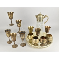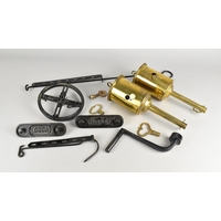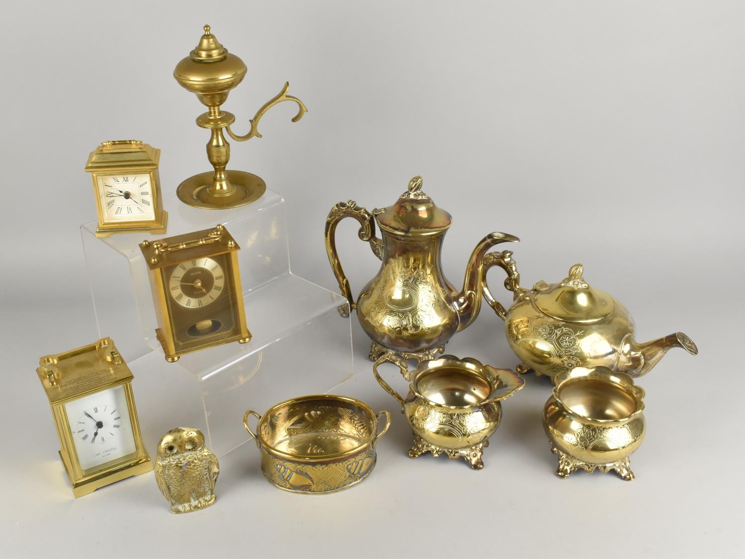 A Collection of Various Metalwares to Comprise Brass Mantle Clocks, Oil Lamp Burner, Four Piece Tea Service etc