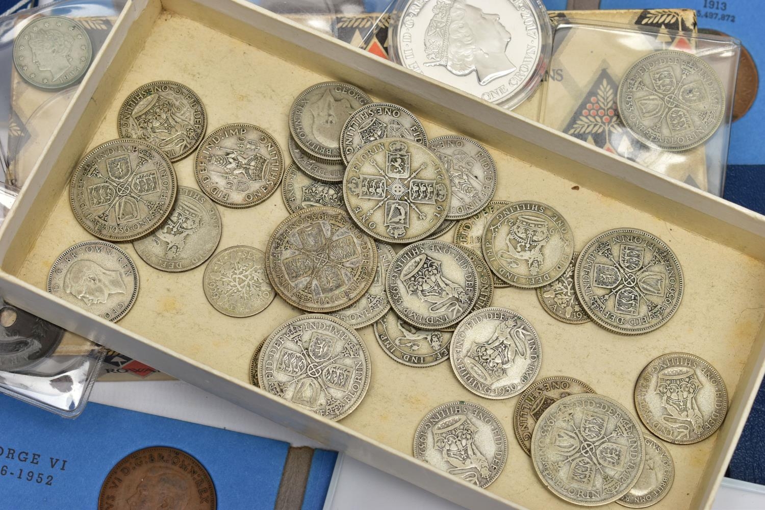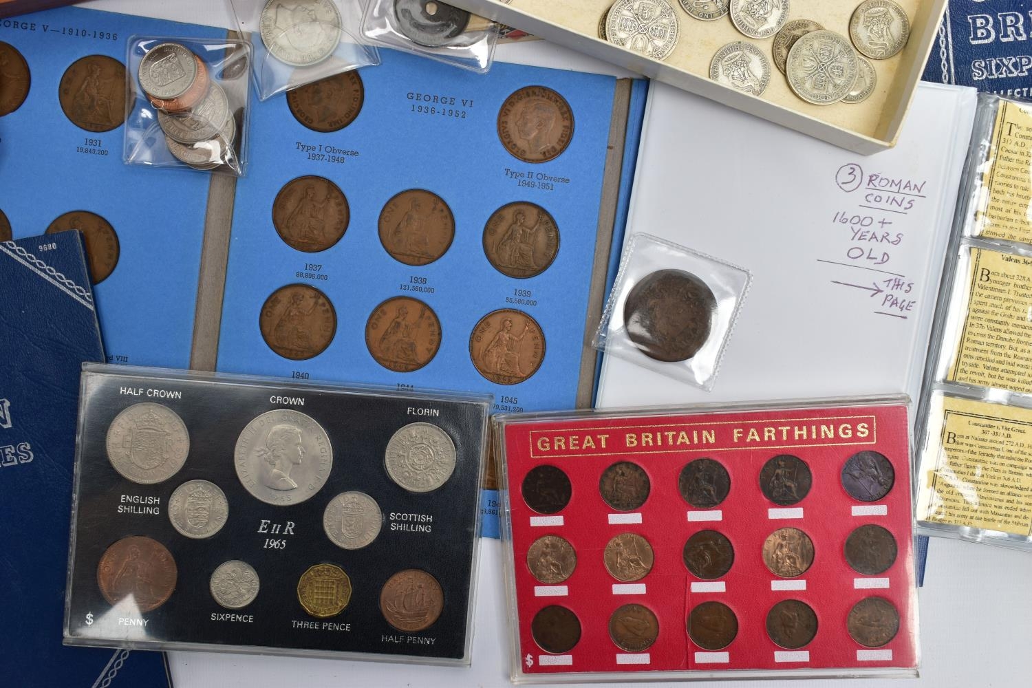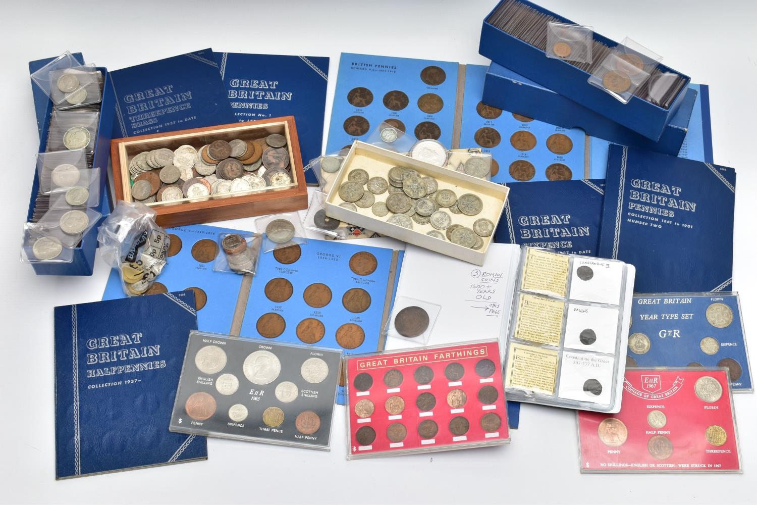A BOX CONTAINING UK AND WORLD COINS, to include several Whitman coin folders Some containing silver content coins, Great Britain year type sets one for 1931, two coindex type holders with silver content coins, a tray of silver content and a Proof Gibraltar Lest we forget crown coin and other oddities, a small Album with three Roman coin each with descriptive cards Constantius II, Valens and Constantine the great etc