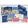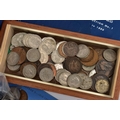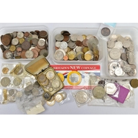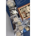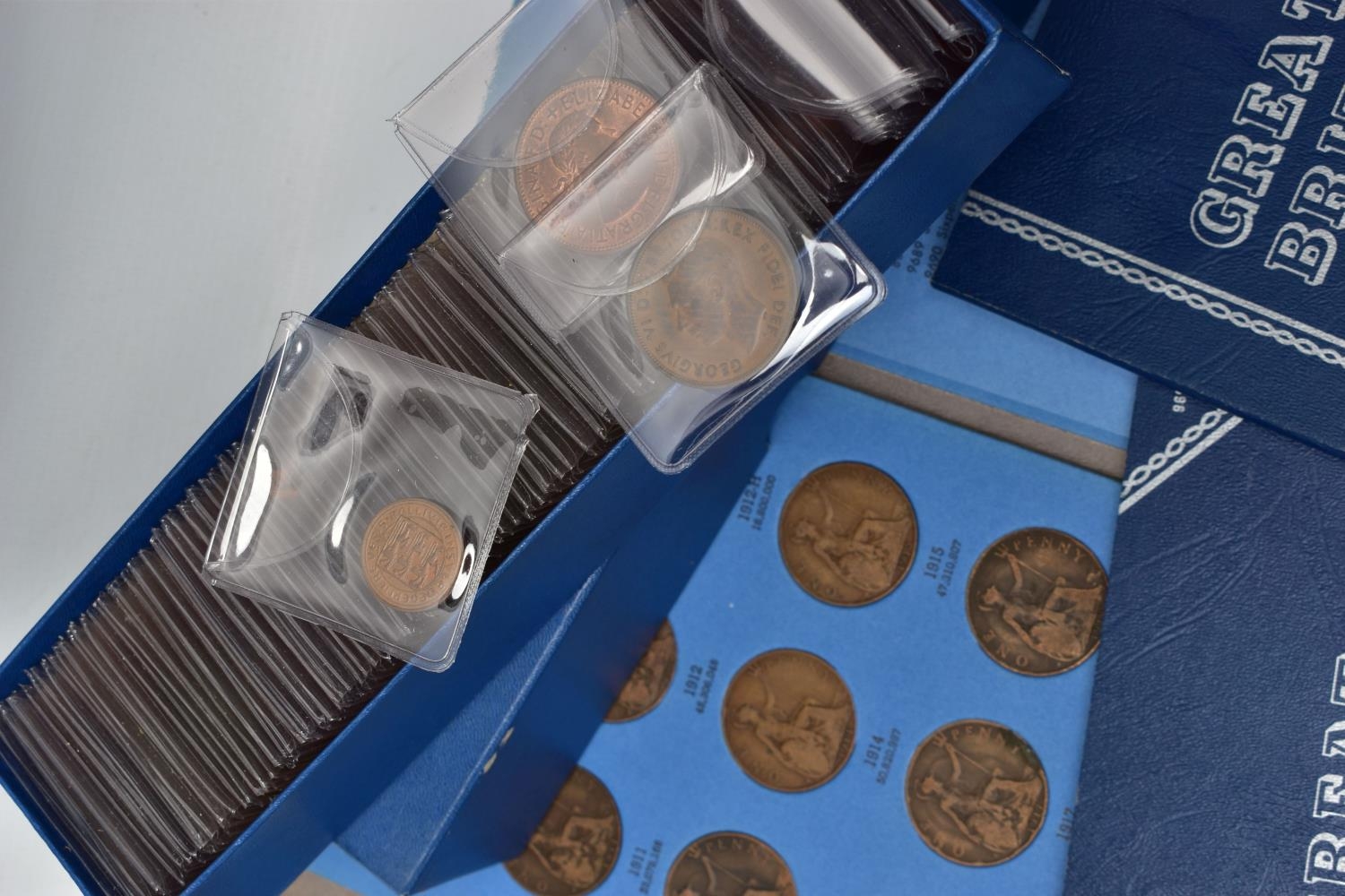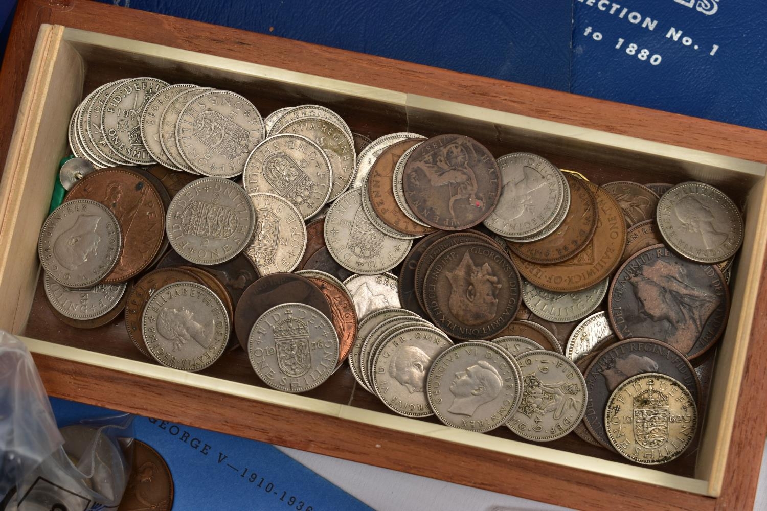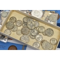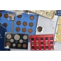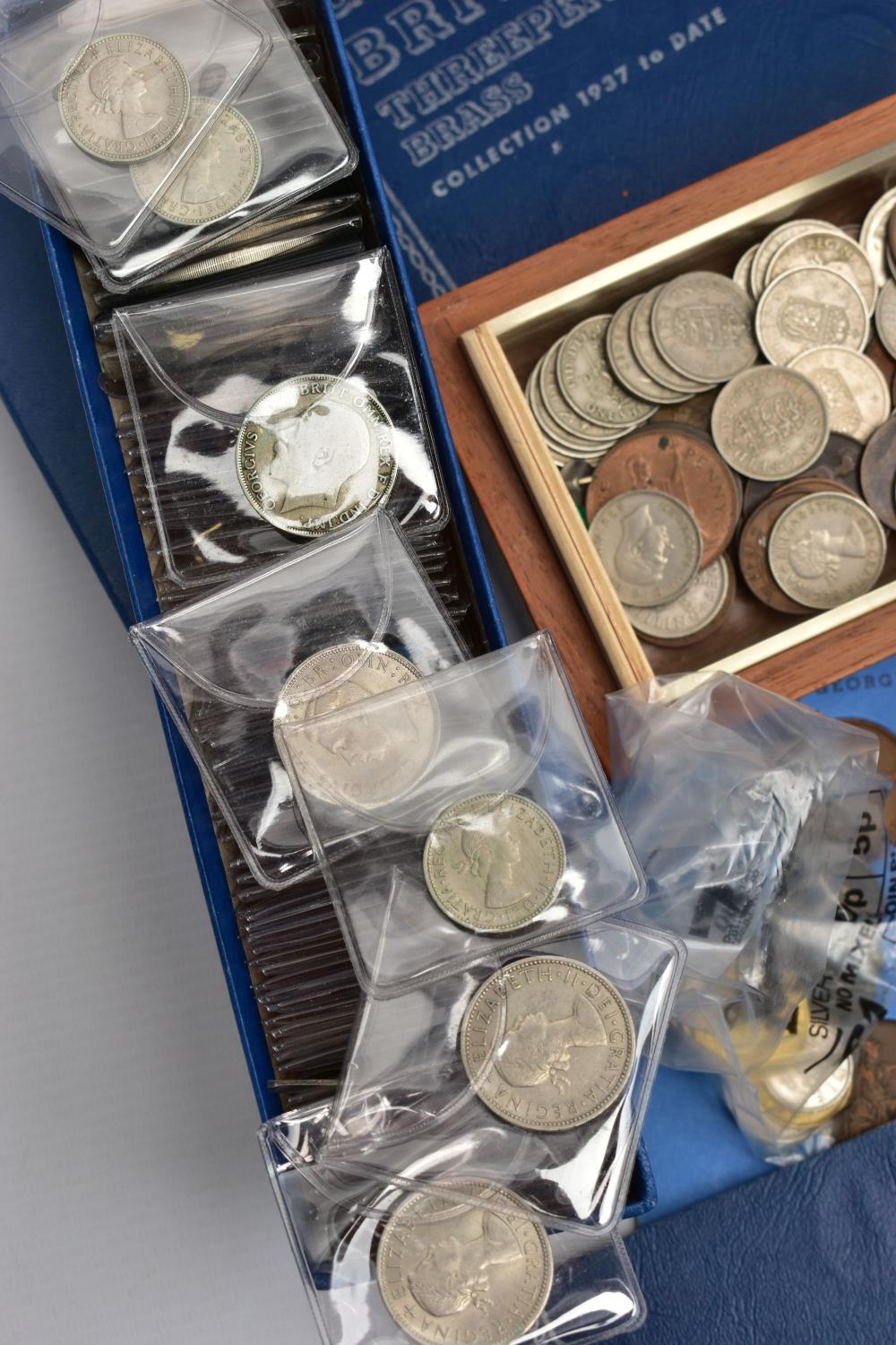 A BOX CONTAINING UK AND WORLD COINS, to include several Whitman coin folders Some containing silver content coins, Great Britain year type sets one for 1931, two coindex type holders with silver content coins, a tray of silver content and a Proof Gibraltar Lest we forget crown coin and other oddities, a small Album with three Roman coin each with descriptive cards Constantius II, Valens and Constantine the great etc