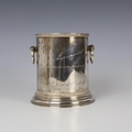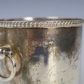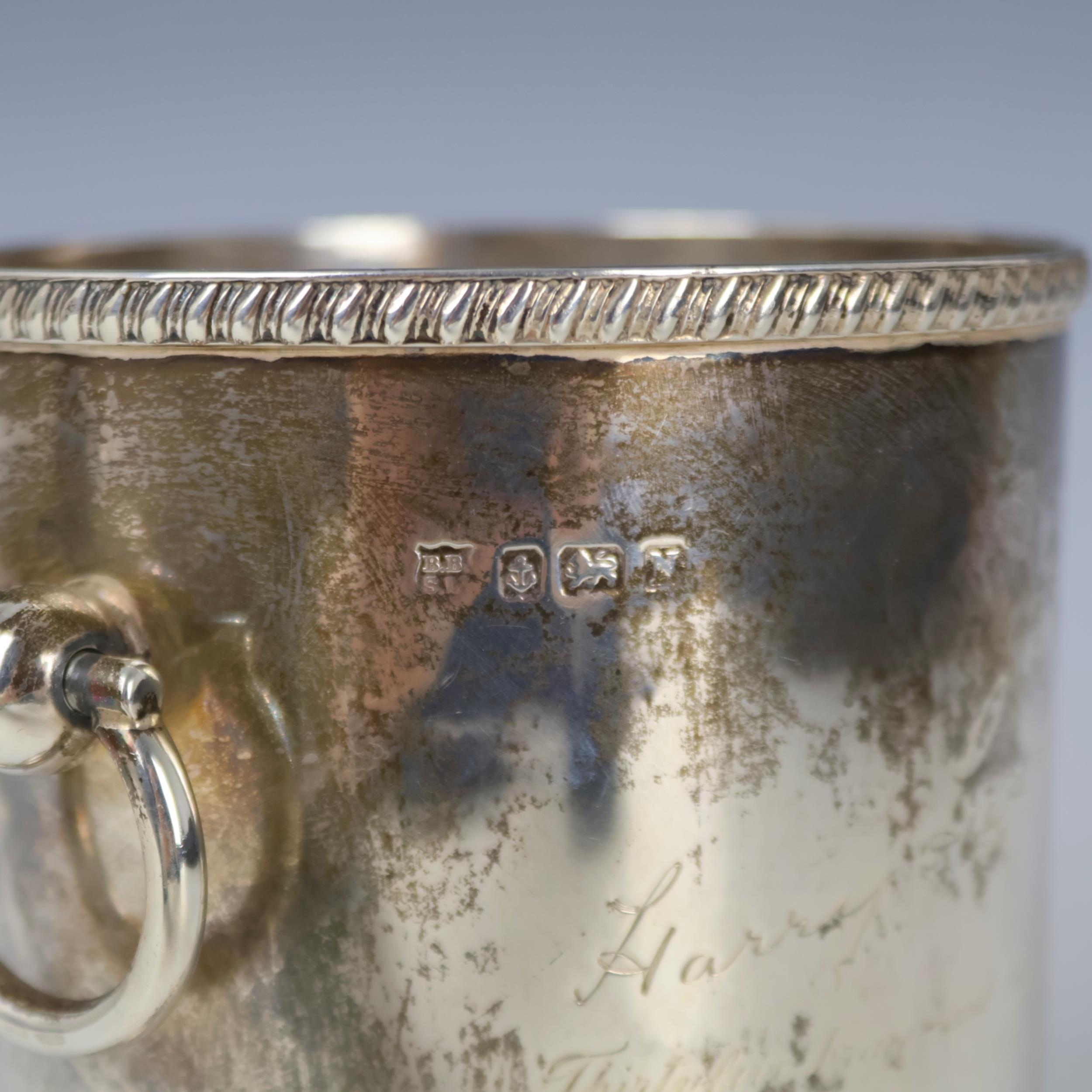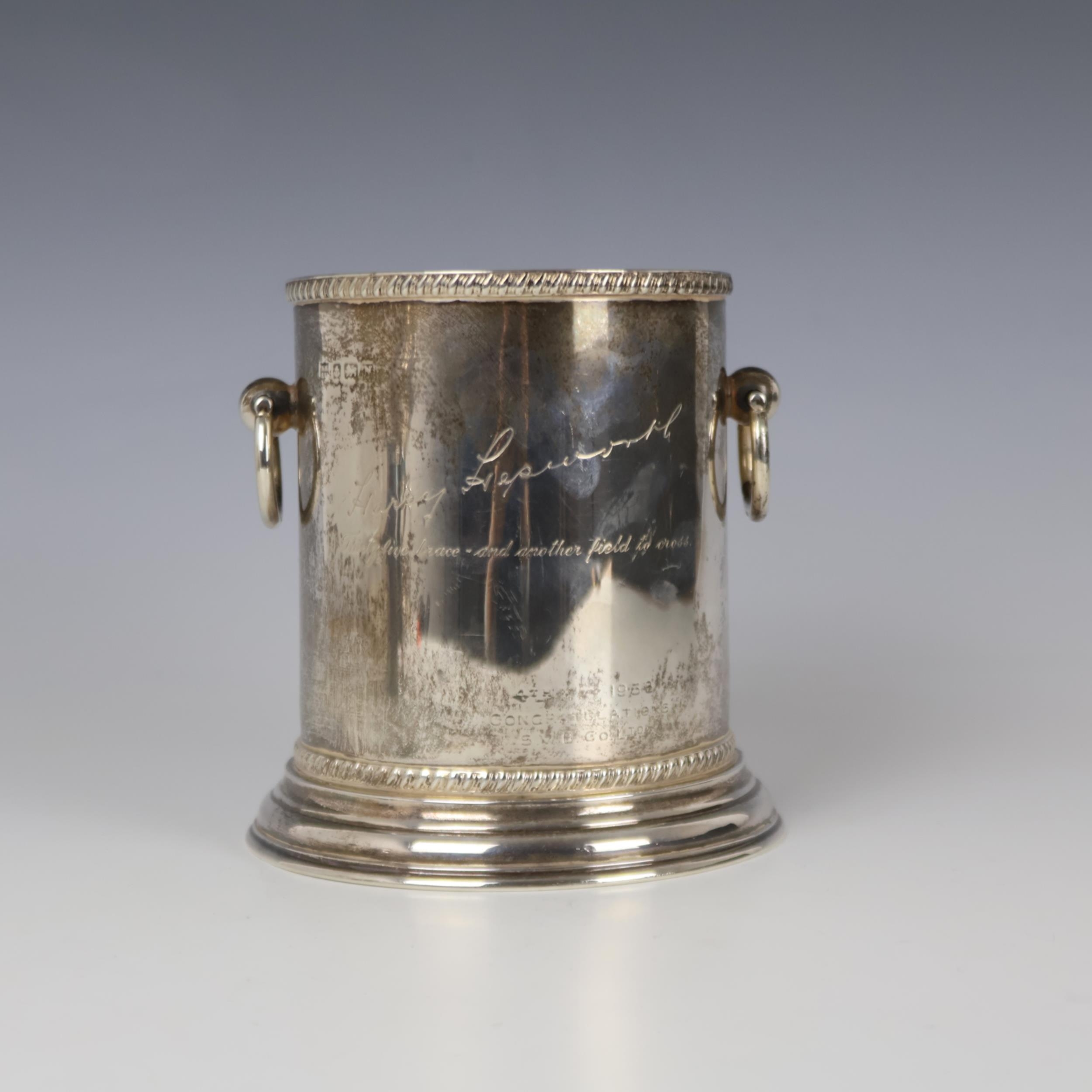 A George VI silver bottle holder/sleeve, Barker Brothers Silver Ltd, Birmingham 1937, the gadrooned rim above cylindrical body with presentation engraving, upon spreading circular base, 15cm high, 15ozt